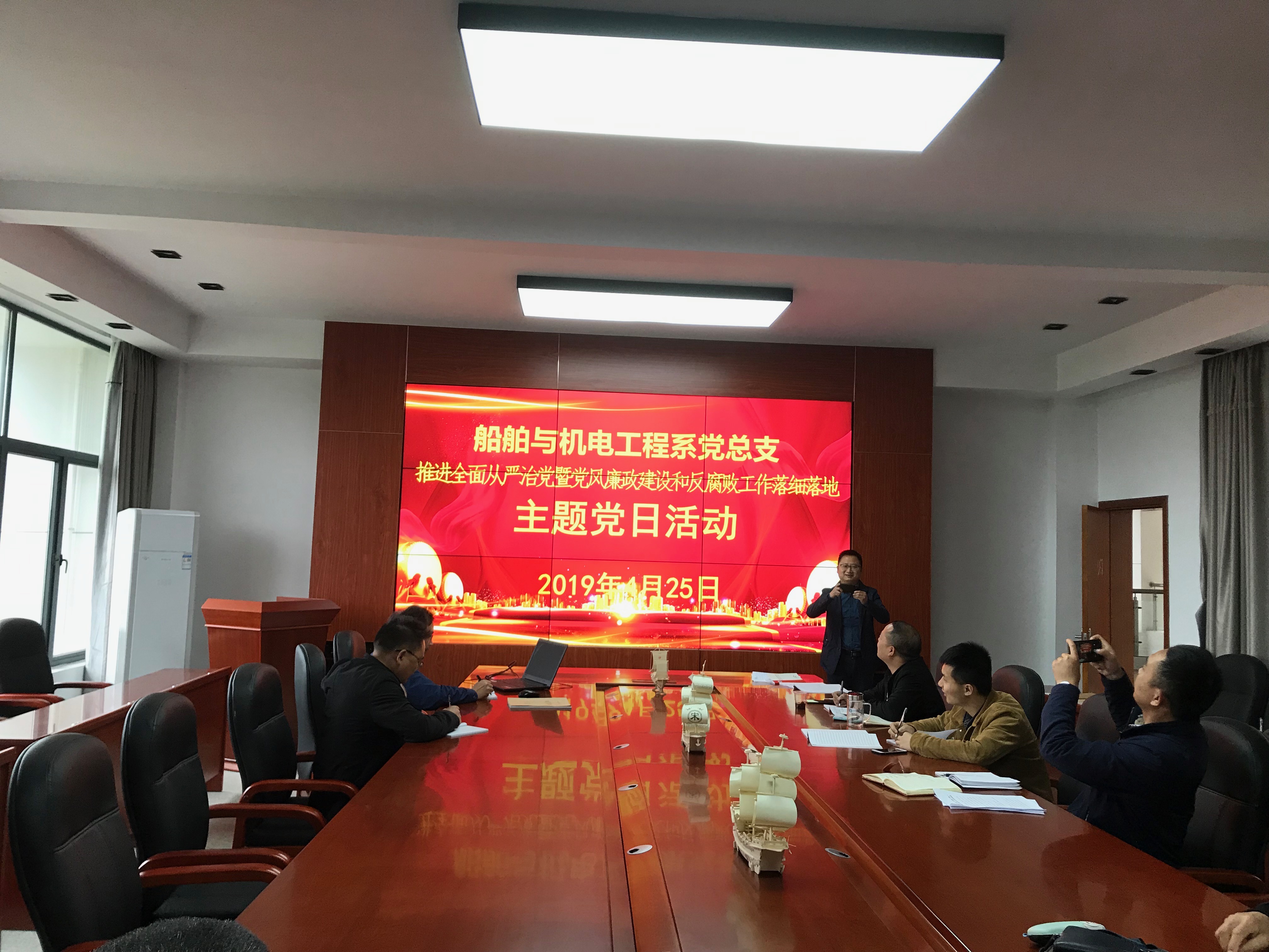 4月25日下午,船舶与机电工程系开展了4月份支部主题党日活动,围绕“推进全面从严治党暨党风廉政建设和反腐败工作落细落地”主题,学习了《习近平总书记论作风建设: 以踏石留印、 抓铁有痕的劲头抓作风建设》和《如何落实全面从严治党》,学习了习近平总书记系列重要讲话。