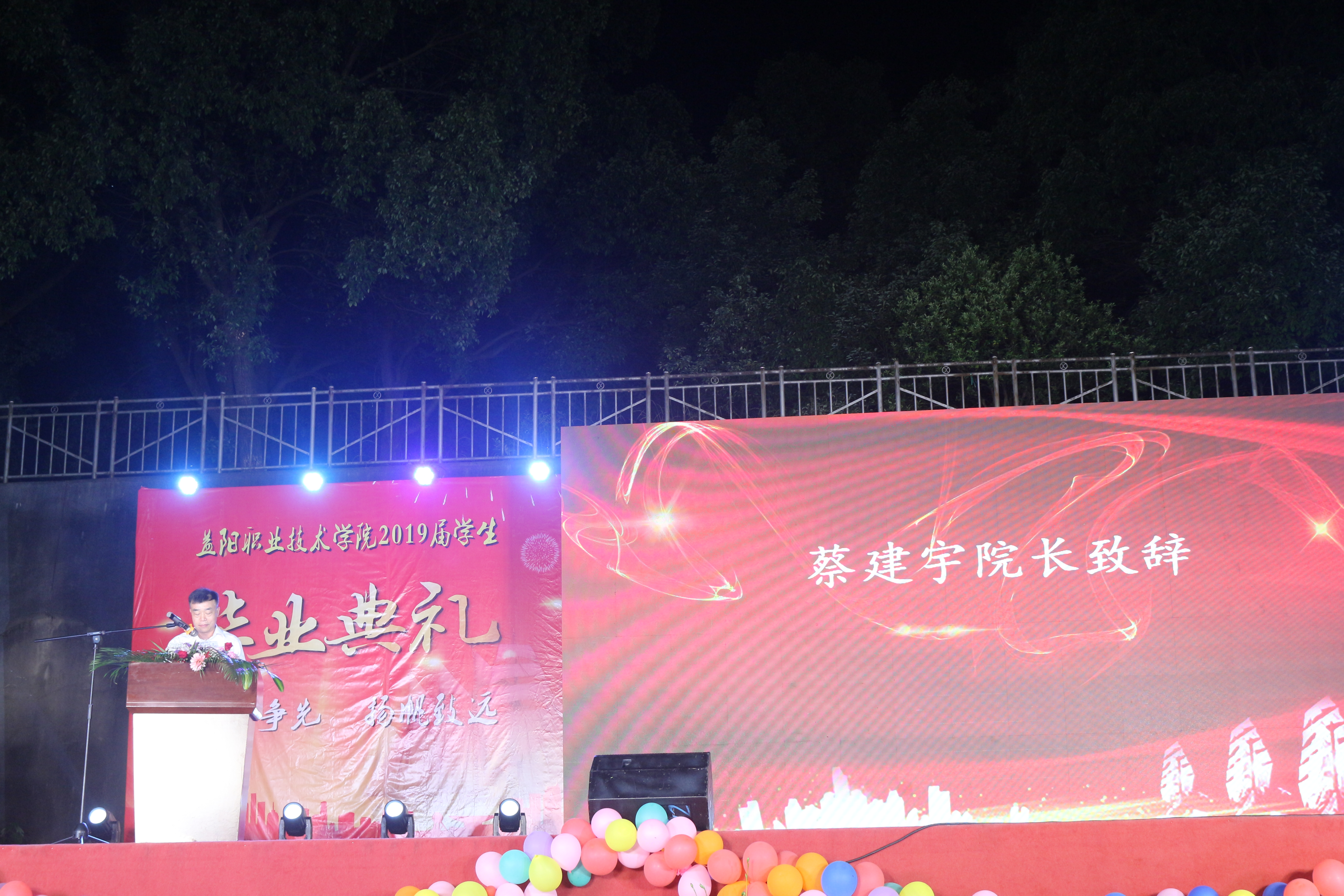 5月27日晚,益阳职业技术学院于学院篮球场的露天舞台成功举行了2019届学生毕业典礼。参加本次毕业典礼的嘉宾有学院党委书记谢梅成、院长蔡建宇,院党委副书记张建安、纪委书记周凤仙、副院长蔡超强、副院长吴自力、工会主席曾立波以及各部门负责人、学工系统全体教师、部分教室代表、优秀毕业生家长代表、在校学生代表和部分企业嘉宾。典礼由老师罗景、谢旑主持。