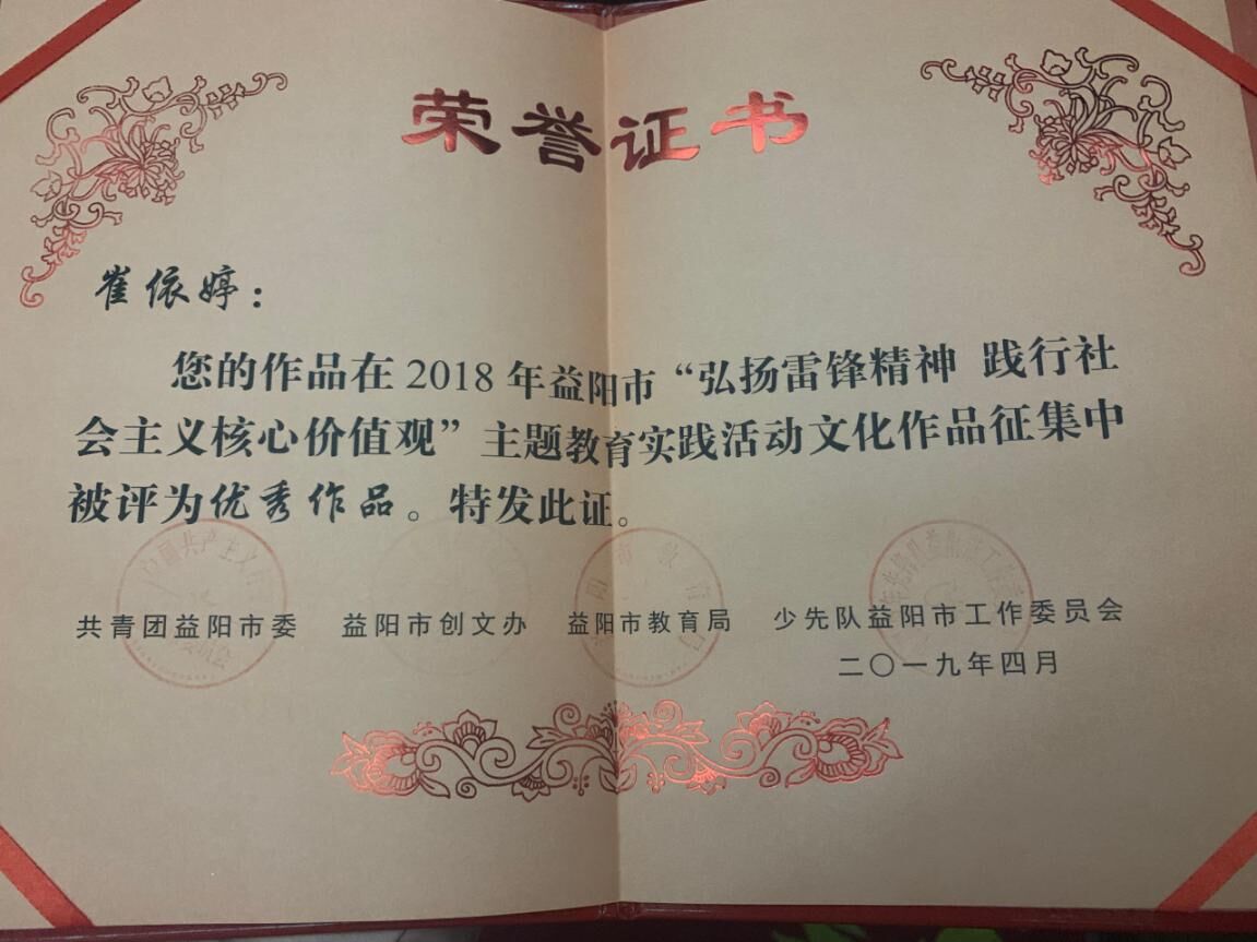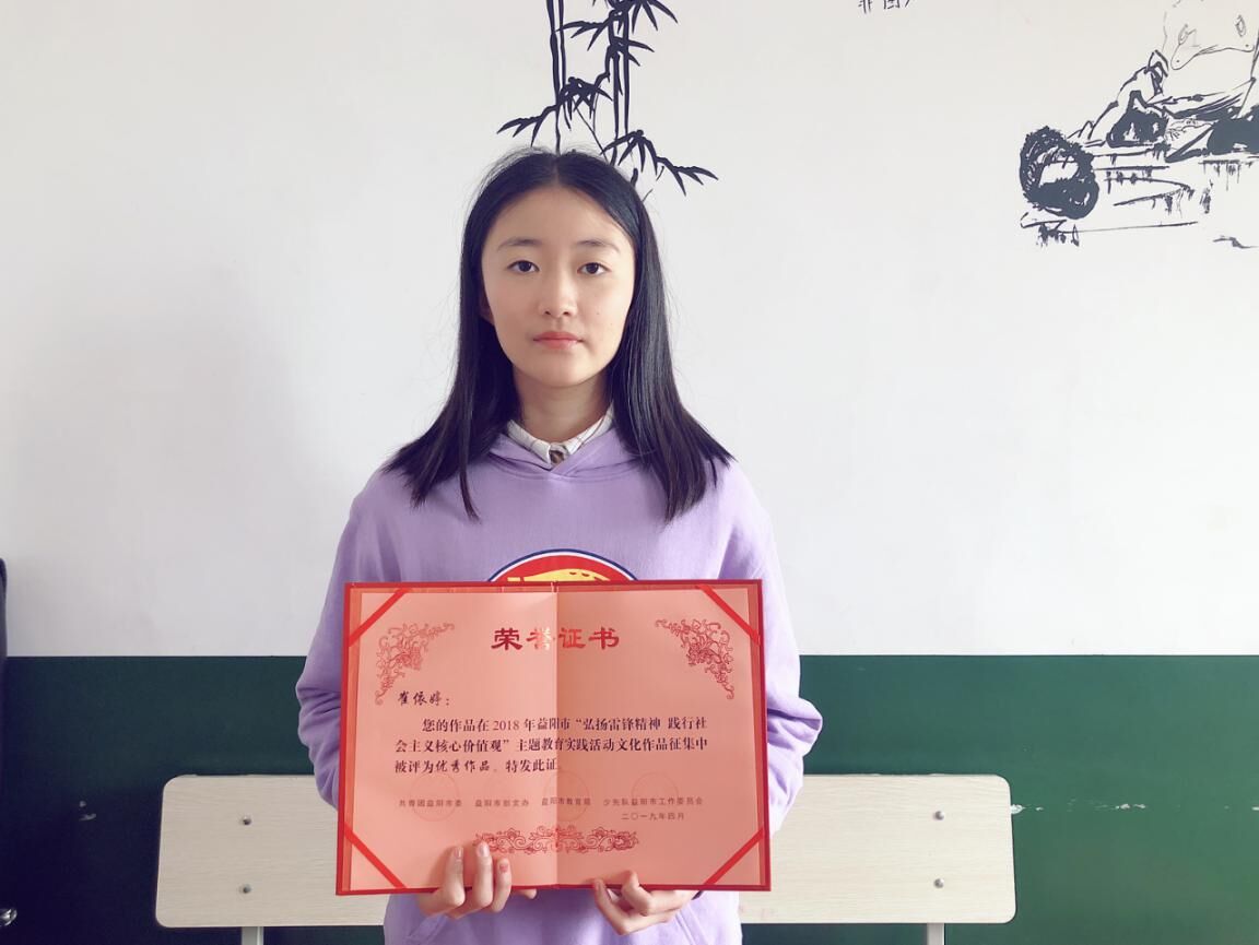 中职部会计16201班团支书崔依婷同学,寒假期间在微博头条文章《学雷锋,我们在行动》(作者:益阳职业技术学院 蔡伟老师)中留言:“作为一名00后,对雷锋事迹早已耳熟能详,他伴随着我们的成长,他似乎成了乐于助人的代名词,每次提起雷锋,心中总是会肃然起敬。我认为,继承与发扬雷锋精神,是每一个有责任感的青少年应该承担的责任,少年强则国强,做一名品德高尚的大学生,我们正在用我们的实际行动,让雷锋精神重焕新时代的光辉灿烂。”该条评论在大讨论留言评奖环节,成功通过初选、复选,最终在2018年益阳市“弘扬雷锋精神,践行社会主义核心价值观”主题教育实践活动文化作品征集中被评为优秀作品,并获荣誉证书和奖金100元。