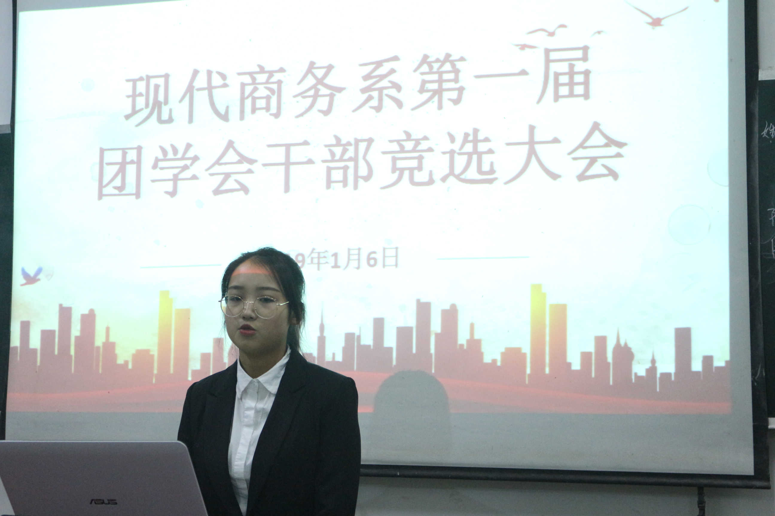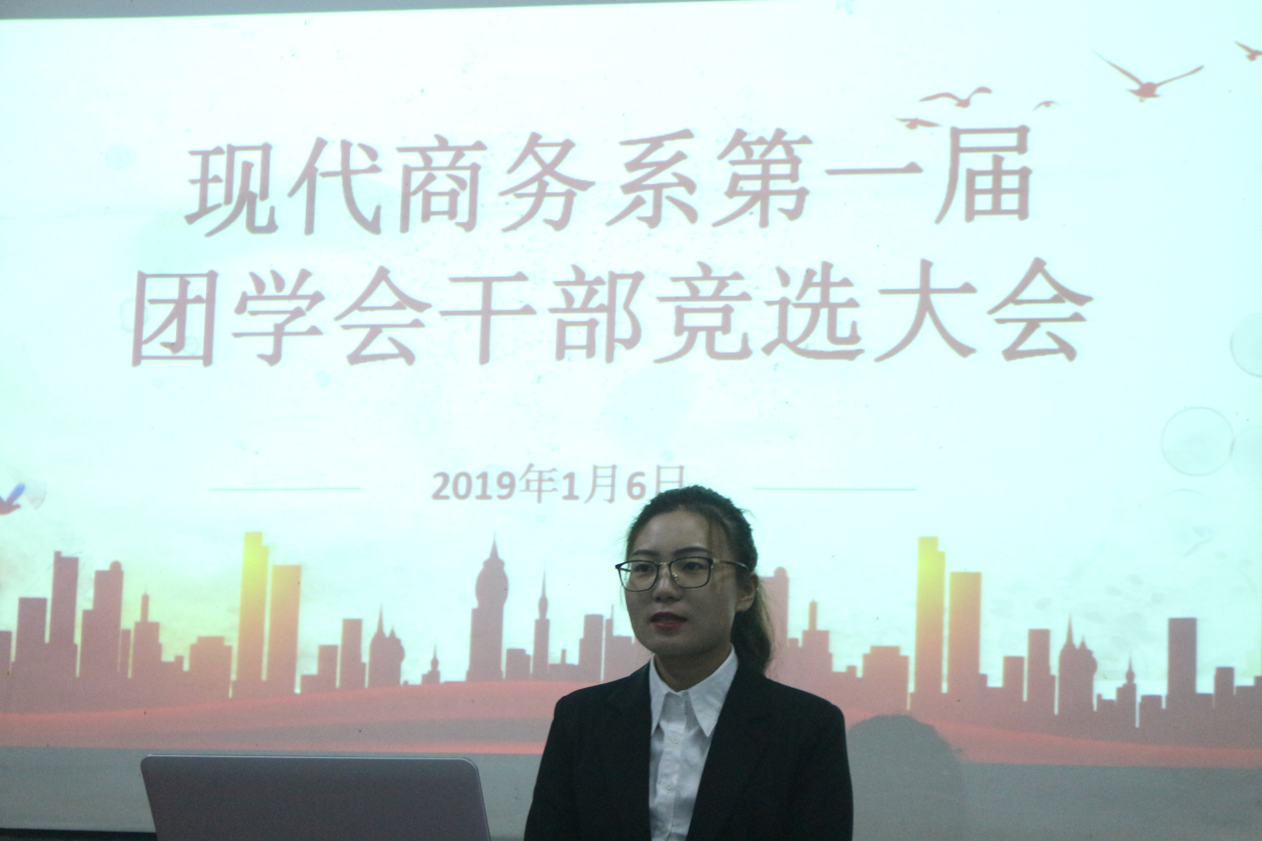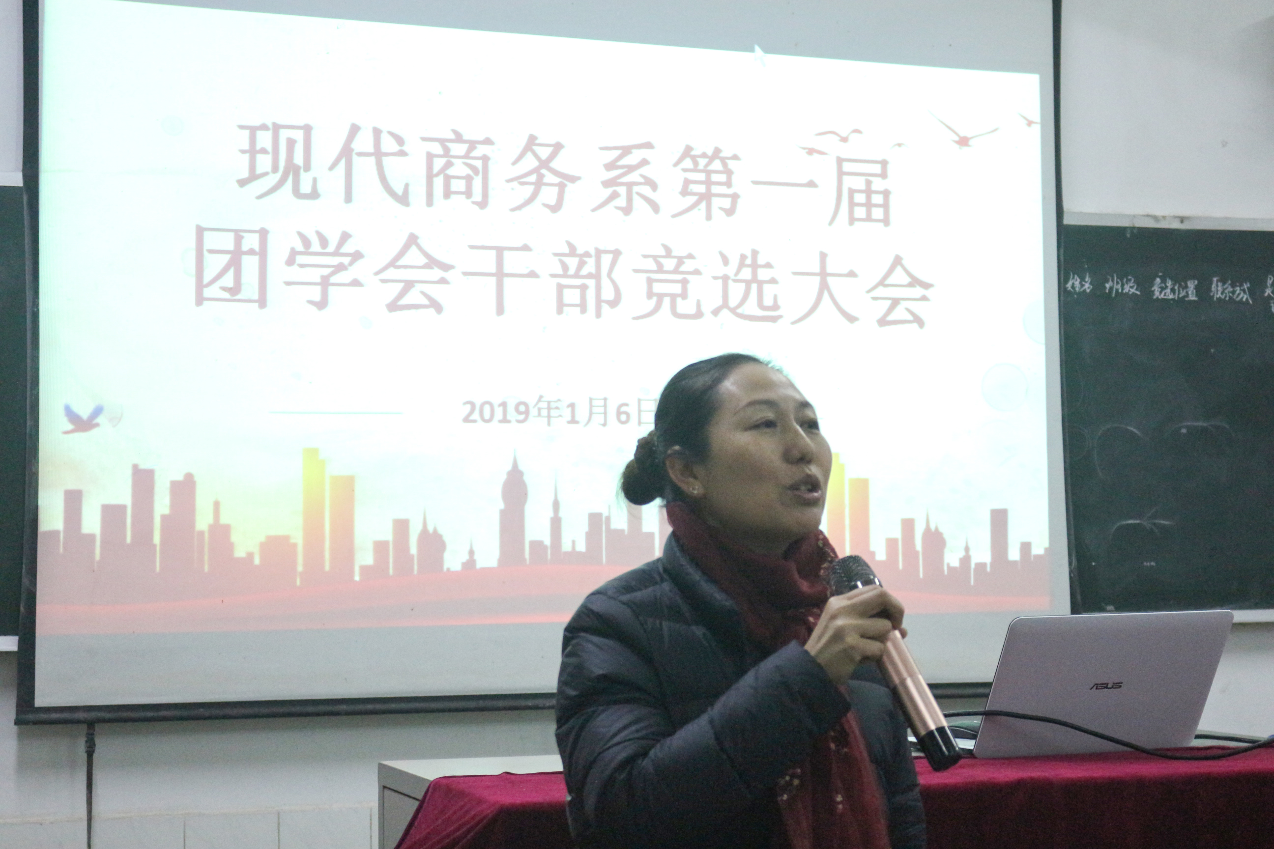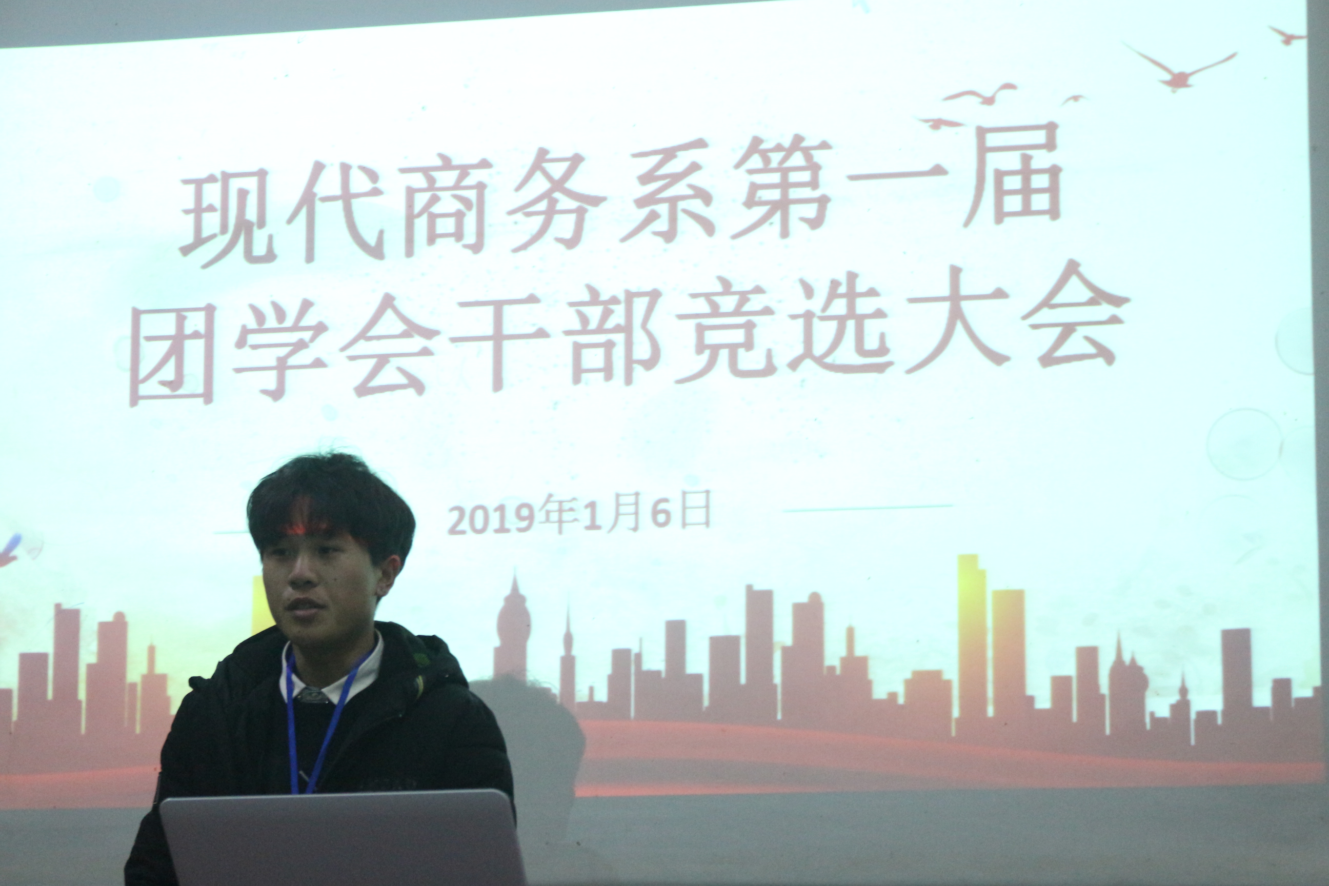 为了贯彻落实学院党委的决定,推动现代商务系的成立与组建。2019年1月6日下午16:00,现代商务系第一届团学会干部竞选大会在二教206隆重举行。经管系副主任蒋亚嫦老师、经管系学工办主任杨芳老师、各班辅导员、经管系团学会主席团与书记团,以及所有参与竞选的同学参与了本次大会。大会由廖文同学主持。