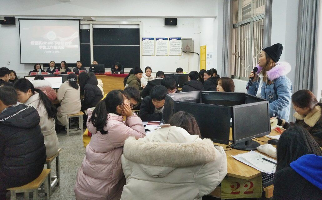 为了收集各班同学对我系教学工作和学生工作的建议和意见,2018年12月11日下午14:30,我系在二教702教室召开了经管系2018年下学期教学和学生工作座谈会。出席本次会议的领导有系主任吴自力主任、教务处管理科科长刘建连老师、教务办主任许艳老师、会计教研室主任刘卫民老师、 电商教研室曹薇老师,以及经管系15级、17级、18级班长、学习委员、团支书。曾丽婷担任本次座谈会主持人。