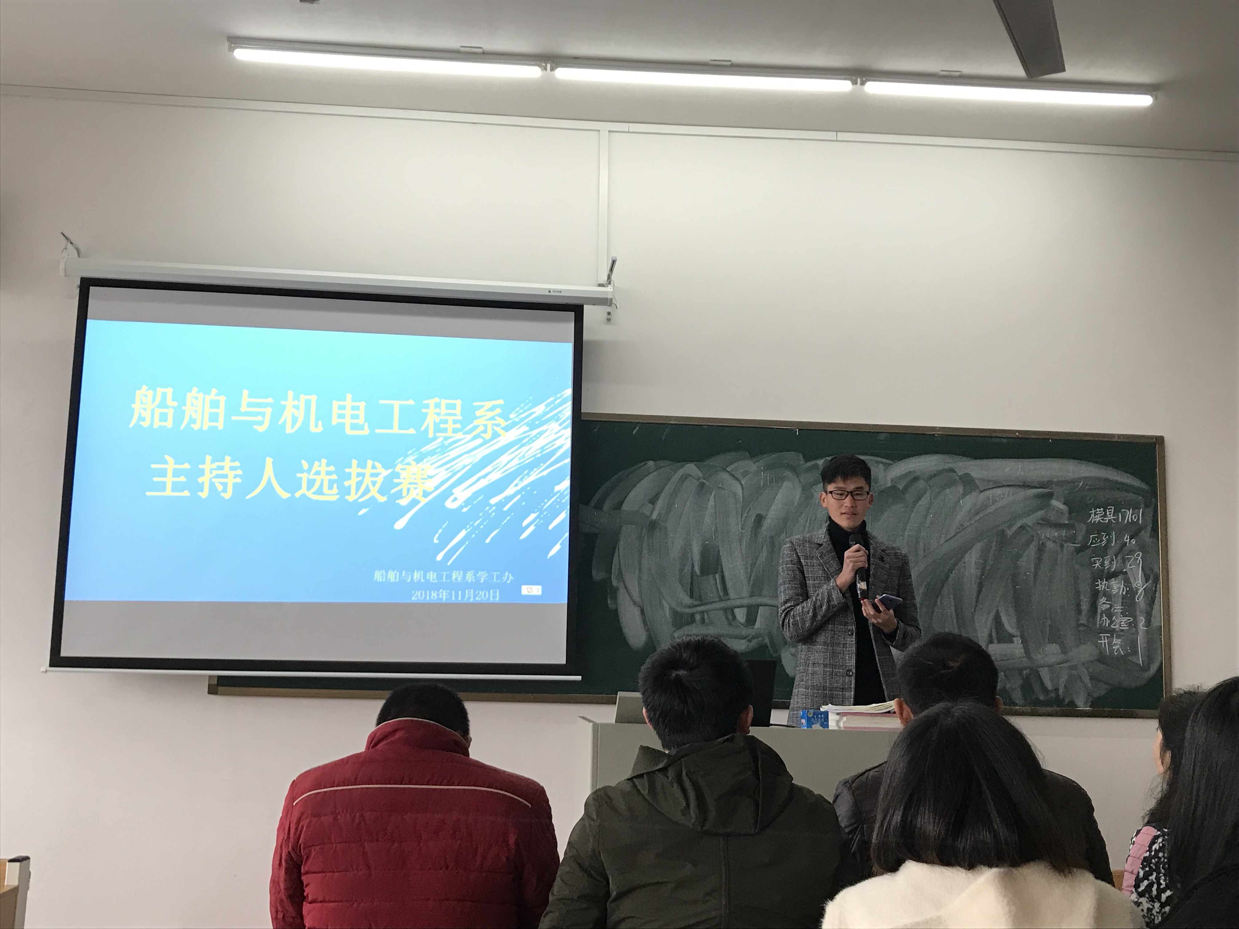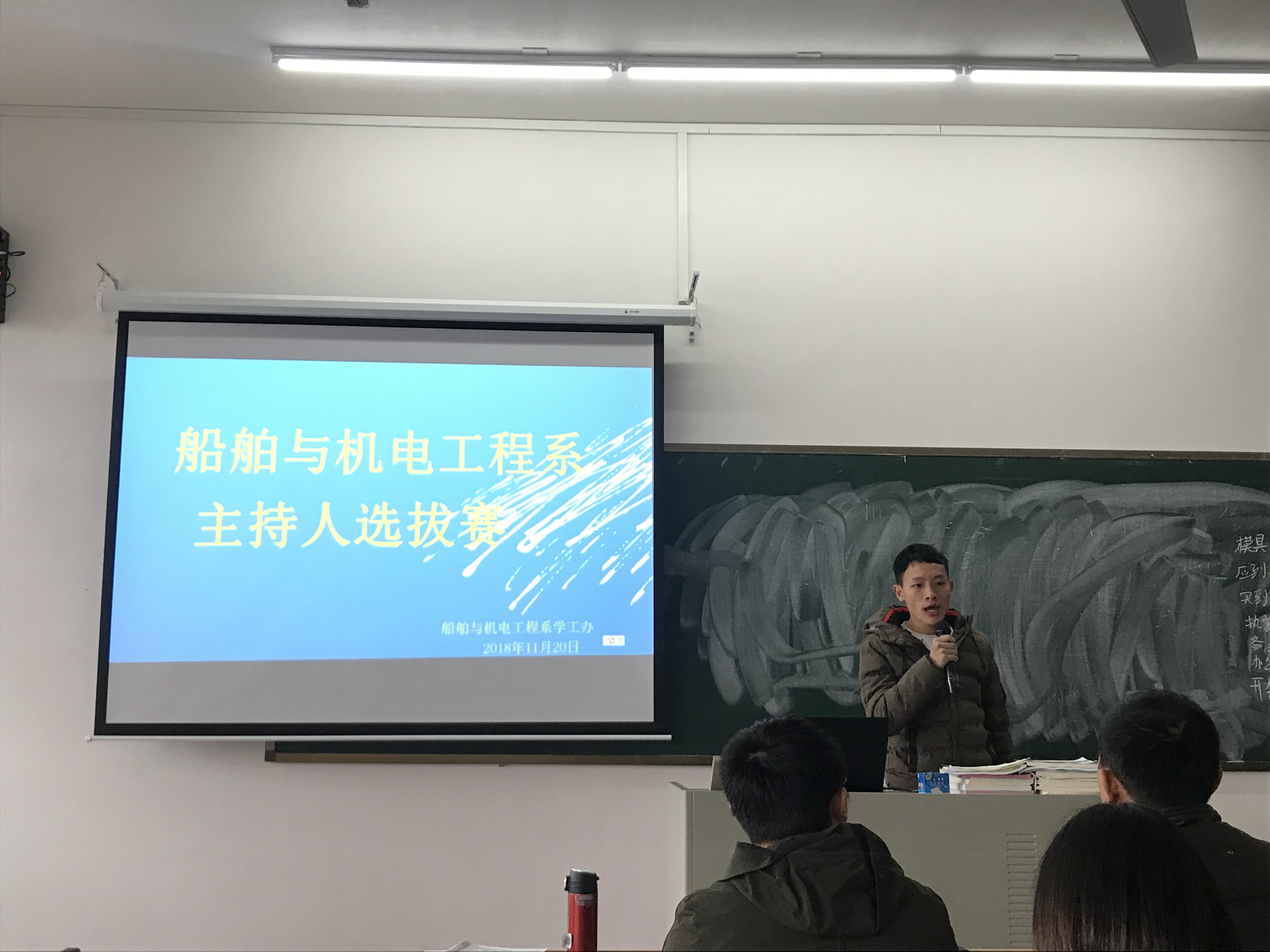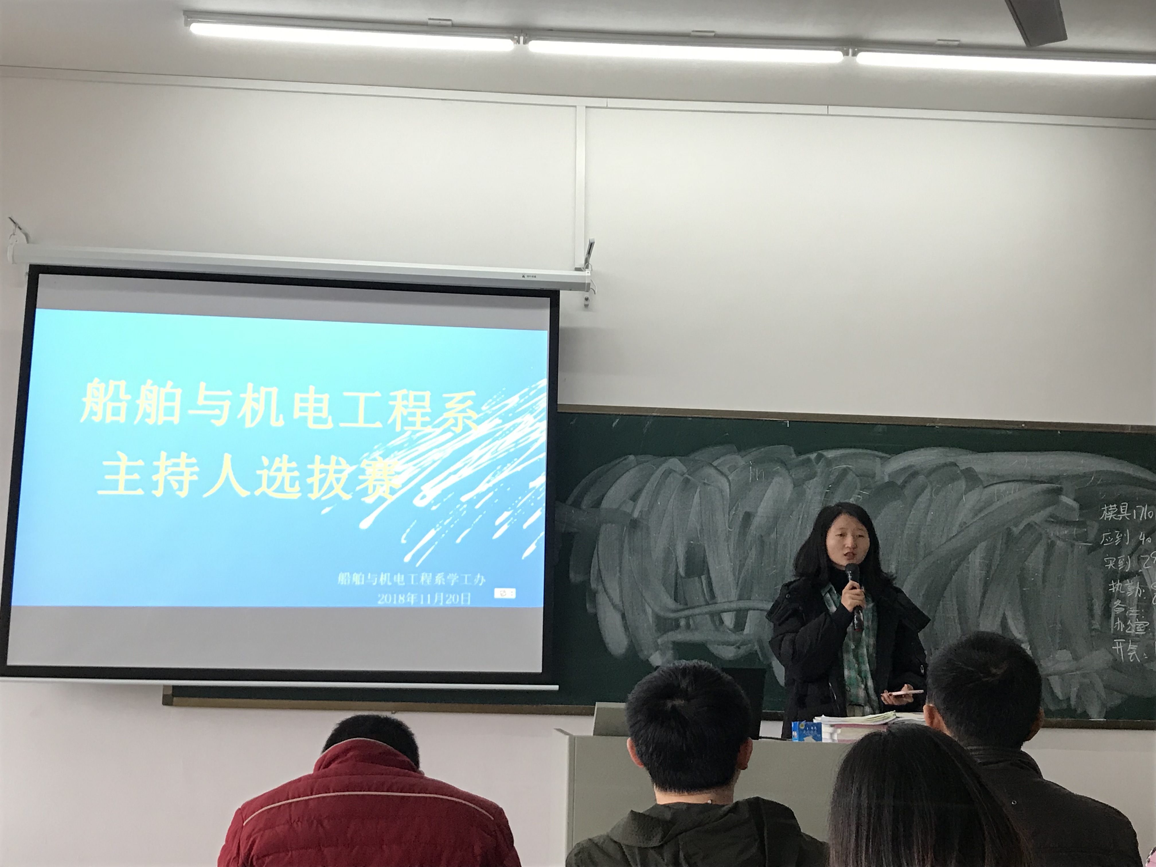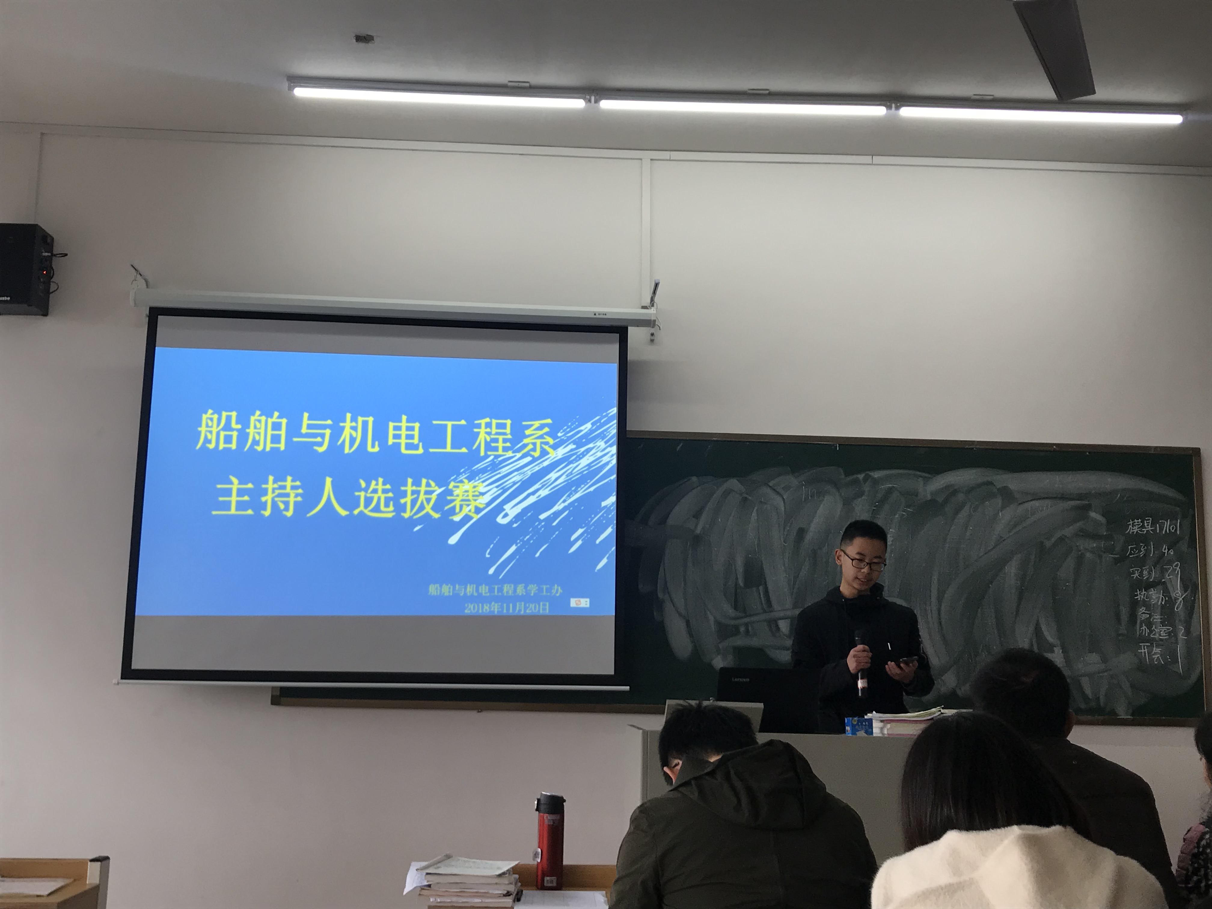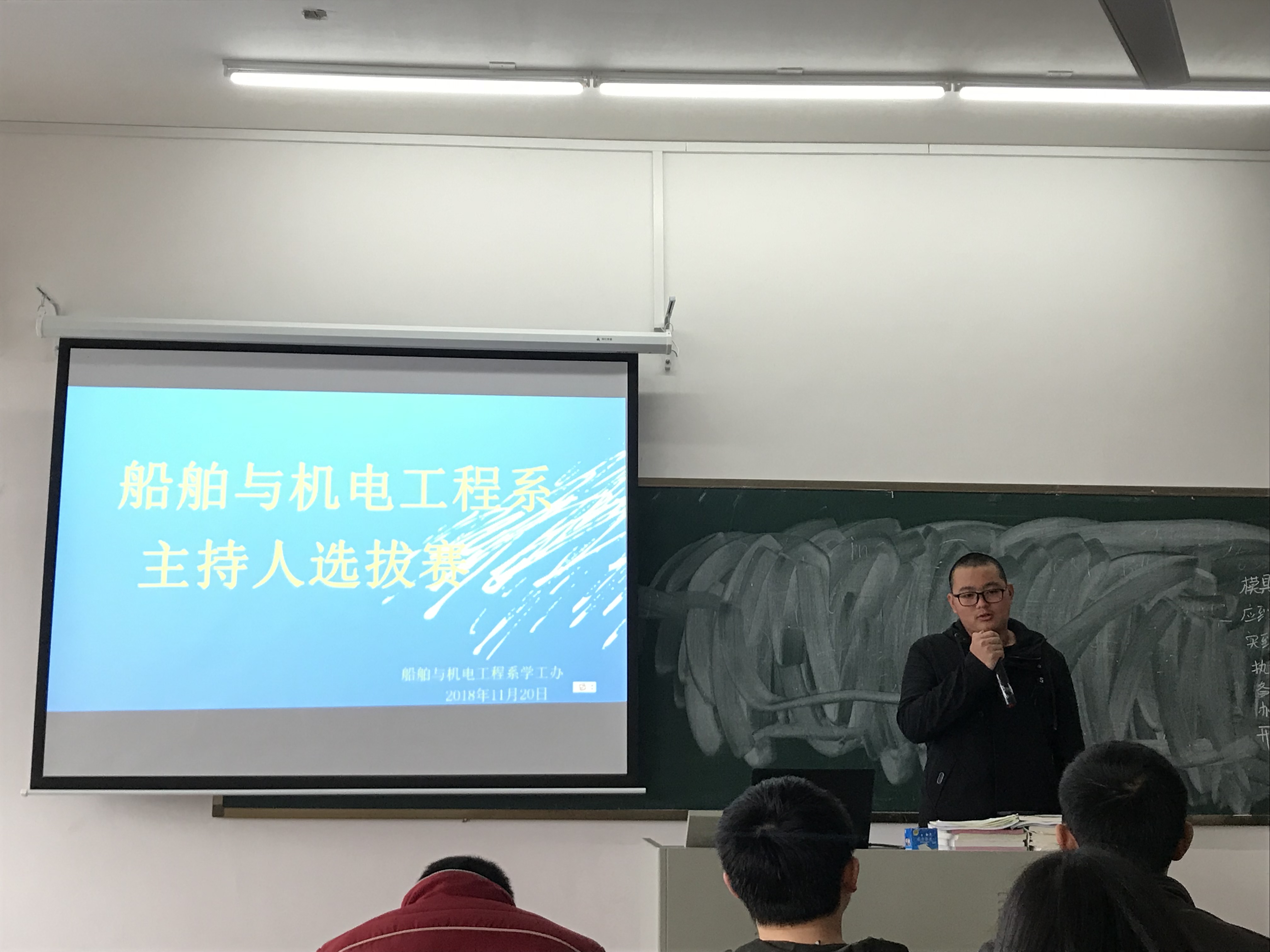 为丰富校园课余文化生活,进一步为广大同学搭建一个展示自我的平台,船舶与机电工程系主持人选拔赛于11月20日在船舶大楼316举行。学工办龚德贤老师、李盛兰老师和各班级辅导员老师担任本次比赛的评委。共16名同学参加此次角逐。 比赛现场气氛活跃热烈,各位选手依次上台,为观众们献上了一段别出心裁的自我亮相,体现了他们扎实的基本功,经过比赛,共有6名选手脱颖而出,成功晋级。