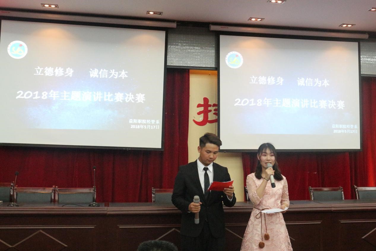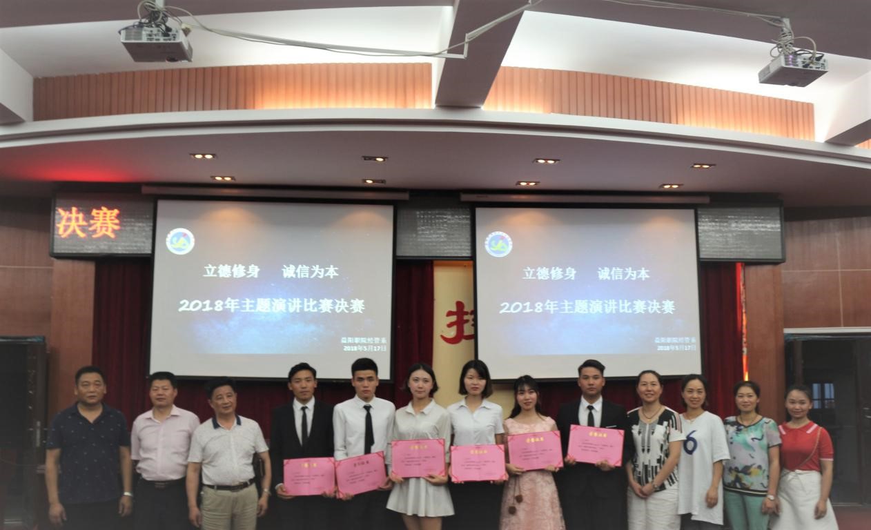 为认真贯彻落实中共中央国务院《关于加强和改进新形势下高校思想政工作的意见》,认真实施铸魂工程教育,提升我系学生的道德认识,2018年5月17日晚上1:00点,经管系“立德修身,诚信为本”演讲比赛在六教三楼会议厅隆重举行。 共有10名经管系16、17级大学生通过初赛最终进入决赛。益阳职业技术学院副院长杨建华老师、基础课部蔡敏副主任、学生处陈瑛科长、经管系吴自力主任、唐超文书记、蒋亚嫦副主任到会并给获奖选手颁奖并致辞。观摩本次比赛的辅导员、学生逾两百人。会计17104班的沈瑶瑶,她以自己的亲身经历和对生活中“立德修身,诚信为本”的理解,演讲内容充实,思路清晰。会计17103班刘海燕同学用她那响亮且具有磁性般的声音赢得了阵阵掌声,在舞台上她的从容不迫和精彩的演讲得到在座的评委老师连连点头与肯定,也给台下的选手带来巨大的心里压力。十位选手都他们用声情并茂的演讲感染着每一位师生,现场气氛热烈,掌声不断,将活动一次次推向高潮! 随后,吴主任对本次“立德修身,诚信为本”演讲比赛做了专业的点评,指出了本次演讲中同学们的优点和不足。尤其要注意演讲技巧和主题的把握,同时也肯定选手们积极热情,希望他们再接再厉。本次演讲比赛结束,共评选出了一等奖一位,二等奖两位,三等奖三位,并为刘海燕、沈瑶瑶等六位获奖同学颁发了证书。 最后,杨院长对本次活动做出了总结,简单明了对活动主题进行了阐述,演讲就是一种才能。诚信无处不在,就看我们如何去践行。此次比赛,同学们赛出了风格,赛出了水平,展现出益职学子的飒爽英姿和青春风采。这是一场比赛,更是人生的启迪,诚信是德信的核心,让我们共同遵守,共同努力。