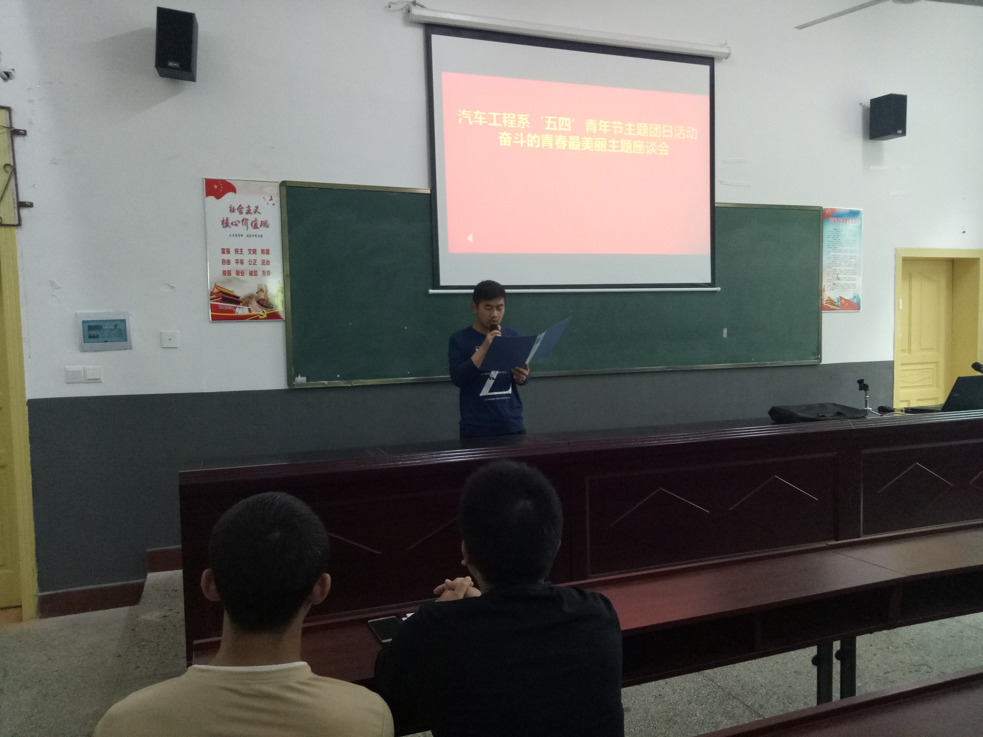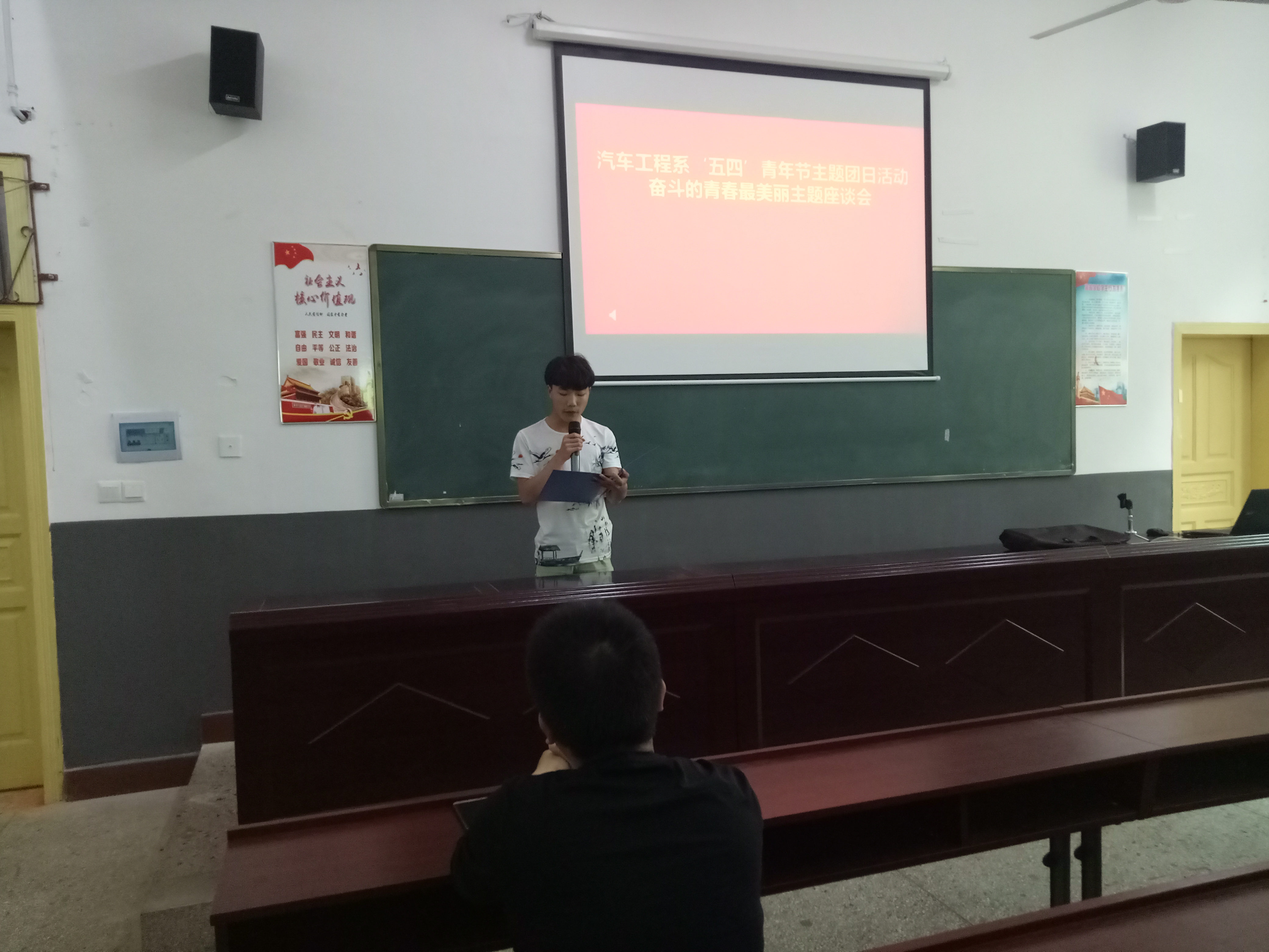 2018年5月4日中午1点,汽车工程系以“奋斗的青春最美丽”为主题,在四教107教室举行了五四青年节学生座谈会,共同纪念五四运动99周年。学工办胡长生老师、团学会全体成员、预备党员、入党积极分子以及各班团支书代表参与了本次活动。本次活动由团总支书记唐能主持。 活动伊始,《中国共产主义青年团团歌》响起,全体成员肃然起敬。随后,各学生代表结合自身的学习和生活实际纷纷发言,表达自己对青春的看法,一方面他们号召所有青年学子们努力肩负起历史赋予我们的重任,积极弘扬“爱国、进步、民主、科学”的五四精神,成为青年的榜样;另一方面他们承诺自己会脚踏实地,一步一个脚印,努力学习,奋发进取,谱写绚烂多彩的青春篇章。学生代表们慷慨陈词,激昂奋进,使在场的所有同学都深受感染和鼓舞。最后胡长生老师表达了汽车工程系党总支对所有青年学子的节日问候,他以习近平总书记的“勤学、修德、明辨、笃实”为切入点对同学们提出了要求,希望同学们能积极践行社会主义核心价值观,在时代潮流中活出精彩的青春人生。并寄语在场所有同学:立鸿鹄志,做奋斗者;求真学问,练真本领;知行合一,做实干家。 本次座谈会的成功召开为青年学子们注入了一股青春的正能量,相信大家今后会更加严格要求自己,做青春的奋斗者,不负韶华,不负青春,不负自己。(汽·网)