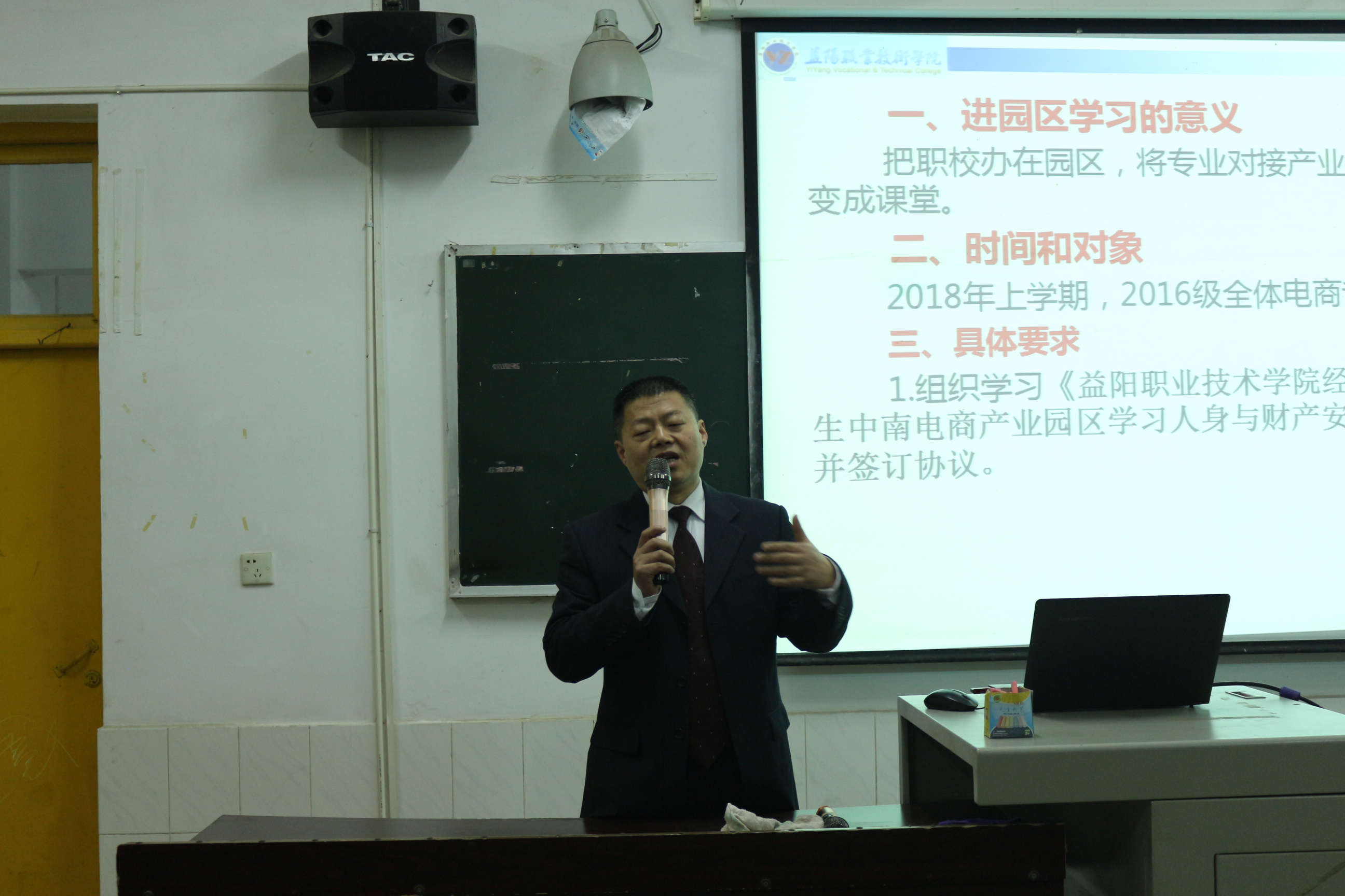 为了加强学生专业学习,我院决定把电商专业定在产业园区,把园区变成学习的课堂。2018年3月4日晚上19点整;经管系2016级电商专业学生进中南电商产业园区学习——安全纪律教育大会在二教206拉开帷幕。莅临本次大会的领导和老师有:经管系系主任吴自力老师、经管系全体辅导员以及全体16级电商专业学生。 本次大会由学工办赵昭仪老师主持。首先吴主任讲解进入园区的相关事项:组织学生学习《益阳职业技术学院经济理系学生中南电商产业园区学习人身与财产安全责任书》并签订协议。接着,依据园区学习实际,成立中南电商学院学生会,实行学生自治,李志华老师全权负责。再紧接着是后天进程安排,比如领取教材、整理行李、出发时间等详细安排。然后,对费用缴纳以及注意事项,实行AA制(费用平摊)、节约开支(水、电、气),住宿费由学校负责支付,由蔡文馨老师在其中辅助。并着重强调安全性问题,如高层建筑生活安全、安全用水、公共社会秩序与纪律等安全问题。 最后,由学生自主提问,每一次的提问,吴主任都以幽默风趣的解答了学生所提出的问题,师生之间有问有答,气氛活跃。同时吴主任祝愿,16级电商专业学生在中南电商园区学习之中,让梦想起航,让梦想高飞。