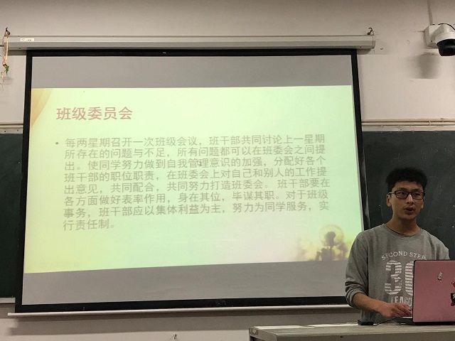 至“五一”劳动节之际,生物与信息工程系的班长也没有休息,大家聚集在一教301参加了系部的班长总结大会。总结前段工作,交流工作心得,相互取长补短,团学会各部门干事、各班班长和团支书参加了会议。 会上,首先由各班班长上台进行总结。总结主要从学习、纪律、卫生、思想方面进行管理的经验介绍,接着展示的是各班特色:例如班规、班级管理制度等。各个班长的PPT中16102畜牧班的较为突出,总结也很动情;16102网络班班长的发言内容丰富,条理清晰。短短的几十分钟时间里,大家重温了过去的点点滴滴,一路走来有收获也有不足,但同学们始终在努力,也取得了进步,特别积极参与学校各项活动,大家相互交流也获得不少班级管理的经验。这次班长总结大会,有的班级清楚指出自己班的不足,并提出解决方案,也有的班级总结的不够全面,需要加以改进。总的来说,这次会议的召开很有意义,可以互相学习,互相进步,共同更好的建设班级,增强凝聚力。 过去的一年里,我们大家一起走过,有欢笑,有泪水,从开始的迷茫好奇,到如今的自信、干练、勇敢,我们这个大家庭里每个人的心早已紧紧凝聚在了一起。我们团学会和各班前进的步伐不会停止,我们会一如既往,满怀热情地共同建设好自己的班级和系部。 生·宣传部 2017年5月1号
