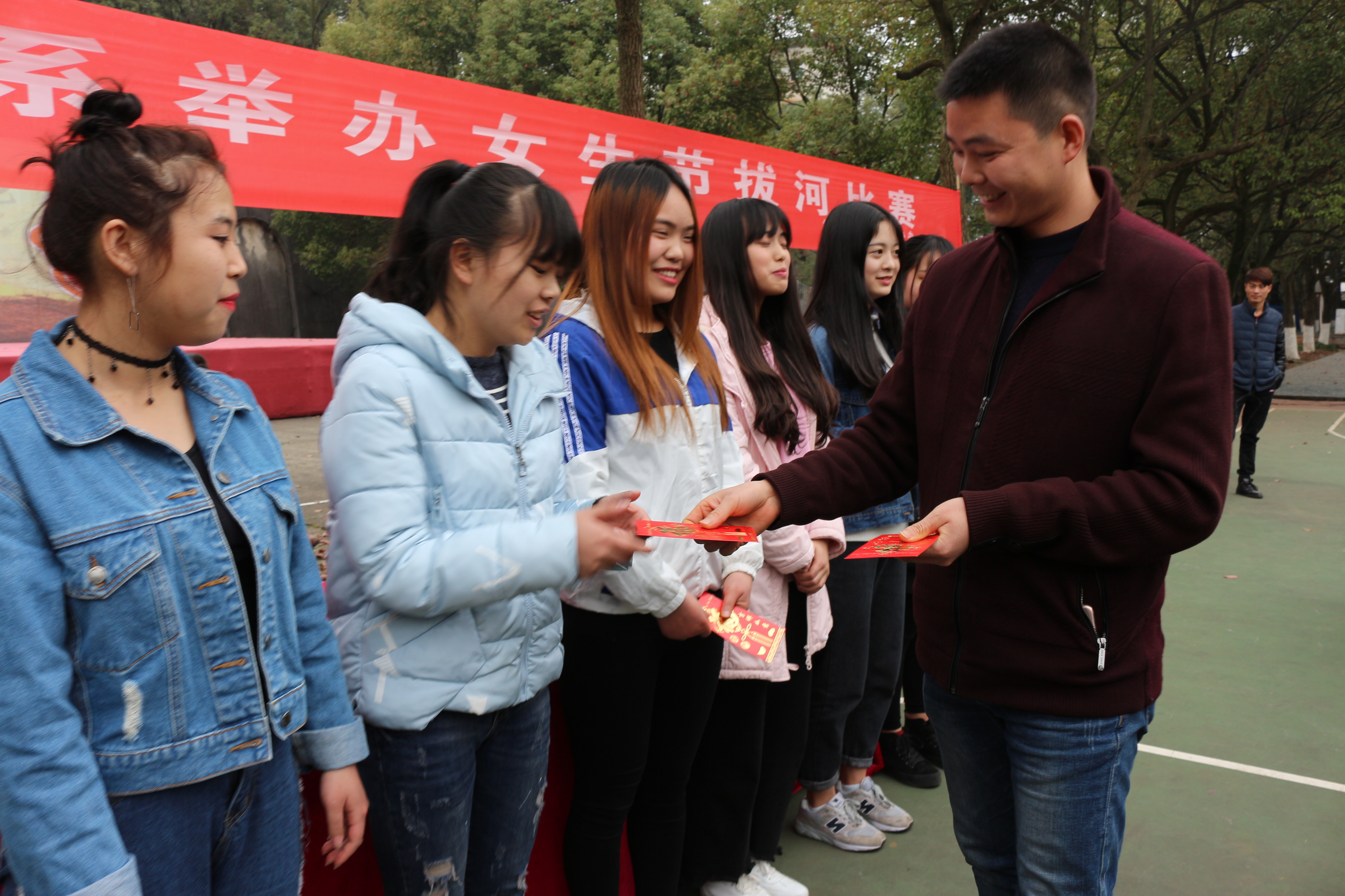 为践行“铸魂工程”思想,引导学生们铸牢信仰、铸塑价值、铸就精神、铸造人格,展现当代大学生的创新意识和与时俱进的精神风貌,2017年3月7日下午15:00,经管系全体女生在学院篮球场举办了以“凝聚巾帼力量,展示巾帼风采”为主题的女生节拔河比赛活动。 莅临本次活动现场的领导与嘉宾有学生处处长姚子凤老师、经管系总支书记唐超文老师、经管系学工办主任刘慧予老师、赞助商一卡通中心陈经理、经管系全体辅导员及经管系全体同学,本次活动由网宣部部长颜欢主持。 首先由学生处处长姚子凤老师致开序幕词,随后由裁判长李超群老师宣读比赛活动规则。本次比赛是以三局两胜形式,共有10支队伍参赛,每队20人。当比赛的哨声一响起,队员们口中一起高呼着“一二,一二”,啦啦队在旁边为本班同学加油。号子声、呐喊声、此起彼伏,漂浮在赛场上空。 经过激烈的耐力、体力较量,最终决出5只优秀队伍:会计15101、会计14201/14202、会计15102、经信16101/网营16101班与会计15104。 接着唐超文书记祝各位女生们节日快乐,并对大家团结、努力拼搏的精神给予了肯定。最后刘慧予主任、赞助商校园一卡通中心陈经理分别为获奖队伍颁发礼品与奖金。 本次活动不仅丰富了同学们的课余文化生活,加强了同学们的团结合作精神,更是培养了每一个拼搏进取的精神和积极乐观的生活。(图文/代超、颜欢) 以下是图片展示: