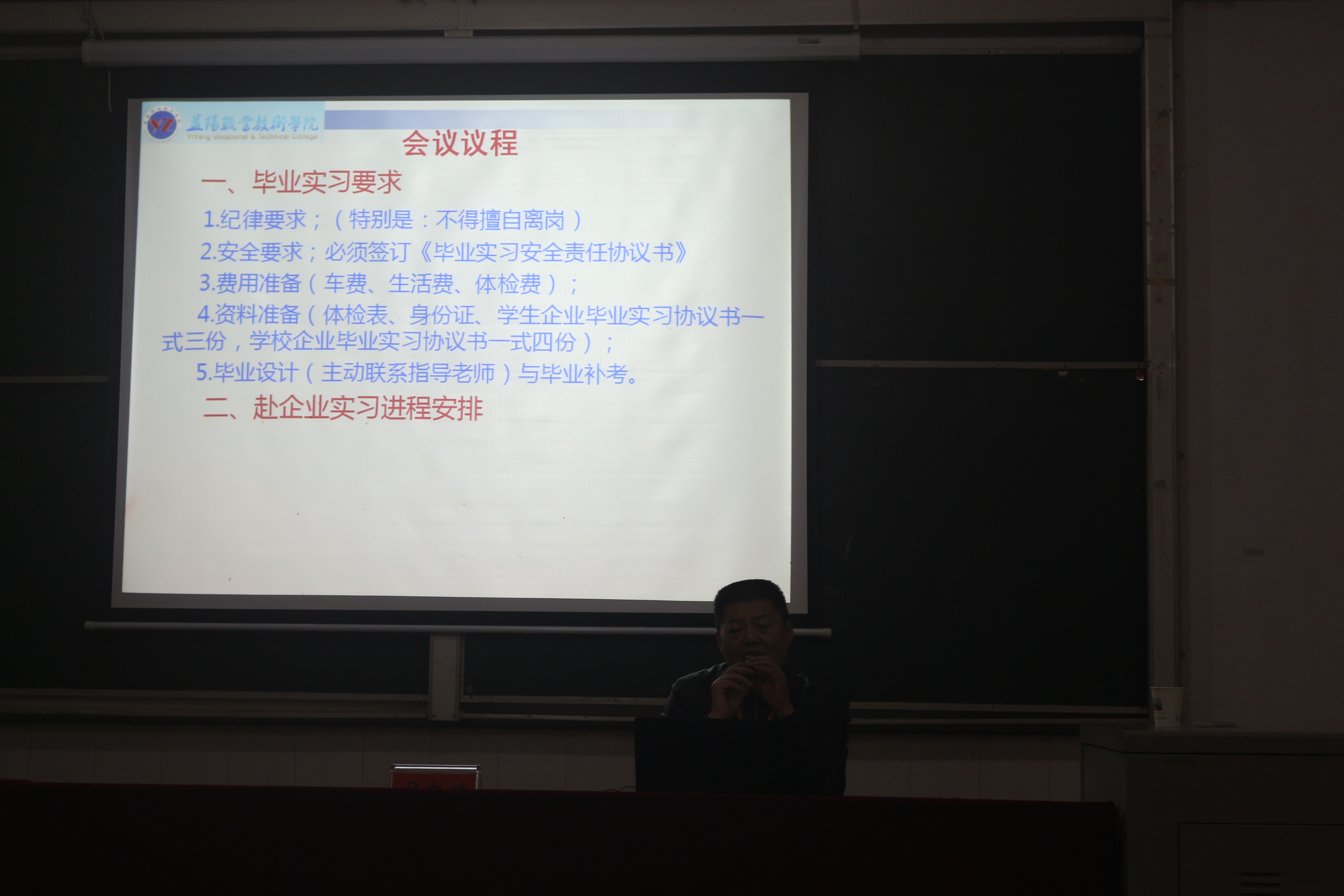 2016年11月17日晚,经济管理系在2-102教室召开由系主任吴自力老师发起并主持的毕业生毕业顶岗实习的专题大会。 会上,吴自力主任列举了上学年顶岗实习的湘运物流班14102班部分学生在公司的表现,提醒毕业生们一定要遵守公司章程,严格自律。随着,吴自力主任还集中解释了从学校启程去公司实习的时间安排,还多次强调实习过程中安全问题以及遵纪守章。 吴自力主任在会上多次提到,所有去实习的公司都是学院和系部经过严格考察的,并且系部和公司签订了相关的协议,并祝全体毕业生实习顺利!(图文/网宣部)