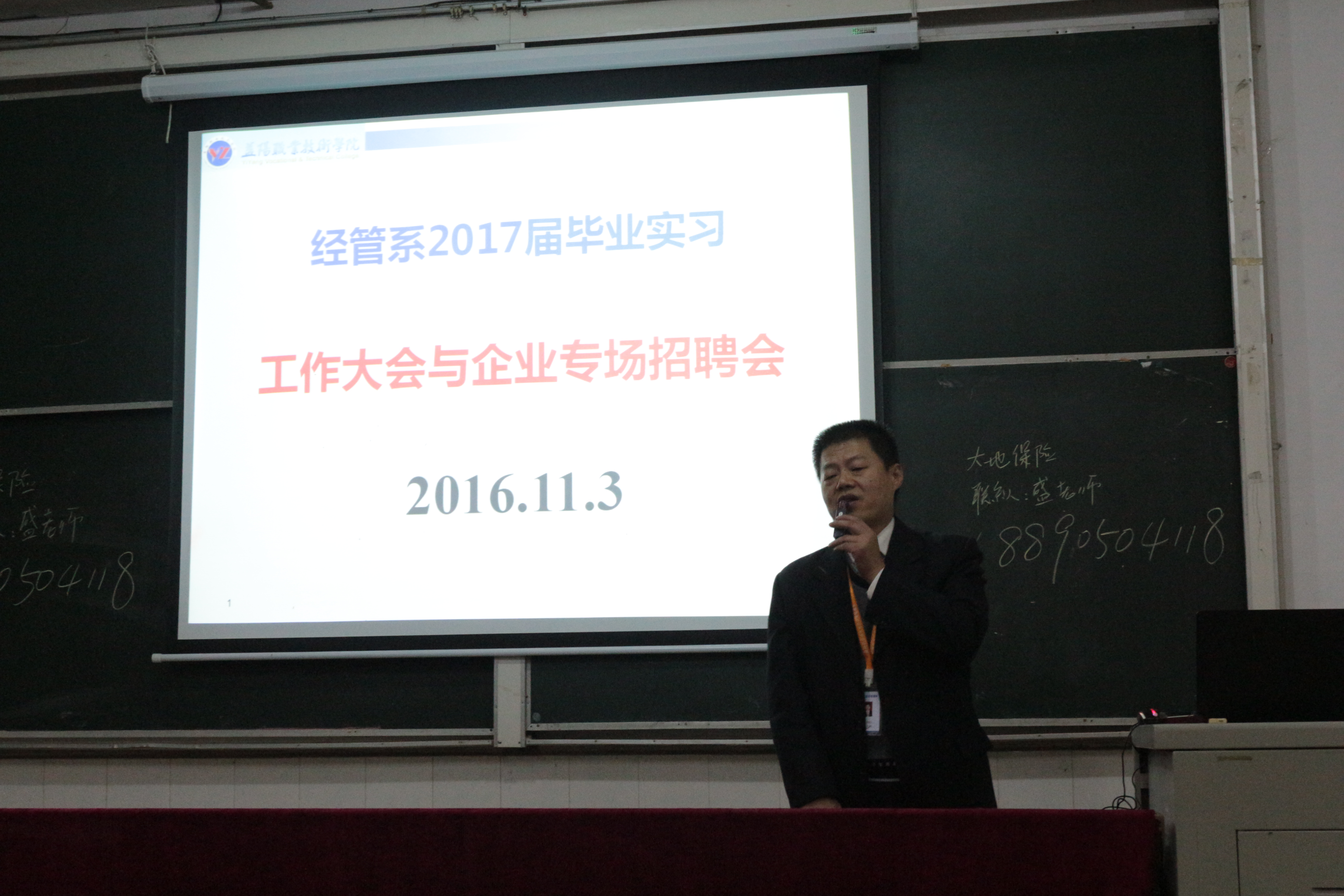 2016年11月3日晚21:00,由经管系主办的2017届毕业实习工作动员大会暨企业专场招聘会在2-102圆满落幕。经管系吴自力主任、两家公司的招聘负责人、毕业班级辅导员及全体毕业生参加了会议。