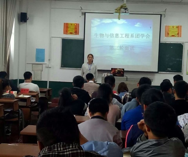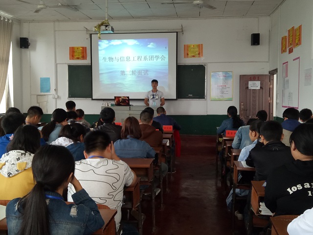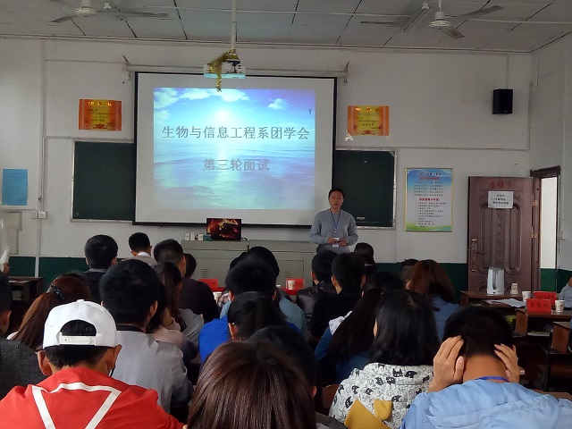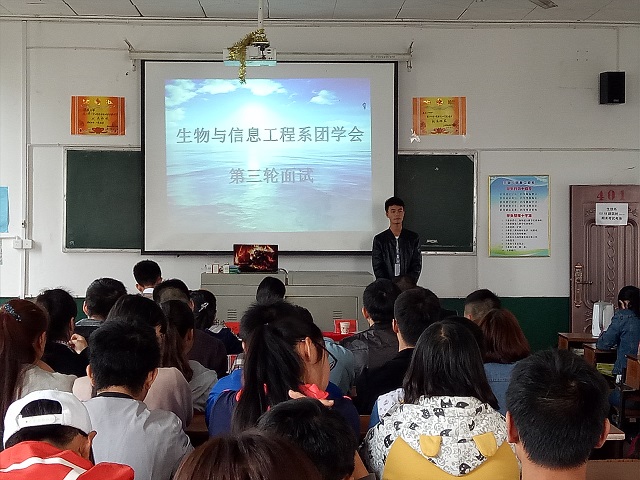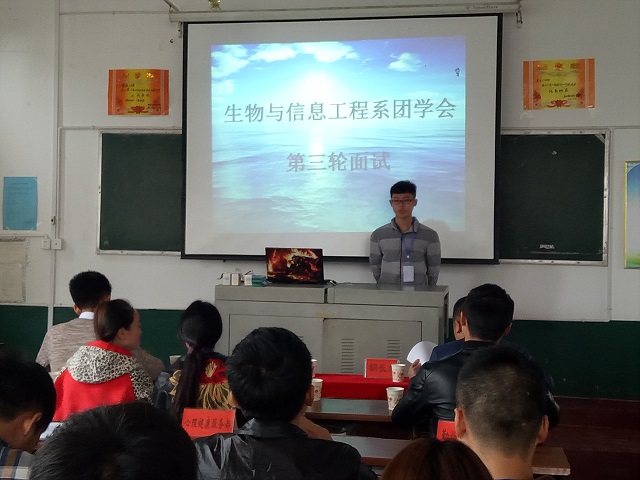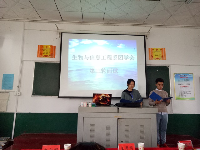 2016年10月16日行为,生物与信息工程系在一教401举行了新学期新干事第三轮面试。 会议总共有三个议程:一、新干事第三轮面试;二、胡老师总结;三、会后总结。首先,由主持人肖国豪和左妹巧向我们介绍了参会的领导和老师,并依次安排了15级新干事部门演讲顺序。经过近一个月的实习工作和考核,各位实习新干事终于迎来了最终的面试,大家迈着坚定的步伐走向演讲台,带着微笑的面容开始了他们精彩的演讲,讲述着他们近来开展的工作,他们的表现。 随着新干事第三轮面试的结束,胡长生老师对本次会议做了总结发言,指出了我们工作中存在的不足,和应该如何去做,并且进一步希望团学会在今后的工作中能更上一层楼。 最后由团学会主席肖国豪发表了对近期他们工作进行了点评。 本次会议充分展示了生信系团学会成员的精神风貌与认真负责的工作态度,相信团学会新一届干部会为生物与信息工程系工作增添光彩。 生信系·宣传部 2016年10月18号