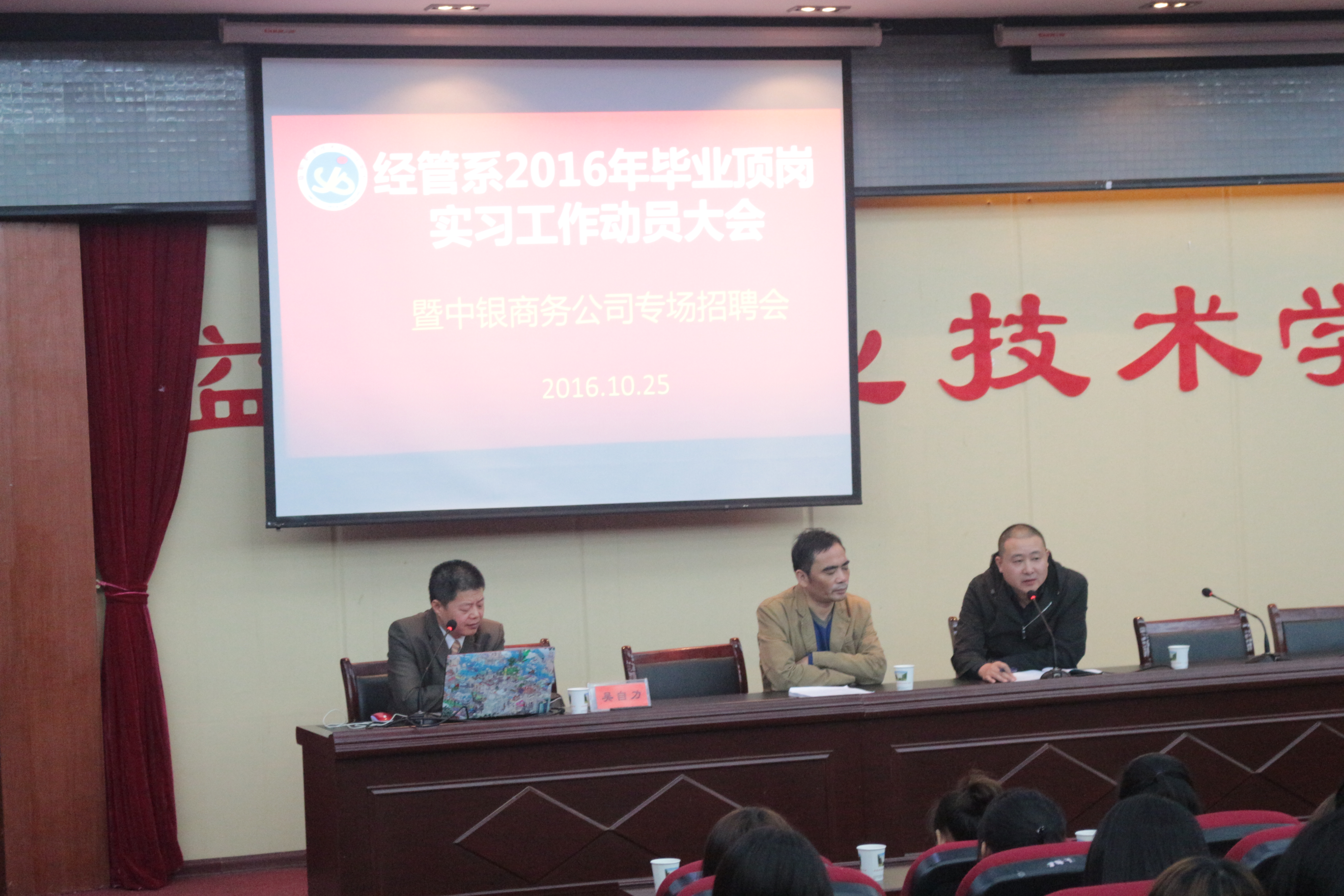 2016年10月25日晚上18:30,经管系为了进一步规范和做好我系学生毕业顶岗实习工作,提高实践教学水平,全面提升人才培养质量,在六教一报告厅召开了2016年毕业实习动员大会。本次大会分会计专业、电商和商务信息管理类专业两场进行。系主任吴自力、招生就业处梁刚处长及中国银行商务有限公司代表王崇亚先生出席本次大会,与会人员还有全体毕业班辅导员。 会议由吴自力主任主持。首先,吴主任提出顶岗实习是促进学生全面发展和稳定就业的重要途径并对毕业定岗实习管理体系及流程做出了相关安排,重点强调实习考核成绩将记入学生毕业成绩,考核不合格者将不予颁发毕业证书,同时就《毕业实习安全协议书》的签订提出了具体要求。 随后王总介绍了中银金融商务有限公司的待遇,工作前景及工作环境等有关情况。最后梁处长指出,本届毕业顶岗实习院系将比以前更加重视,将会统一安排,并安排老师跟踪管理。 通过本次大会,学生知道了该怎样去选择适合自己的实习岗位,对自己的未来也有了新的规划。愿2017届毕业生顶岗实习顺利。(图文/网宣部) |