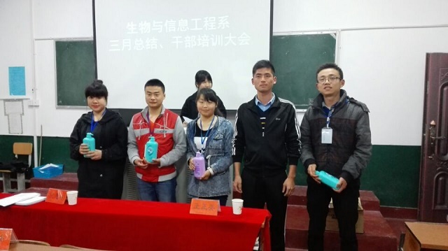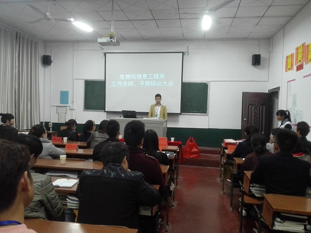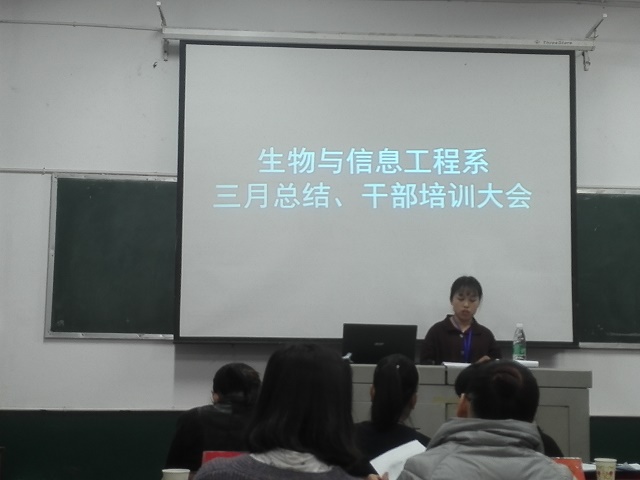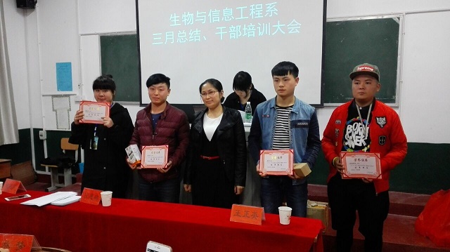 三月转瞬即逝,马上进入春暖花开、春风拂面的四月天。团学会虽然工作忙碌,但同学们还是尽自己最大的努力把各项工作做到实处,把工作做得更好。2016年3月28日晚,生物与信息工程系在一教401召开了团学会全体干部月总结及第三次培训大会,会议持续了2个半小时。会议的主要内容:一、各部门对前段工作进行了总结,对下一月工作进行了计划;二、为优秀班级、优秀部门及优秀个人颁奖;三、对全体干部进行了第三次培训。 通过总结及表彰,全体干部找到自身的优点和差距,取长补短,相互学习。负责干部培训的主讲人告诉我们:人生没有捷径可走,人生不可能一步登天,天上不可能掉馅饼;人生不可能一帆风顺,做人不能不对自己负责,更不能不对他人负责;每个人不要忘记第一次踏进大学的梦想。班长张中华的演讲,告诉全体班干部都要以身作则树立榜样,话说百遍,不如手做一遍;要有一支优秀的班干部队伍,要敢做敢管,不要怕得罪人。 系部学工办老师要求: 1、系团学会工作需要有能力的人做事; 2、大家要共同进步,提高凝聚力; 3、要把学校当成自己的家,有主人翁意识; 4、四月份的素质拓展活动,篮球赛的组队、五一大合唱比赛要尽快落实; 5、要严抓上课的到课率和卫生情况,提高系部的评比成绩; 6、相互学习,共同进步。 总结三月的工作,尽管有了一定的进步和成绩,但有些方面还存在着不足。比如工作缺少创新性,个别工作做的还不够完善,有些工作效率低,干部队伍的建设仍需加强。这都有待于在今后的工作中加以改进。争取做得更好。 生▪宣传部 2016年3月28日