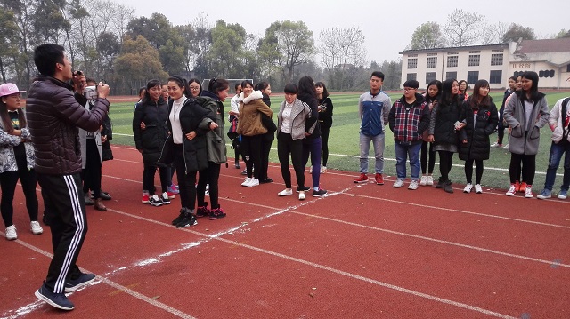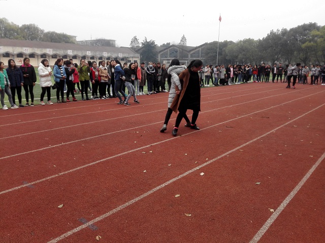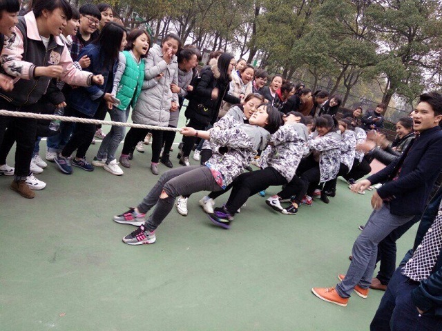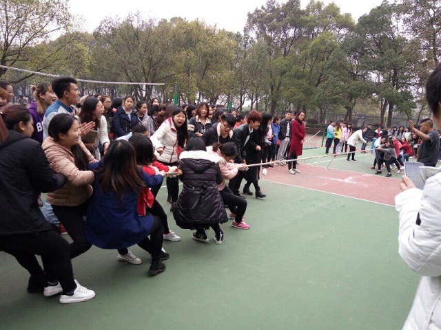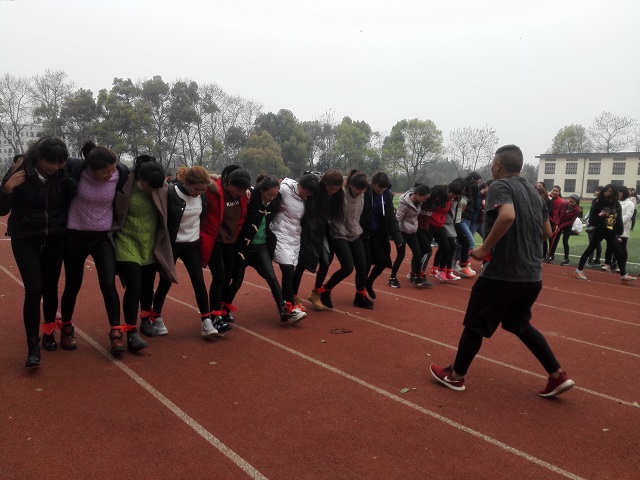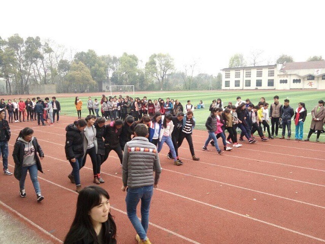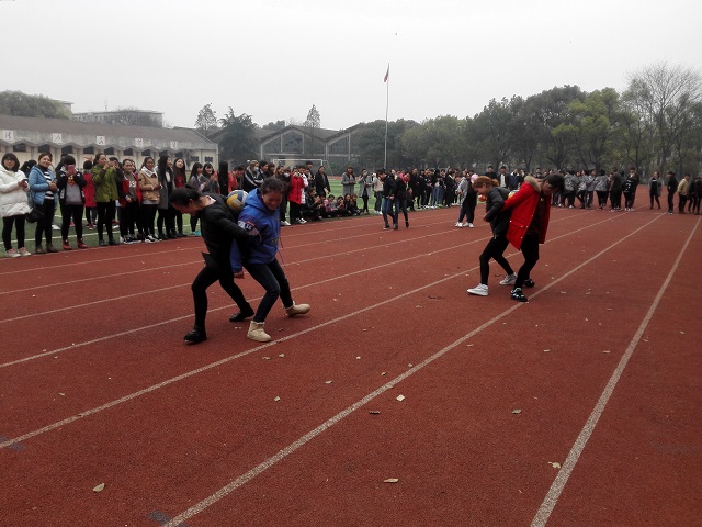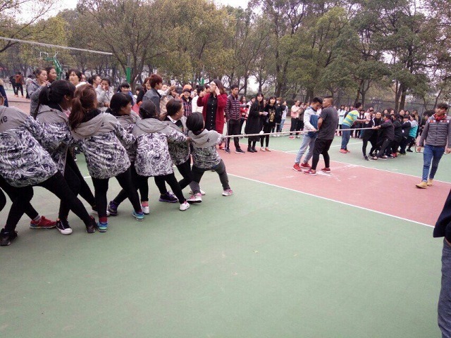 活动伊始,由主持人向大家致辞并陈述比赛要求。本次活动分为背对背拥抱、10人11足、拔河比赛。第一项比赛背对背拥抱,每班10人分为两人一组进行比赛,这两人背靠背中间夹着一个排球进行接力跑,用时短的队伍获胜。第二项为10人11比赛,也是每班10人参赛,这10人将相邻的脚绑上绳子,从起点出发到达终点所用时间最少者胜。第三项拔河比赛,比赛时场面精彩激烈,现场气氛十分火热,双方都不甘落后,加油助威声此起彼伏。