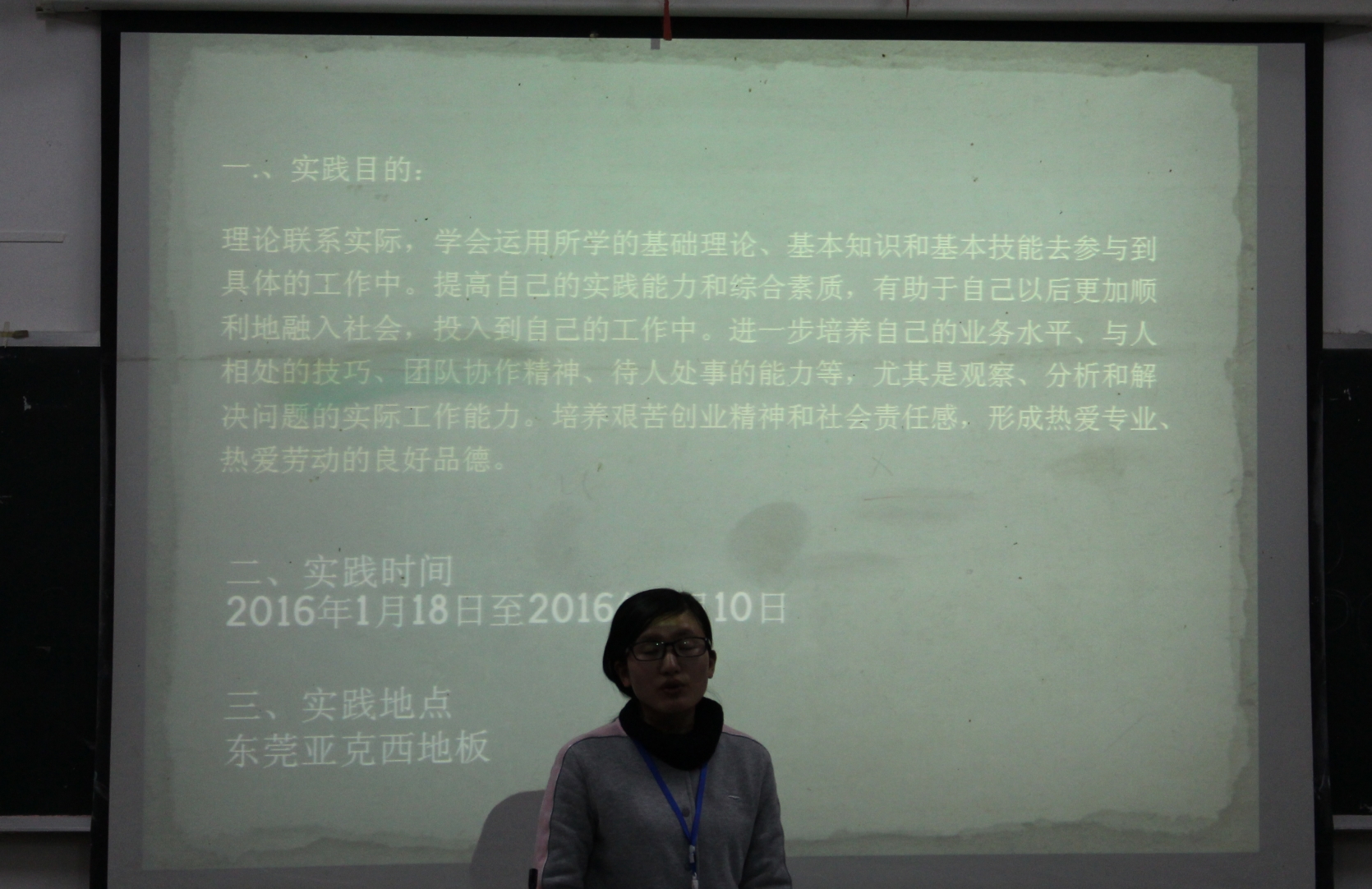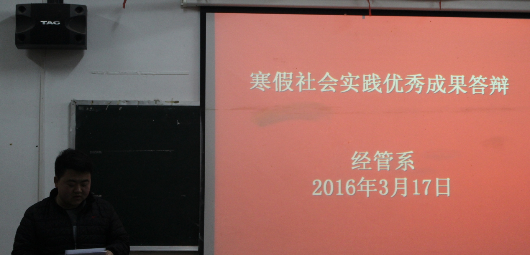 2016年3月17日晚19:00-21:30,经管系在二教206教室举办了“经管系2015年大学生寒假社会实践优秀成果答辩会”。答辩会由经管系团学会主席杜亮亮同学主持,系主任吴自力老师、阳梦华老师、廖蕾老师担任评委。 经各班初选推荐,系学工办初审,最终有15名同学进入了最后的答辩环节。答辩同学大都以PPT的形式进行答辩,生动形象地向大家介绍了自己寒假的实践历程,同时阐述了自己在实践过程中的心得体会。现场氛围活跃,在答辩的过程中,各位同学根据自己的实践经历认真回答了各位评委老师的提问,得到了评委老师的赞同与认可。本次共评特等奖1人、一等奖1人、二等奖2人、三等奖3人、纪念奖8人。电商15106班的张静同学以曲折的历程、深刻的感悟、动情的答辩打动了评委和与会同学,最终获得特等奖。(文、图片/经·网络编辑部)