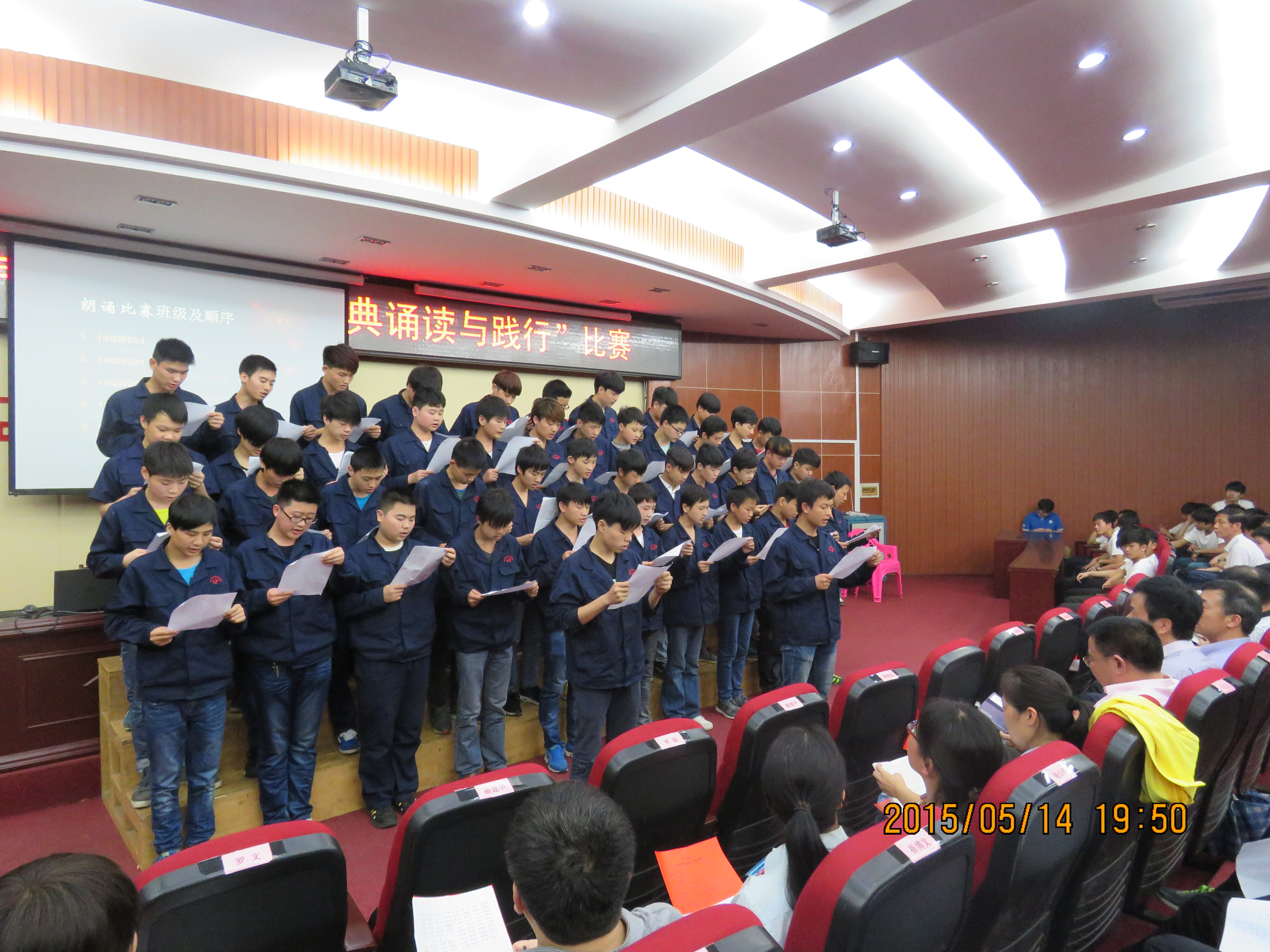5月14日晚,汽车工程系首届“经典诵读与践行”比赛在六教三楼会议室隆重举行。比赛邀请到了益阳市政府职教顾问骆子石、学院党委书记谢梅成、院长蔡建宇、副院长潘访华、副院长罗文等领导观看比赛。担任本次比赛的评委为:学院团委副书记孟慧、基础课部公共教研室主任蔡敏、语文教研室文小兵、杨平辉、我系专业课教师代表晏端秀。主持人由辅导员黄顺老师和14QW101班的王兵同学担任。 比赛共分为四个环节:书法评比、全班朗诵、个人背诵、识别老师。按照四个环节的总分评定获奖名次。参赛对象为我系13级和14级在校中职班。比赛在高职14QJ105班同学们整齐、洪亮的诵读《弟子规》中拉开了序幕。在全班朗诵环节中 13205班的同学们以其流利的背诵、整齐的队伍、良好的精神风貌赢得了本轮的最高分。紧接着是个人背诵环节,五位上台背诵的选手,都能做到语言流利,且举止从容大方,得到了领导评委的一致好评。第三轮的识别老师环节,将本次比赛推入了高潮,大屏幕滚动抽取各班同学姓名的时候,大家的心都被紧紧揪起来,关注着最后“花落谁家”。最终13205班的三位同学,不负众望,奋勇拼搏,在此环节拿到了全场唯一一个满分。 根据评委们的计分,13205班获得本次比赛的一等奖,获得二等奖的班级是14QW203班和14QW204班,获得三等奖的为14QW201班和14QW202班。13206班班主任龙定良老师荣获优秀指导老师。 潘访华副院长对本次比赛作点评,对环节设置、班级风采展现等给予高度肯定。对参赛选手的精神面貌提出赞扬。并对全体同学提出要通过此次比赛让大家认识到学习是没有捷径可走,而成功离我们也不那么遥不可及。在意识到与同学之间存在差距的同时,能够奋起直追,把所学的知识应用于日常生活中去。不断完善自己,赶超自己。 最后,蔡院长从三个方面为这次活动作总结。他首先充分肯定这次“经典诵读与践行”比赛对学生思想品德教育有重要意义,对活动的组织、策划提出表扬;其次指出学习国学经典,即是对传统文化的传承,也是大家学做人、学做事、学立业的指南,鼓励大家把学习落到实处,将来会受益终身;最后希望全院都能积极地开展读经典活动,并作为学校的亮点工程坚持开展下去。