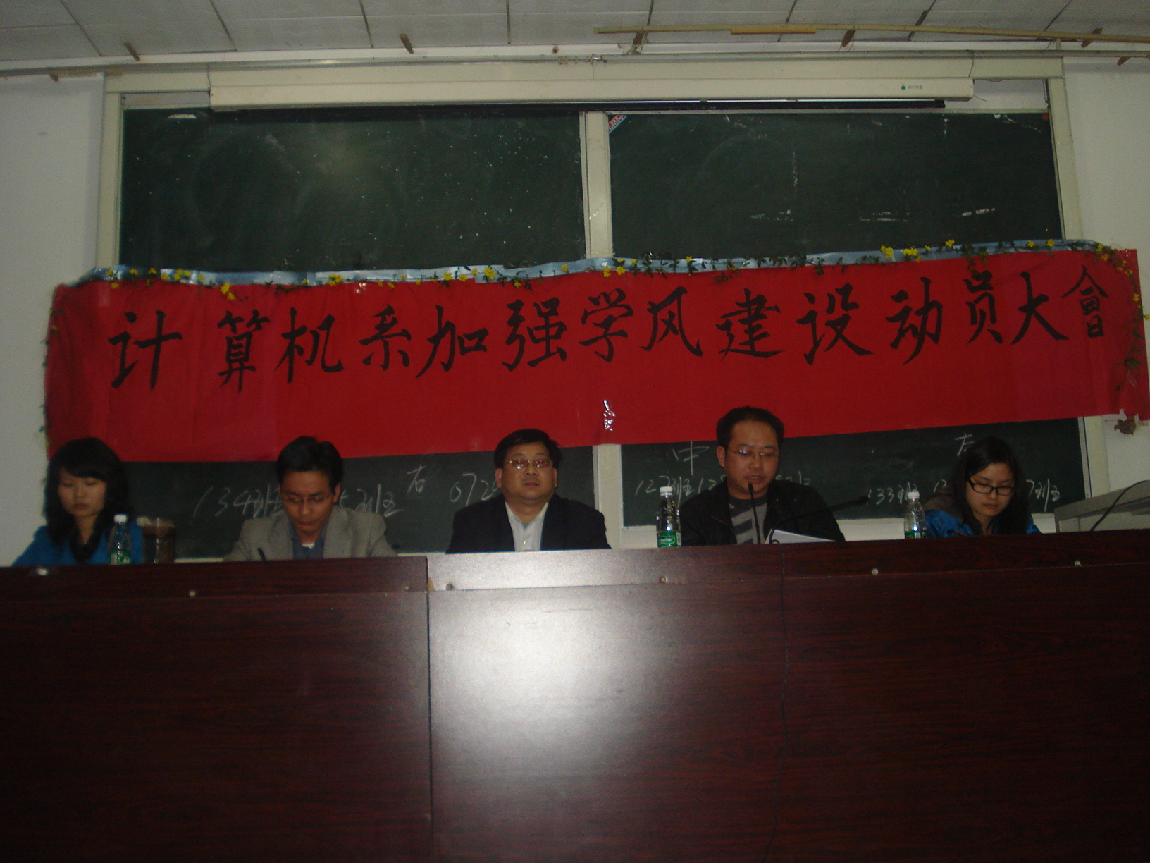 3月22日晚7:00,计算机系学工办于二教学楼102多媒体教室组织全系学生召开了加强学风建设的动员大会。会议得到了学院领导的高度重视,大会由计算机系龙开红科长主持,张建安院长、杨长虹主任出席并发表重要讲话。会议提出学风建设的重要性,围绕为什么要加强学风建设,怎样开展学风建设活动进行阐述和规划,制定出加强学风建设的方案。 此次会议目的是加强学风班风系风建设,营造浓厚的学习氛围。在学生中引起了强烈反响,会议取得了圆满成功。