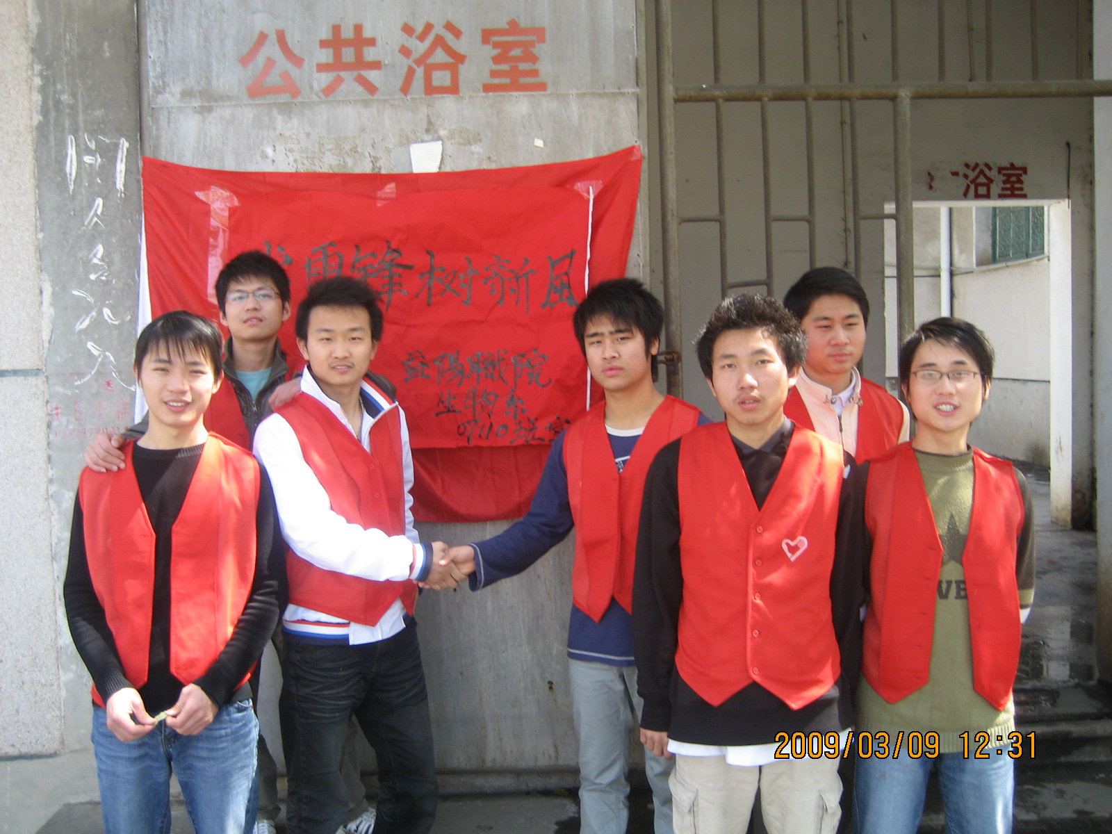 三月,雷锋月。生物系07109、07110、07122班为了继承发扬雷锋精神这一优良传统,响应学院号召,在班、团干部通力合作、精心策划组织下,开展了一系列丰富多彩的学雷锋活动。 瞧,那身着红马褂的不正是07110班组织的为全院女生提水的服务队吗?虽然本班的人数不是特别多,但是他们很团结,共计为全院女生提水200多人次。受到全院学生的好评。