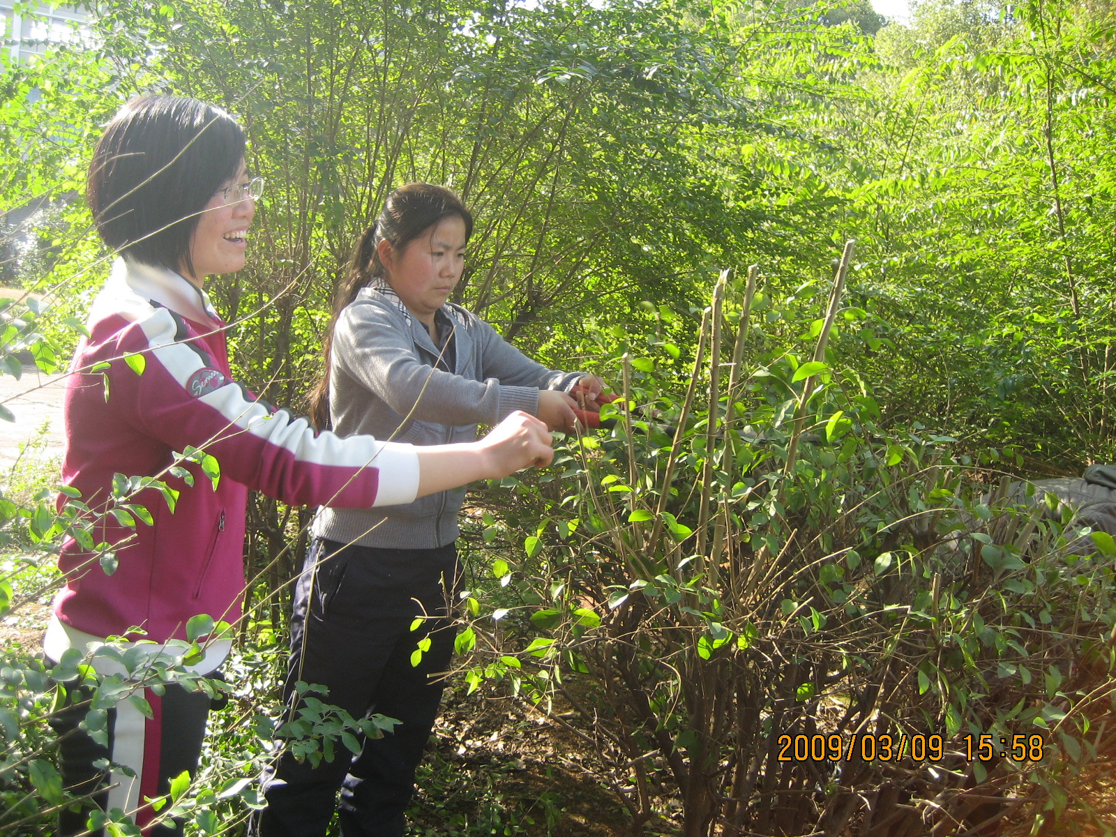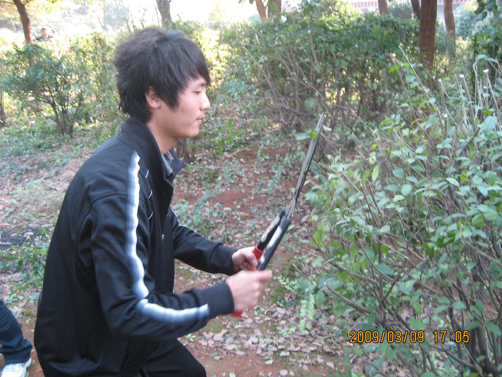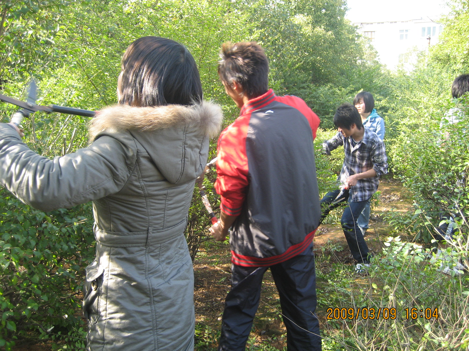 袖筒高卷,手执枝剪的07109班同学,将专业知识与“学雷锋”活动有机结合起来。利用课余时间,将图书馆前原来枝叶乱生的绿化后备树修剪得造型突出、井井有条。为学院的美化、亮化做出了自己的贡献。并且,这一活动得到了院团总支、广播站的大力支持。