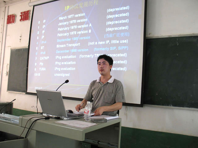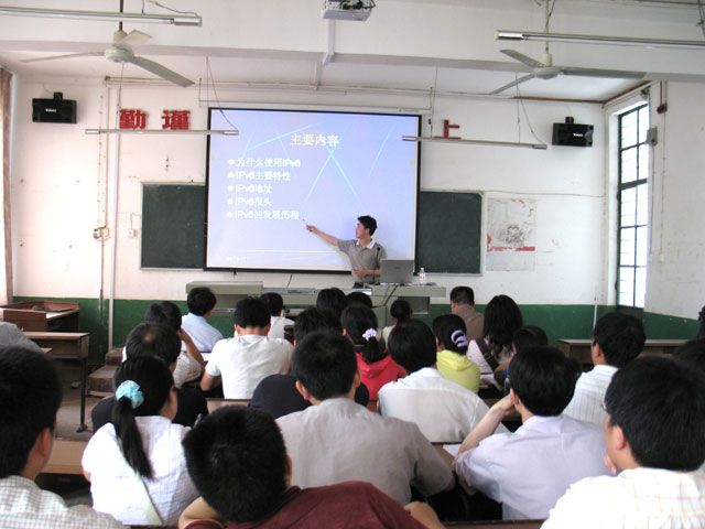 5月24日(星期四)下午,计算机系组织了由本系教师李新明主讲的网络前沿新技术讲座——下一代互联网络协议IPv6,全体教师和部分大专班学生参与了听课。讲座从“为什么要推行IPv6”、“IPv6的特点”、“IPv6的发展前景”等多个方面详细阐述了下一代互联网络协议。整个讲授过程非常精彩,老师和学生们都获益非浅。