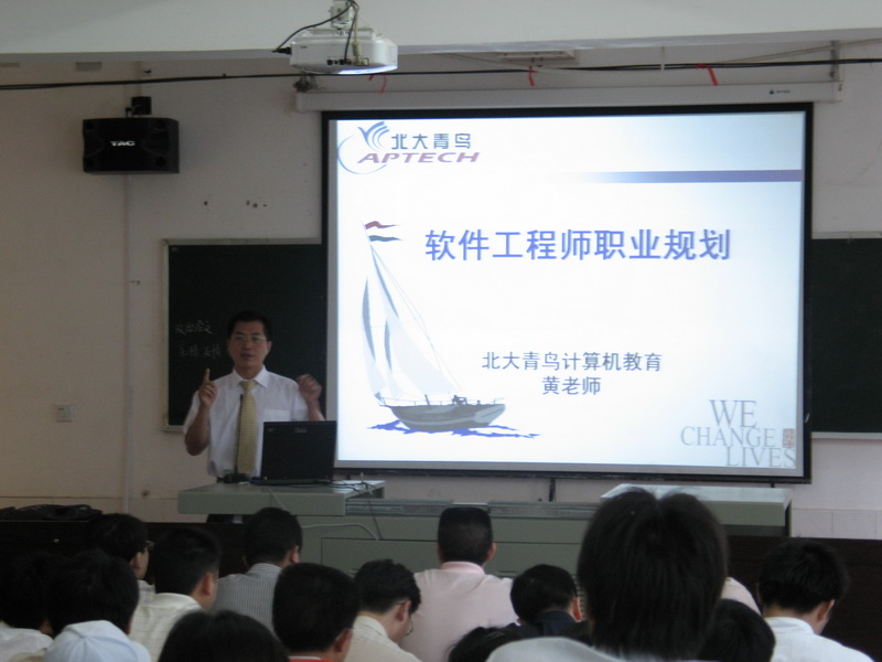 为了积极拓展学院的办学渠道,为社会培养更多的软件工程师,应我院计算机应用工程系之邀请,国际著名的IT教育培训机构————北大青鸟信息技术教育发展有限公司华东区经理黄龙正先生来我院进行软件工程师培养专场讲座。 讲座由计算机应用工程系负责人杨长虹主持。本系大部分教师及百余名大专学生聚集一起,认真听取了这场生动的多媒体讲座。首先,黄龙正先生向师生们介绍了北大青鸟信息技术教育发展有限公司的情况,公司的培训模式、发展状况及毕业生就业情况等,尤其详细地介绍了北大青鸟的培训课程及项目进程。讲座的最后,师生们踊跃地提问,都得到了圆满的答复。 在一片热烈的掌声中,此次专场讲座圆满地结束。(王欣)