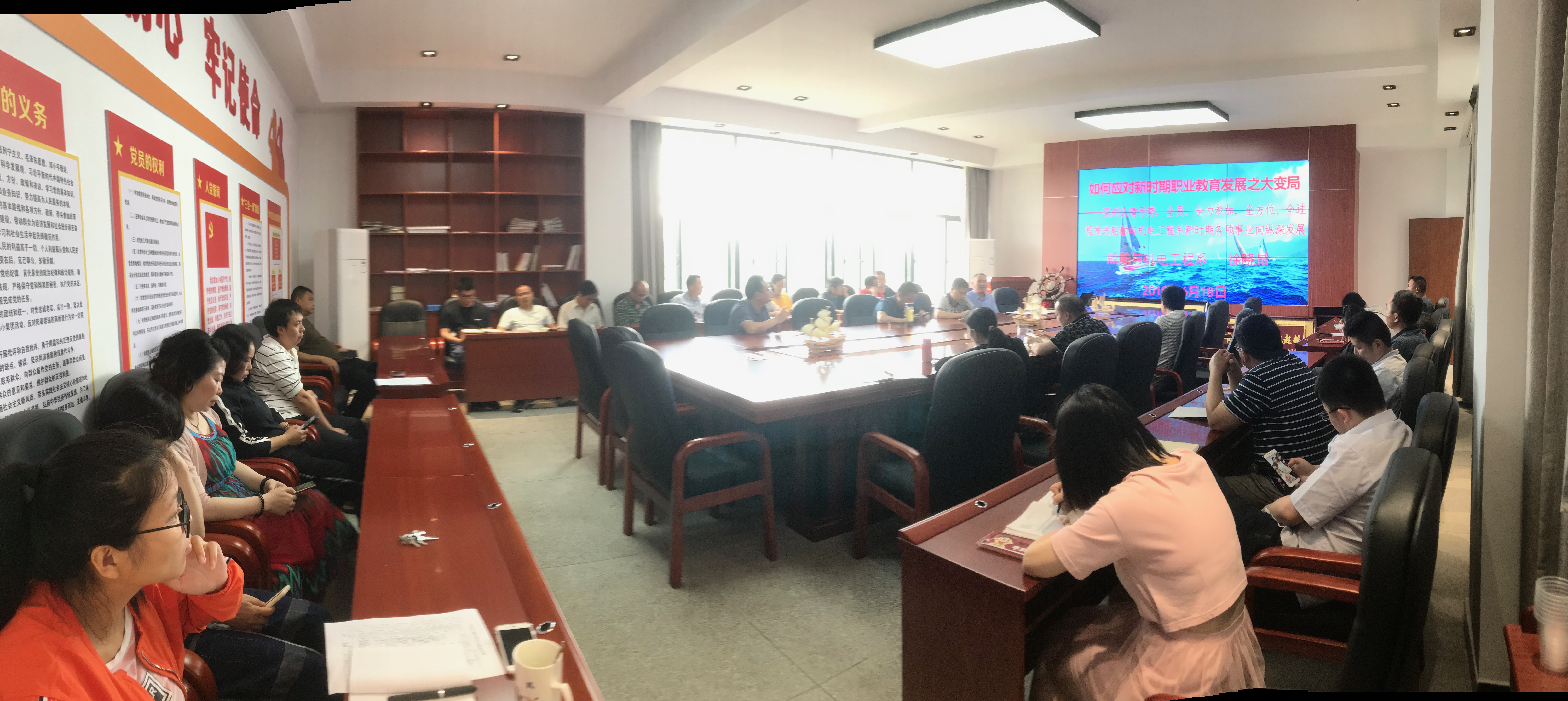6月18日,船舶与机电工程系形势与政策-全面推进各项事业向纵深发展动员大会在船舶大楼305会议室召开,全体教职工参加会议,会议由胡大有书记主持。