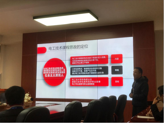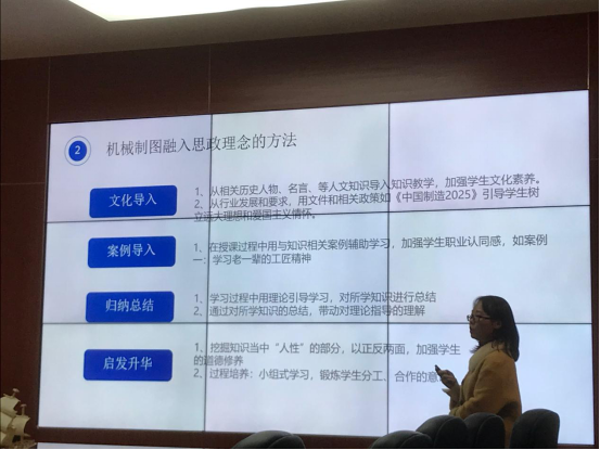 曾直、熊凯、王晓龙、李昭等四位老师代表4个团队依次进行说课。比赛中,老师们深入挖掘专业课程中蕴含的思政元素,有机融入社会主义核心价值观、中华优秀传统文化、工匠精神等,展示了特色鲜明的教学设计和教学风采,实现了知识传授与价值引领相统一、教书与育人相统一、言传和身教相统一。