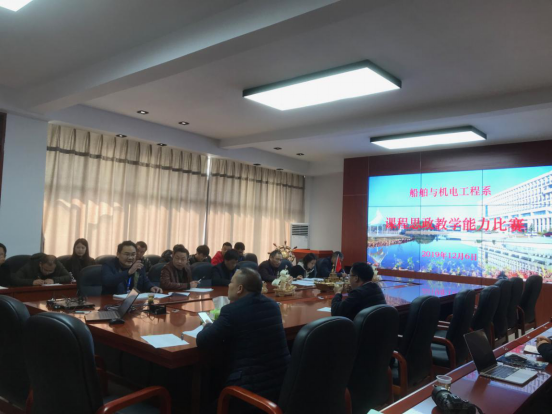 为全面推进习近平新时代中国特色社会主义思想进教材、进课堂、进头脑,落实立德树人根本任务,12月6日,船舶与机电工程系在党员活动室举办了课程思政教学能力竞赛活动。竞赛活动由系主任徐晓昂主持,学院教务处刘建连、公共课部陈娟教授、系邓剑锋教授、曾庆军主任、唐波主任等领导老师组成评委组,系全体专兼职教师观摩竞赛全过程。