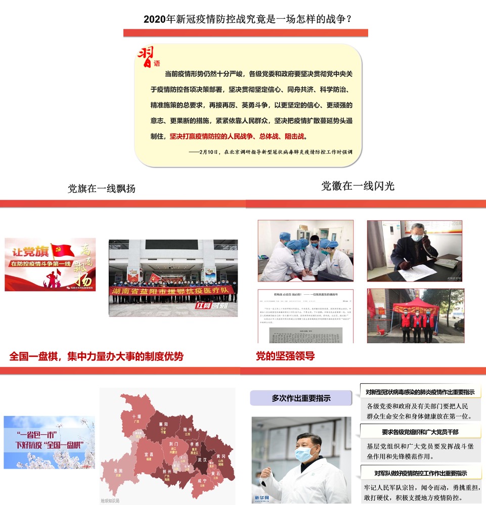 开学第一课,陈娟老师根据学院党委的具体要求,以《中国模式彰显中国力量、中国力量诠释中国特色》为主题录制讲课视频,形成了规范的内容体系和教学流程,对疫情的发生进行了回顾,对党中央的战略部署进行了解读,通过丰富生动的抗“疫”素材,对疫情防控中国模式背后的中国力量,中国力量彰显的中国特色进行了有理有据的分析,引起了学生的极大共鸣与热烈讨论,使学生充分认识了中国特色社会主义制度的优越性和中华民族强大的凝聚力。在讲授马克思主义中国化、毛泽东思想等理论内容时,陈娟老师会将马克思、毛泽东等伟人的精神品质和责任担当精神与2020年疫情防控中90后、00后的突出表现结合起来,引导学生思考新时代的大学生应该怎样履行自己的时代责任、践行自己的使命担当。