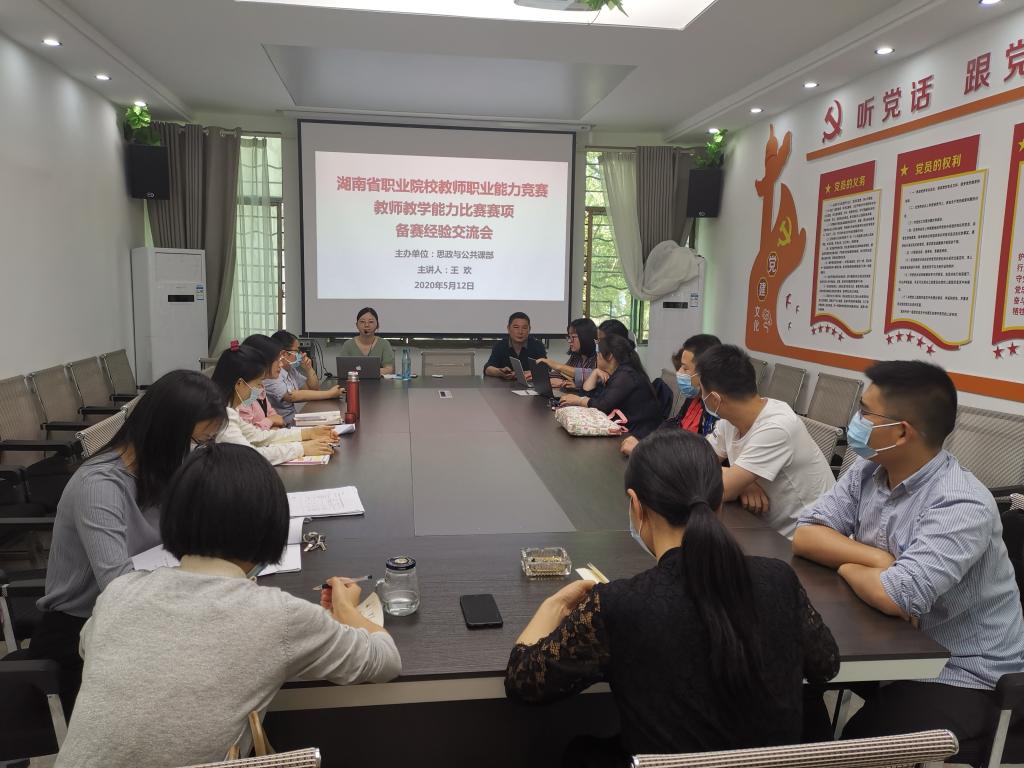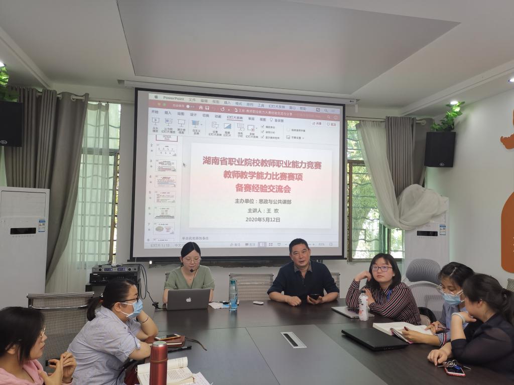 5月12日下午2:30,思政与公共课部在部门党员活动室举行了湖南省职业院校教师职业能力竞赛教师教学能力比赛赛项备赛经验交流会,英语教研室王欢老师(2019省赛一等奖获奖团队负责人)应部门邀请,为2020年部门各教研室参赛团成员作经验交流与分享。