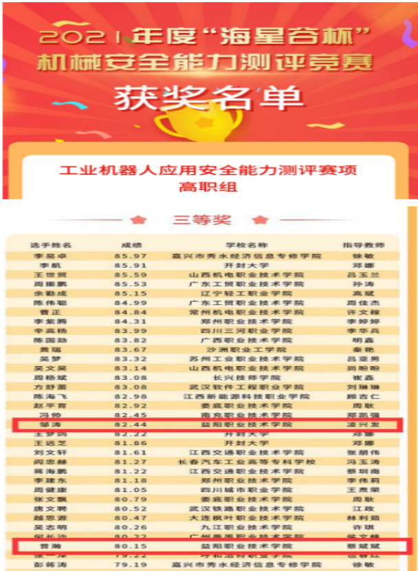 2021年11月6日,由机械工业教育发展中心、全国机械职业教育教学指导委员会主办,海星谷科技有限公司、北京赛育达科教有限责任公司承办的第二届“海星谷杯”全国职业院校(高职组)工业机器人应用安全能力测评赛项中,我院工业机器人专业学生与全国135位选手经过一天的激烈角逐,最终由凌兴发、蔡斌斌老师指导的邹涛、曾瀚两位同学双双荣获全国三等奖。