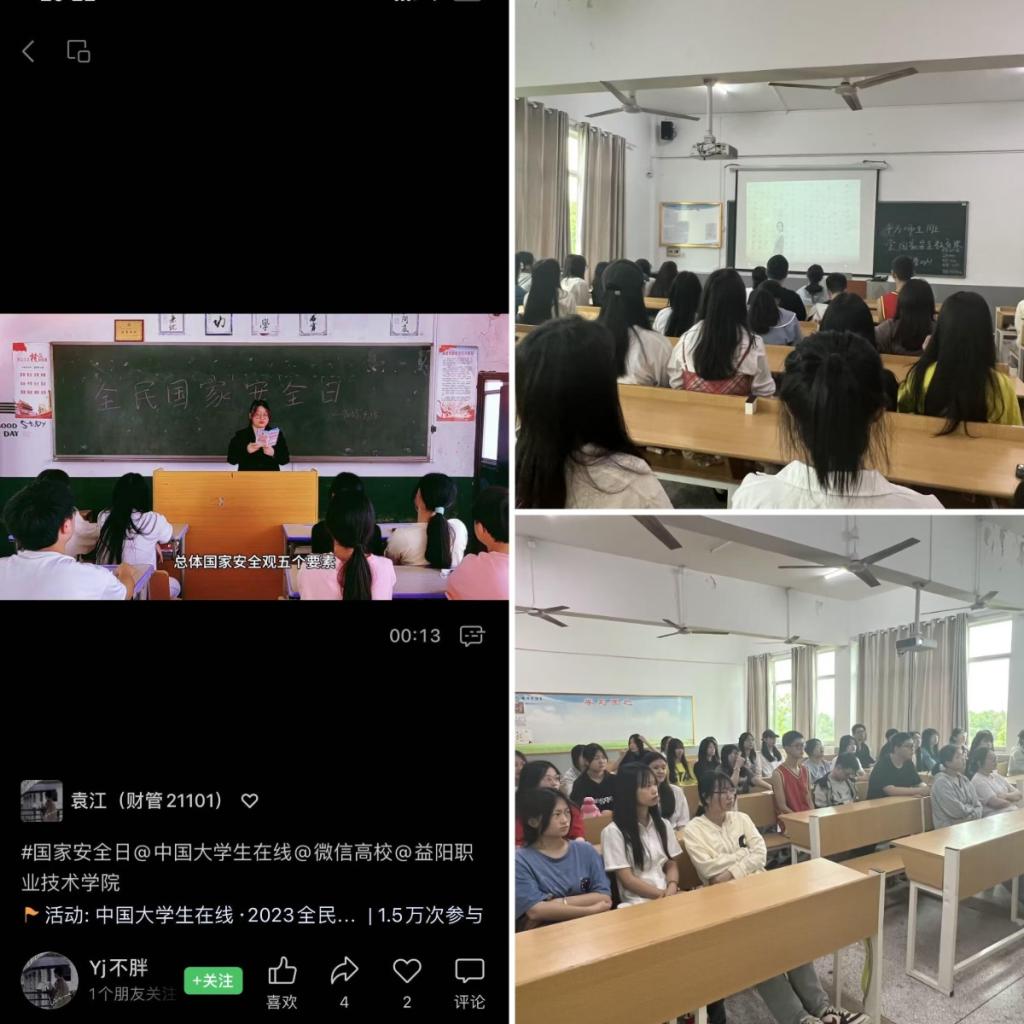 4月14日,根据学校安排,经济管理学院组织全体在校学生,在教室一起观看“千万师生同上一堂国家安全教育课”和“国开大讲堂国家安全教育公开课”,并组织学生关注微信视频号,积极参与话题讨论,分享有关国家安全的知识。