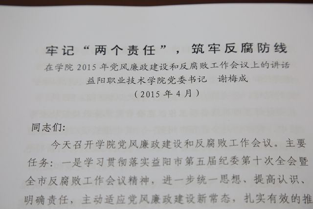 谢书记首先传达了益阳市第五届纪委第十次全会暨全市反腐败工作会议精神,然后部署学院2015年党风廉政建设和反腐败工作。谢书记重点强调五个方面的问题,一要认清形势,不断增强抓好党风廉政建设和反腐败工作的责任感和紧迫感;二要加强领导,落实“两个责任”;三要坚持全面从严治党,严守纪律规定;四要践行“三严三实”,深化作风建设;五要坚持标本兼治,构建惩防体系。