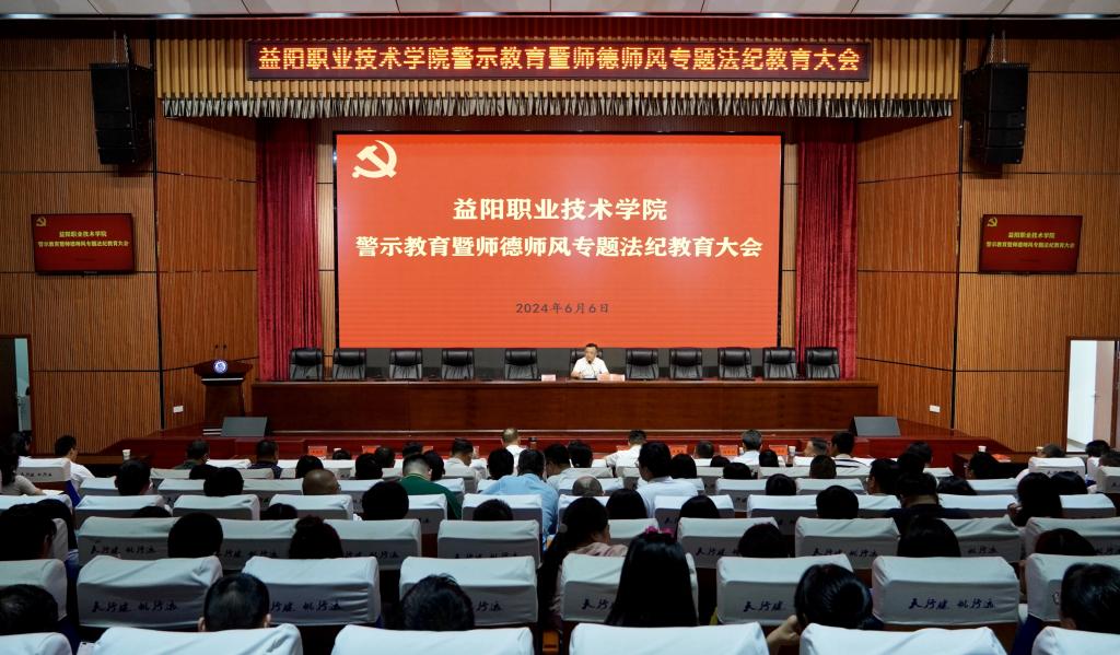 6月6日,益阳职业技术学院召开警示教育暨师德师风专题法纪教育大会,进一步深化党纪学习教育,加强廉政、警示教育和师德师风法纪教育。学校党委书记胡康平上纪律党课暨师德师风专题法纪教育课,党委副书记、校长黄维民主持,党委委员、纪委书记陈国良剖析学校近年来查处的违纪典型案例,全体在家校领导和教职员工参加会议。