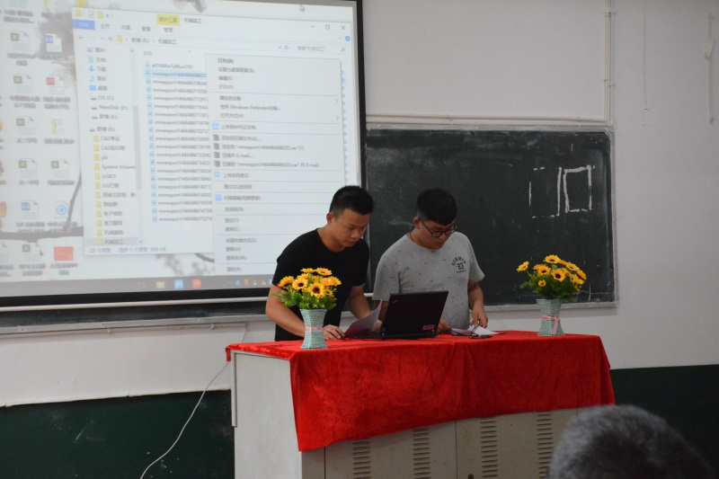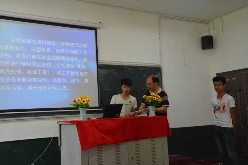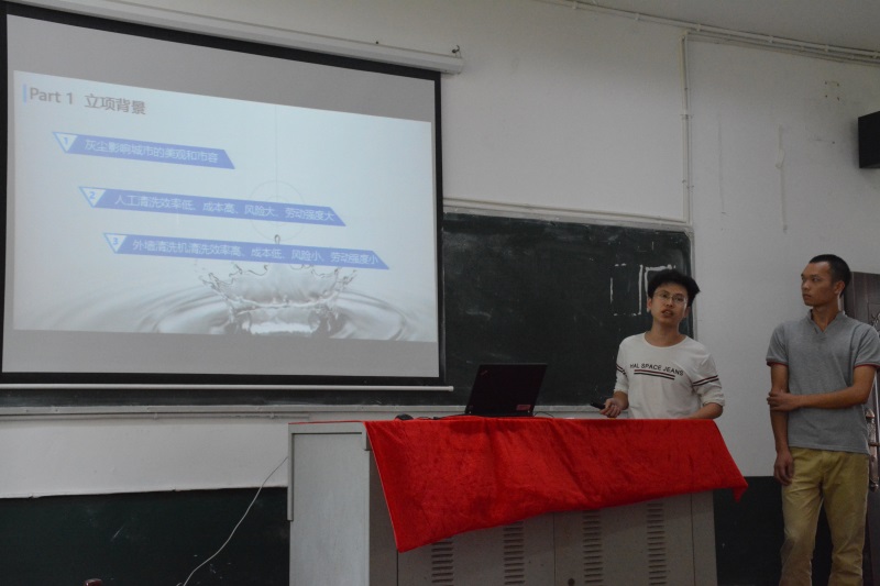 本次比赛的主题是“拥抱互联网+时代,共筑创新创业梦想”。参赛选手分为4组,分别由专业教师带队,并进行了精心准备。第一组参赛团队的创意作品是“基于互联网的智能型高楼外墙清洗机”,即一款将机械原理与互联网相结合的自动化清洗机,可高空作业,用于实际将节省大量人力物力。其他参赛团队的作品有“基于互联网的Baby秀项目”“益阳精智粉末冶金有限责任公司”“机械设计创造”。他们分别从项目开发创意、经营管理与运作方案、盈利模式、产品的投资风险,产品可行度以及产品未来发展前景等方面做出细致分析。