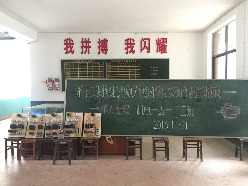 这次作品展是我系机电一体化专业15122班的实训成果。在电机与电力拖动课程实训周中,陈卓勋老师采用以学生动手为主的教学方式,将班级学生分为11个小组,每4名成员需配合完成一个电路图。陈卓勋老师现场指导,详细介绍和讲解各类线路图的原理构造和设计理念,并对线路图的美观性、安全性做出要求,解决学生实际操作中遇到的问题。通过一周的努力,各组成员纷纷完成了自己的作品,“一节操作课能抵得上十堂理论课程所学的知识”学生自豪地说道,这些电路图不只是展示品,每一个都具有实用价值,都能通电演示。