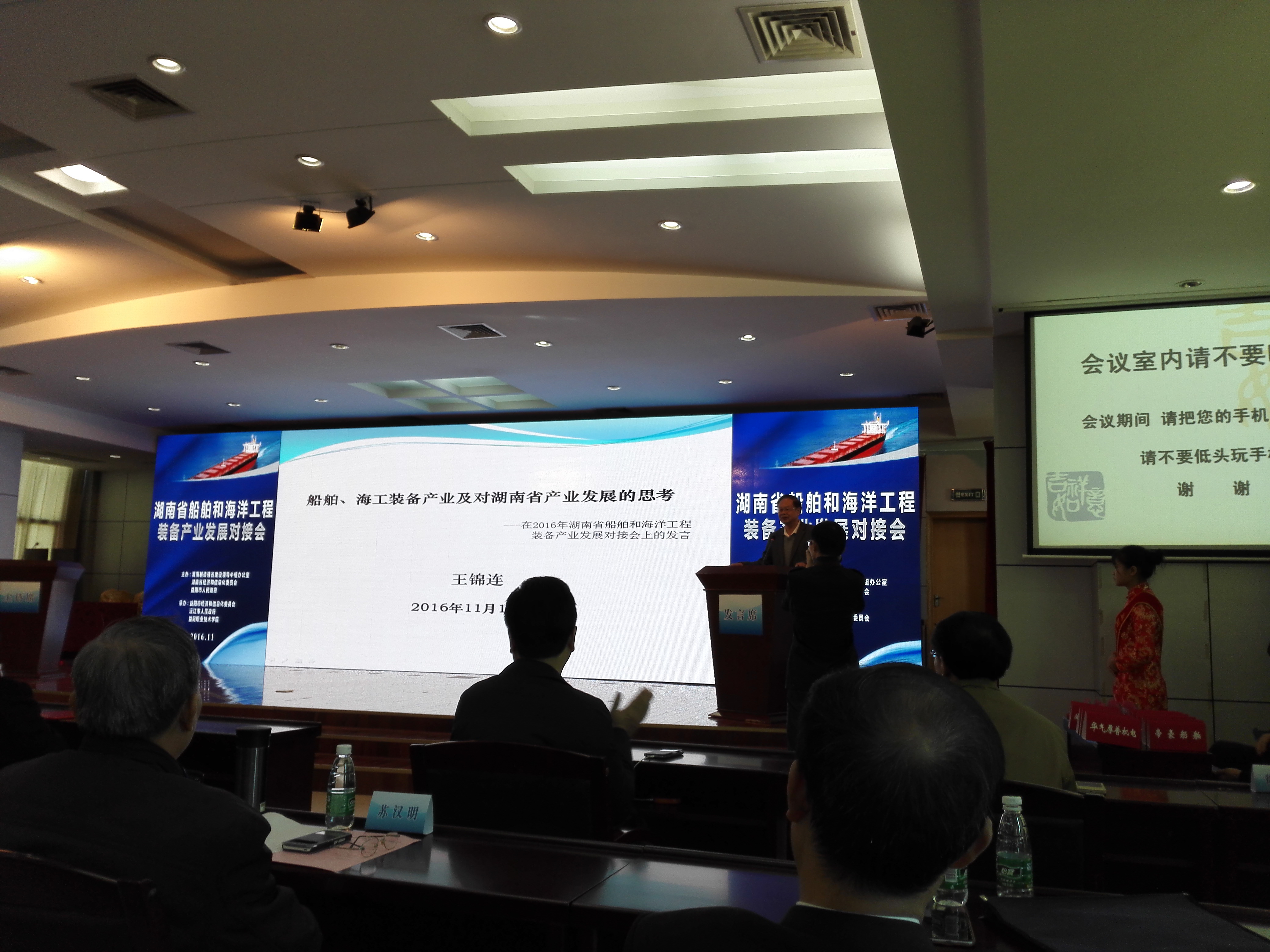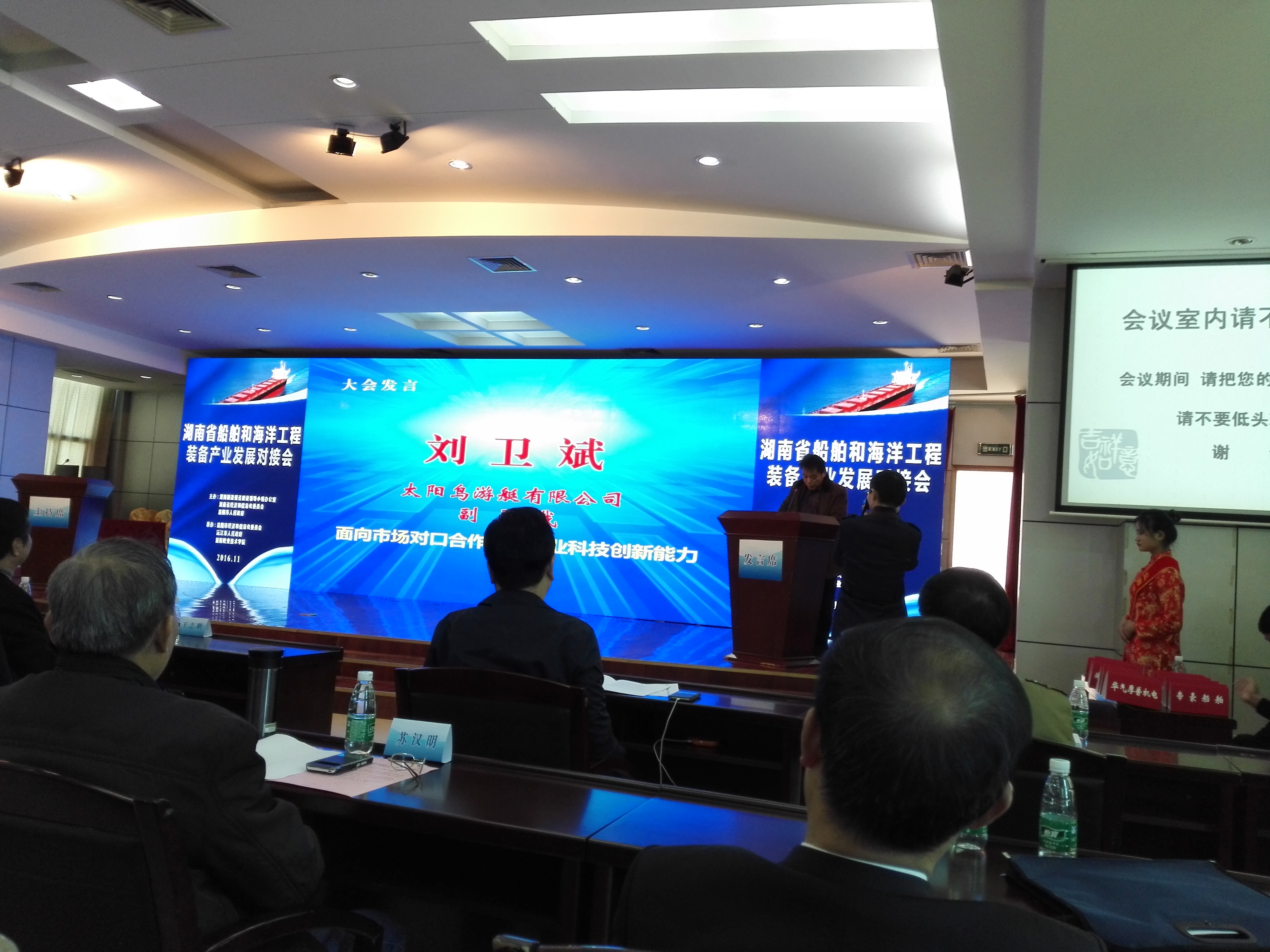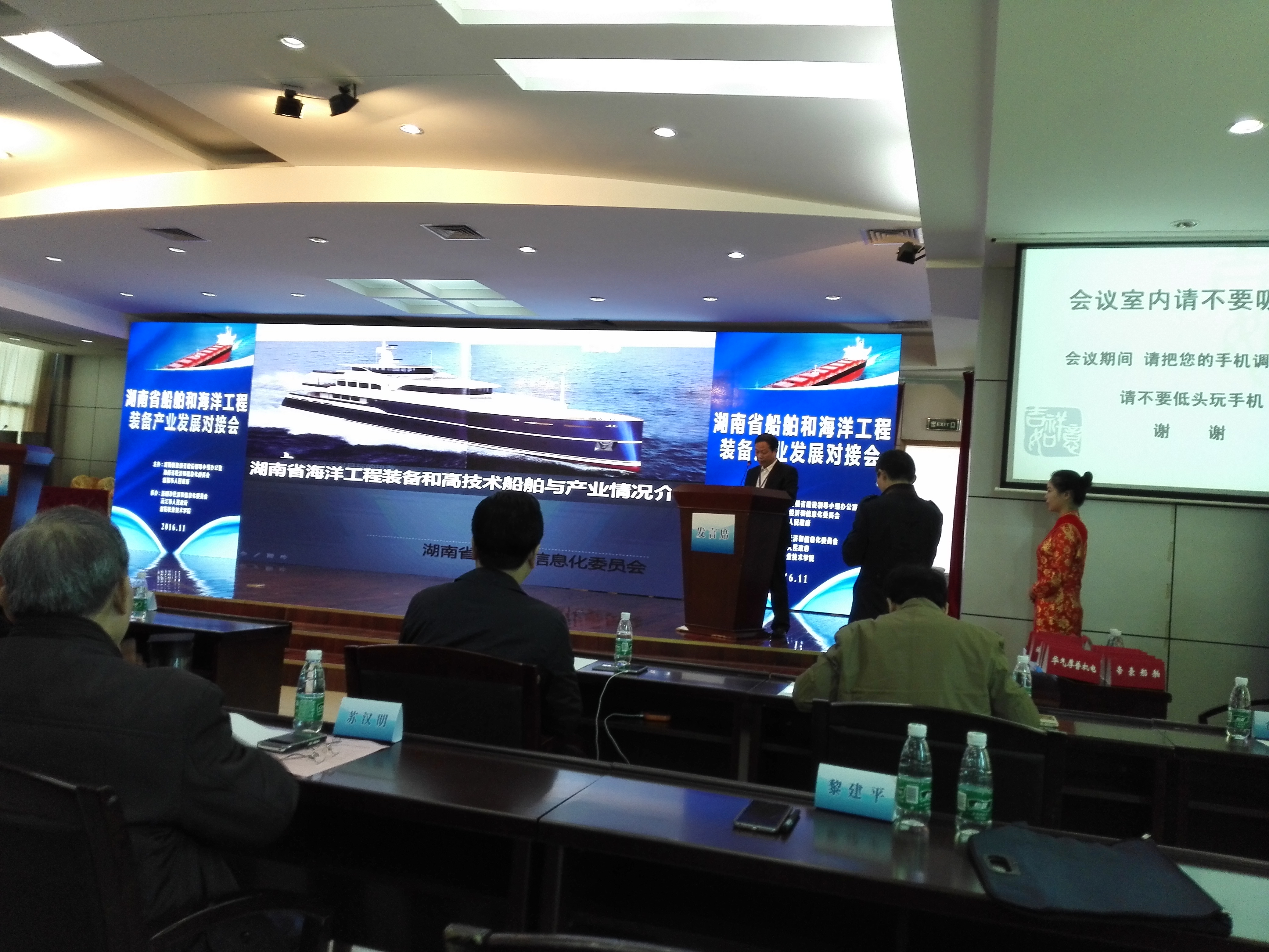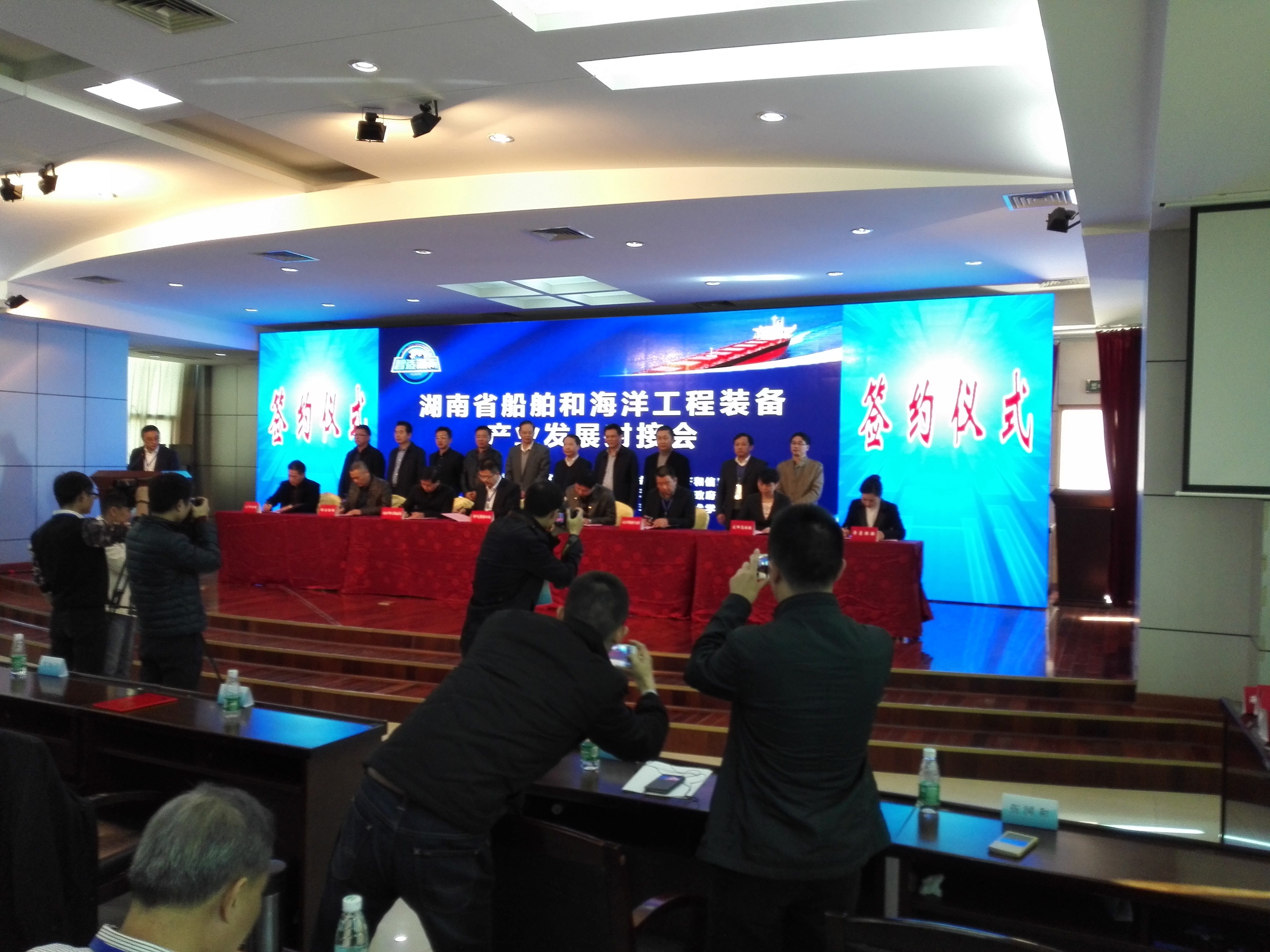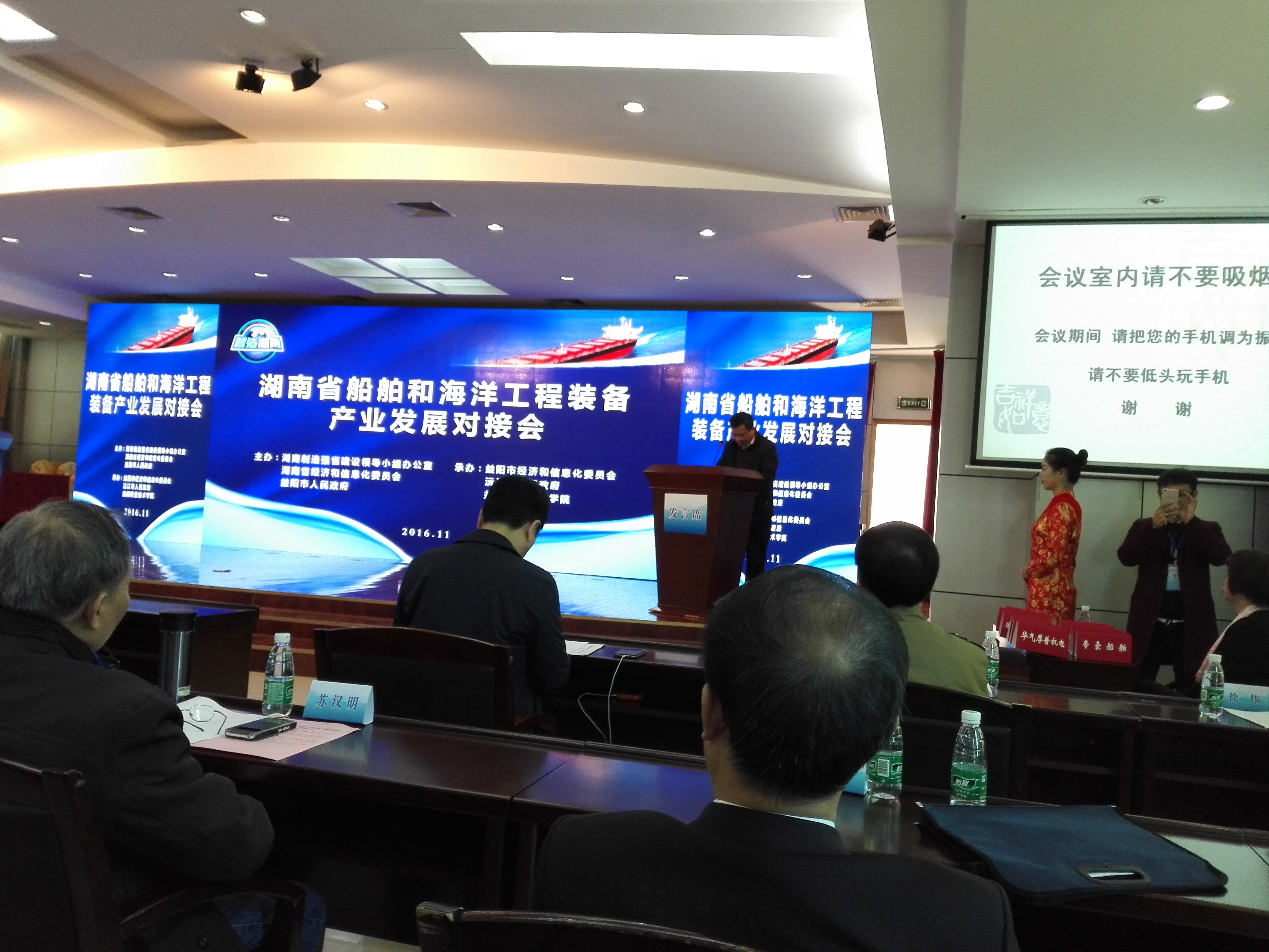湖南省船舶和海洋工程装备产业发展对接会于11月8~10日在沅江市人民政府一号会议厅举行。大会由湖南省制造强省建设领导小组办公室、湖南省经济和信息化委员会、益阳市人民政府主办,由益阳市经济和信息化委员会、沅江市人民政府、益阳职业技术学院承办。参加会议的有:湖南省发改委、科技厅、财政厅、国土局、环保局、水利厅、旅游局、中国船级社武汉分社、益阳市人民政府办公室、益阳市经信委、发改委、科技局、财政局、国土局、环保局、水务局、旅游局、湖南省人民银行长沙分行、湖南省进出口银行、湖南省工商银行、建设银行、邮政储蓄银行、浦发银行、华融湘江银行、益阳市人民银行、湖南省船级社长沙分社、株洲市经信委、湘潭市经信委、衡阳市经信委、邵阳市经信委、岳阳市经信委、常德市经信委、郴州市经信委、永州市经信委、怀化市经信委、娄底市经信委、湘西自治州经信委、九华经开区、城陵矶新港区、沅江市人民政府、沅江市科工局、发改委、财政局、水利局、环保局、国土局、文广新局、海事局、人民银行、农发银行、邮政银行、信用社、浦发银行、中国银行、建设银行、工商银行、农业银行、智能研究总院、华菱湘钢、华菱涟钢、华菱衡钢、湘电集团、泰富重装、三一集团、中铁五局、中车时代电气、湘江涂料、妙盛动力、科力远、晗光电子、广东机器人、山河游艇、金杯电工、永盛船舶、天天游艇、南方宇航、利欧集团、达门船舶、龙宏船舶、海鹰船舶、岭北船舶、湘南船舶、宏宇造船、神州游艇、双鱼游艇、恒盛机械、金瀚船艇、镇波船舶、东方红船舶、龙飞造船、白沙湖船舶、小河嘴船舶、港口船舶、金航船舶、黄茅洲船舶、共华水利、泗水船舶、三环船舶、兄弟船舶、精一科技、源发船舶、大洋机械、沅江化纤、金宇机电等。