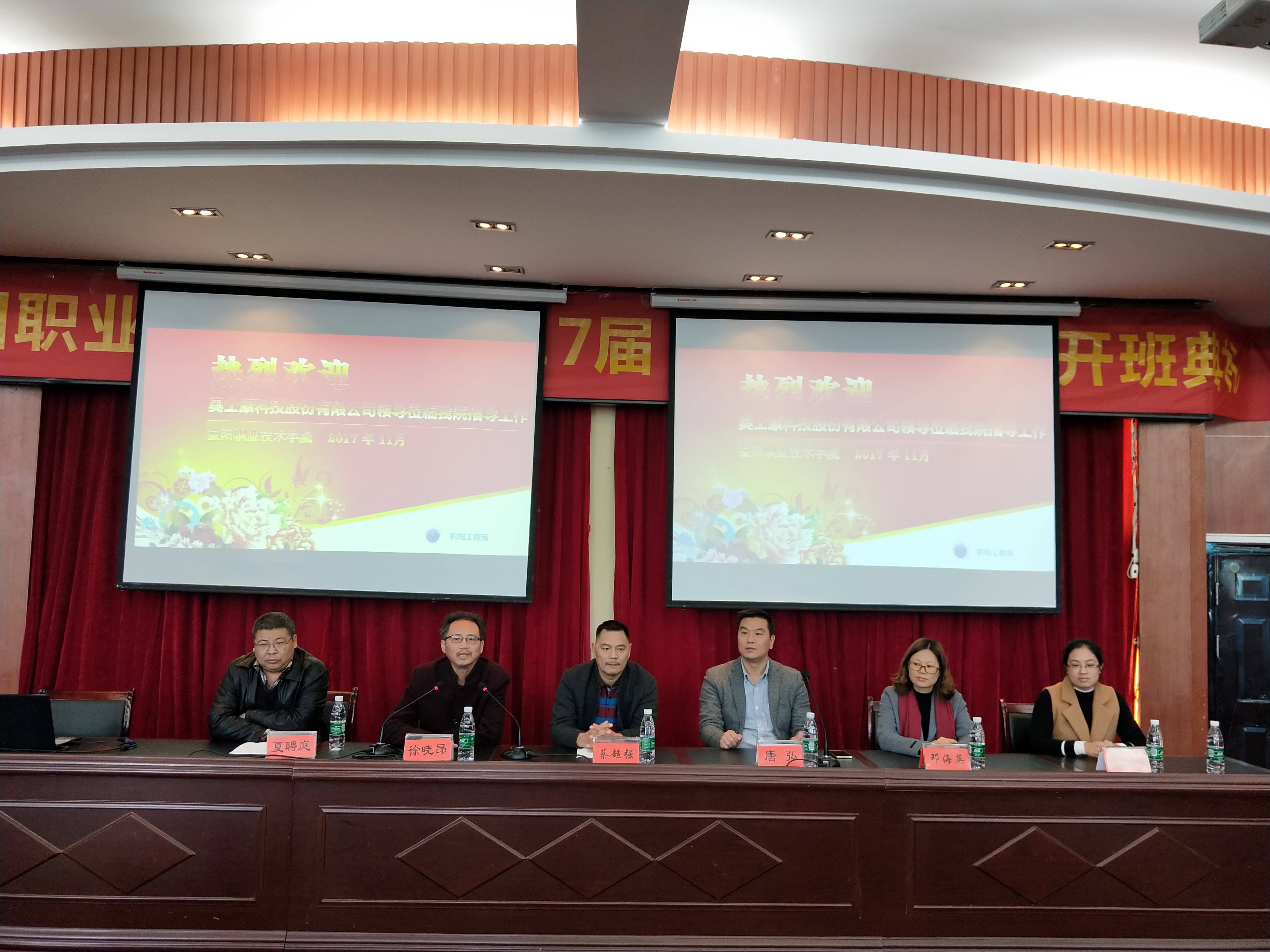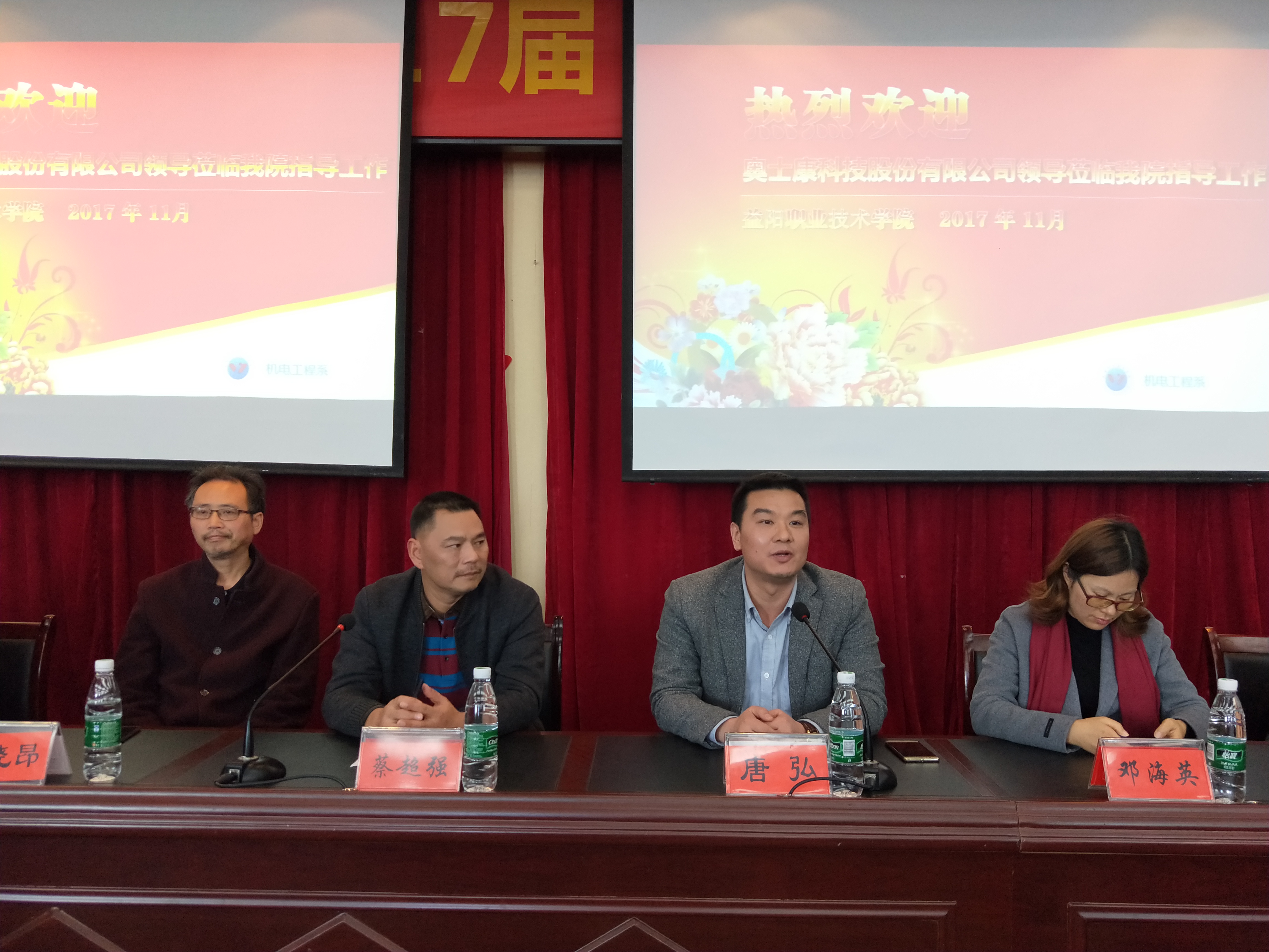 校企合作企业文化进校园 ----暨2017届奥士康班开班典礼 2017年11月23日下午2点30分,奥士康科技股份有限公司董事长助理唐弘先生、人事经理邓海英女士、人事课长张枚芬女士、人事干事蔡艳丰女士一行来学院参加校企合作企业文化进校园---暨2017届奥士康班开班典礼。