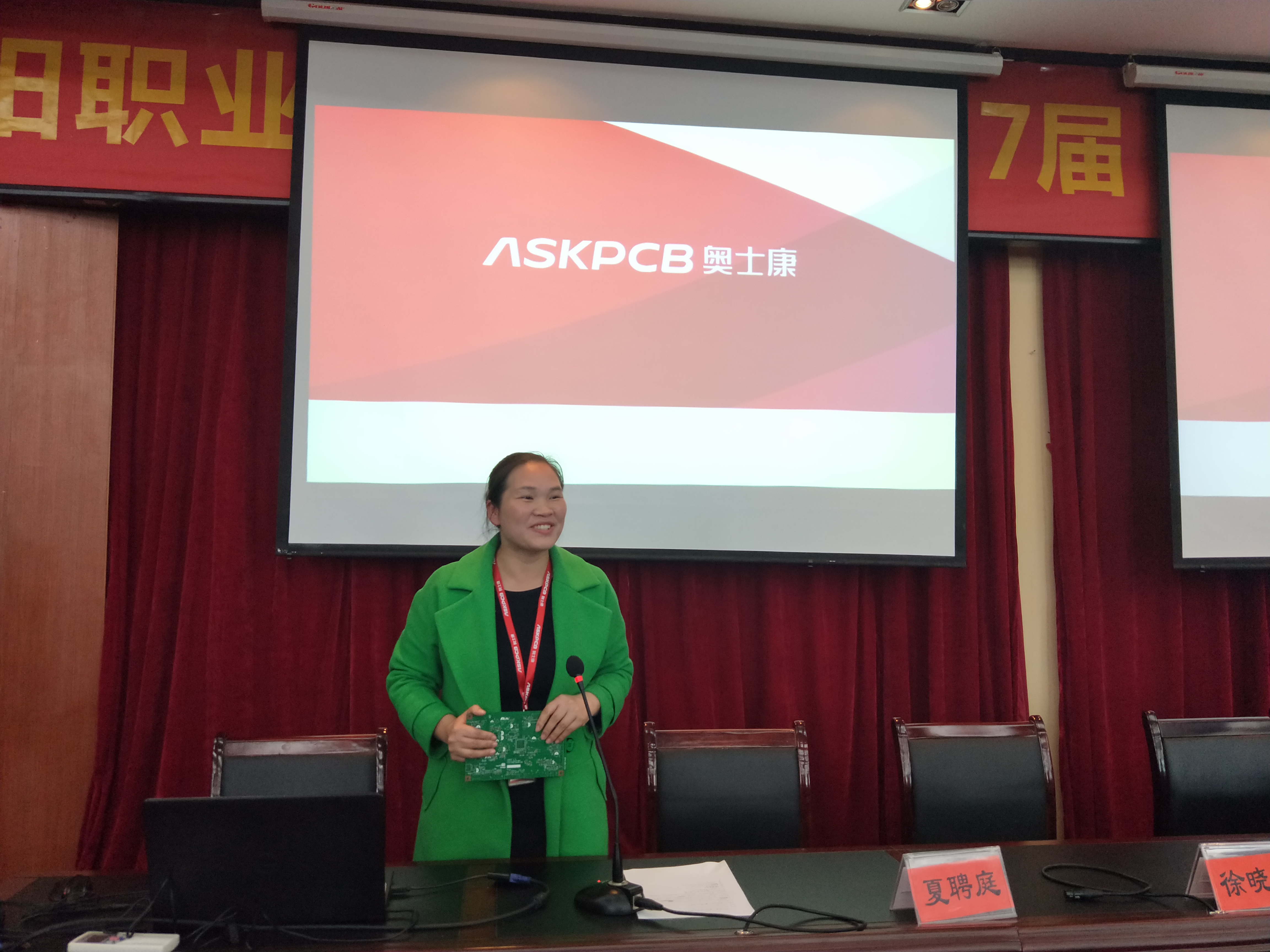 奥士康董事长助理唐弘先生代表公司致辞,从公司产品PCB版谈起到当前的手机物流网集成电路;从企业文化到公司在深交所上市;从公司董 事长创业到回馈家乡人才等,唐先生渊博学识和广阔阅历赢得同学们阵阵掌声。然后,人事课长张女士介绍了公司情况,与在座同学探讨就 业与实践,校企合作的直接有益之处,希望大家能很好地完成身份转换。人事干事蔡女士则以生动的视频影像和PPT介绍公司的方方面面。