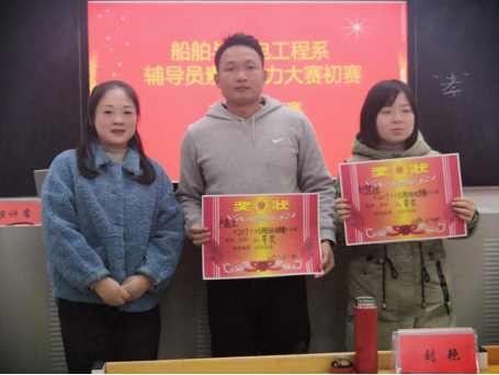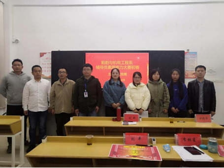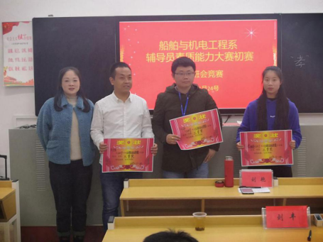 2019年11月24日星期日晚上7点00分,船机系于船舶大楼102教室举行“辅导员素质能力大赛初赛——主题班会竞赛”,会议由学工办主任沙之舟老师主持,到场人员有系副主任刘艳老师,辅导员胡晨晨、刘慧妮、卢嘉立、刘丰、刘佳、李林星等老师。