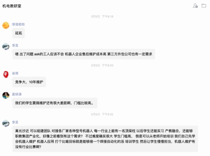 本次关于工业机器人学习的教研教改活动,通过线上集中学习,工作群在线讨论等方式顺利展开。目前疫情防控形势依然严峻,但教学秩序不能乱,工作质量不能降。会议形成广泛认识:全体老师必须努力学习,积极跟踪产业前沿,积极探索大数据、人工智能对专业发展的深远影响,深入开展校企合作,将现代学徒制人才培养全面推向深入!