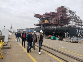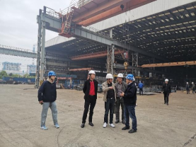 在芜湖造船厂有限公司人力资源部部长刘明明陪同下,曾立波一行先后参观了芜湖造船厂展览馆、分段生产车间、下水船台、舾装码头,刘明明详细介绍了芜湖造船厂的发展历史、生产环境与硬件设施条件,以及在造订单船的相关情况。