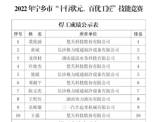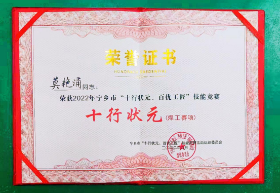 值得一提的是,在现代学徒制模式的培育下,我院刚毕业的焊接19101班莫艳涌同学便在今年宁乡市“十行状元、百优工匠”焊工技能竞赛中一举夺魁,荣获“十行状元”荣誉称号。