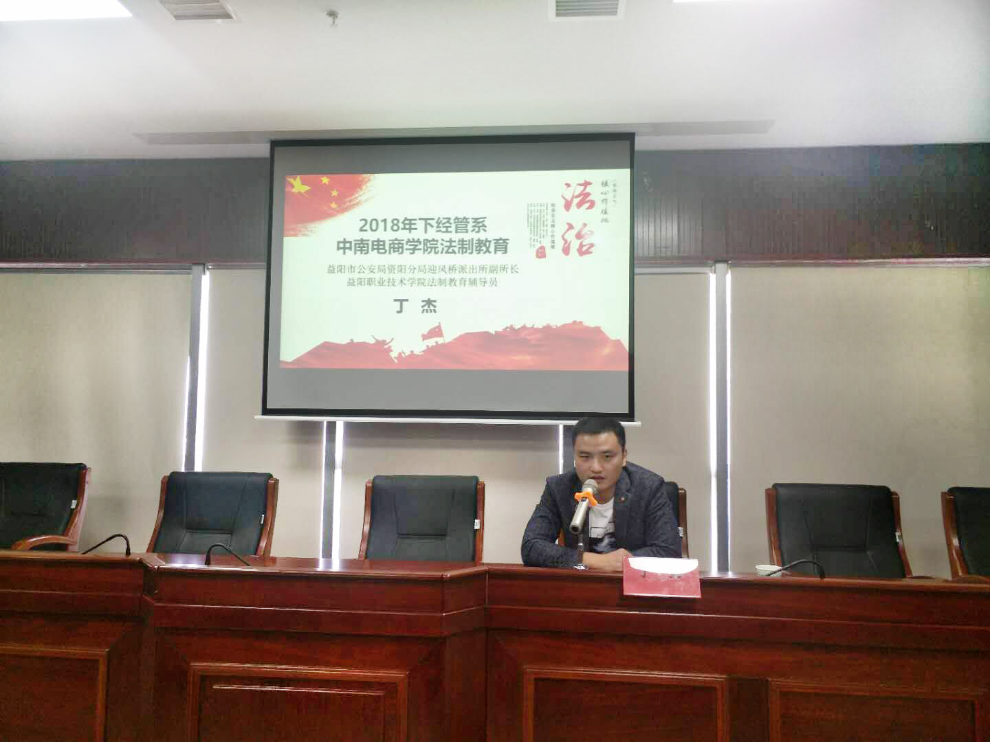 为加强开放性园区学生安全管理,增强学生法律意识,营造平安、和谐、文明的校园育人环境,根据学院“安全教育活动月”通知的具体要求,益阳职业技术学院第三场法制教育专题讲座于2018年10月16日下午14:30在中南电商学院三楼会议室成功举办。会议邀请到益阳市公安局资阳区分局迎风桥派出所副所长、学院法制教育辅导员丁杰警官主讲。学院党委委员、纪委书记周凤仙、学院学生处副处长、团委副书记陈瑛、经管系党总支书记唐超文出席,中南电商学院三个班级共164人参加,讲座由李志华老师主持。