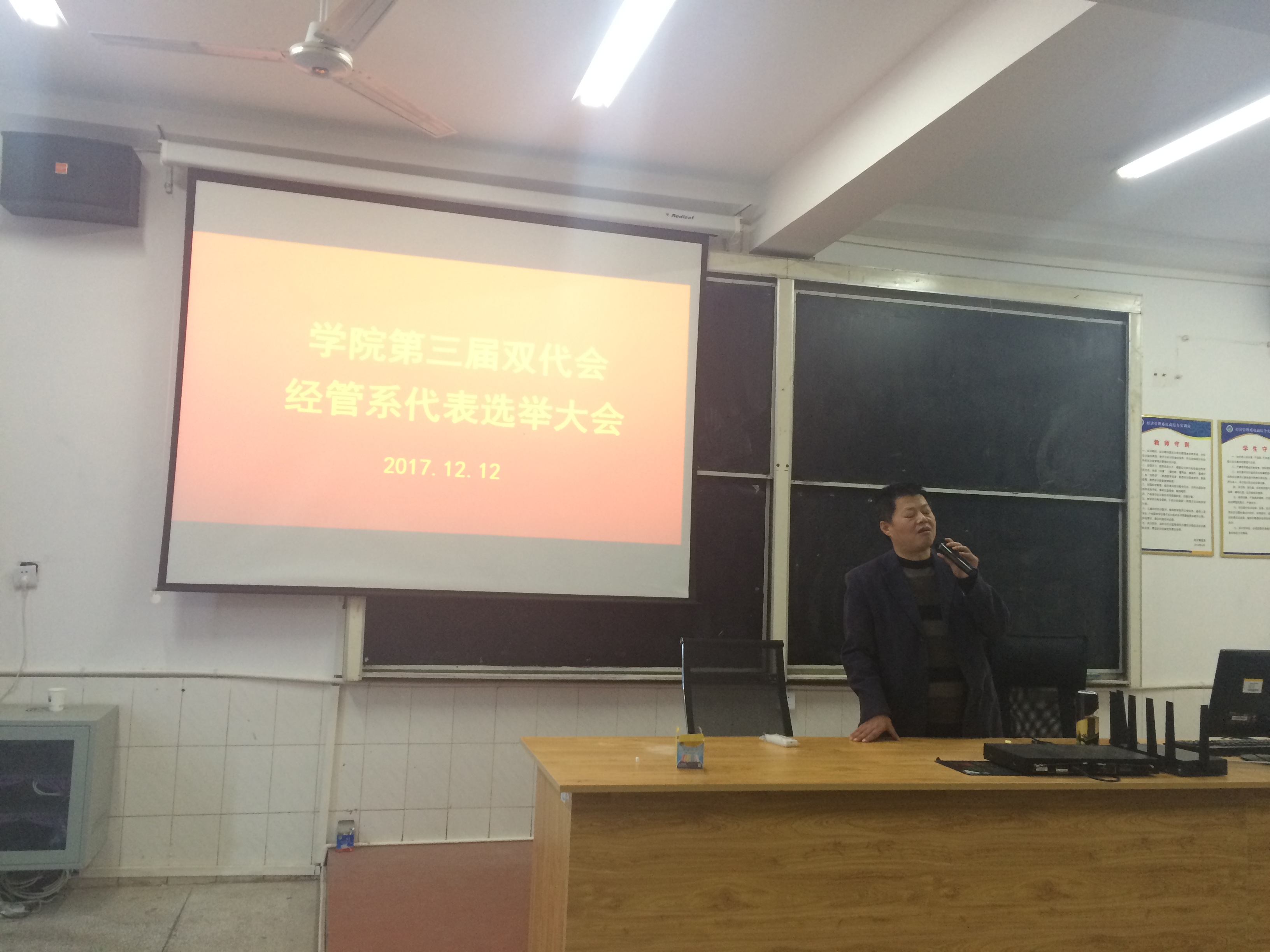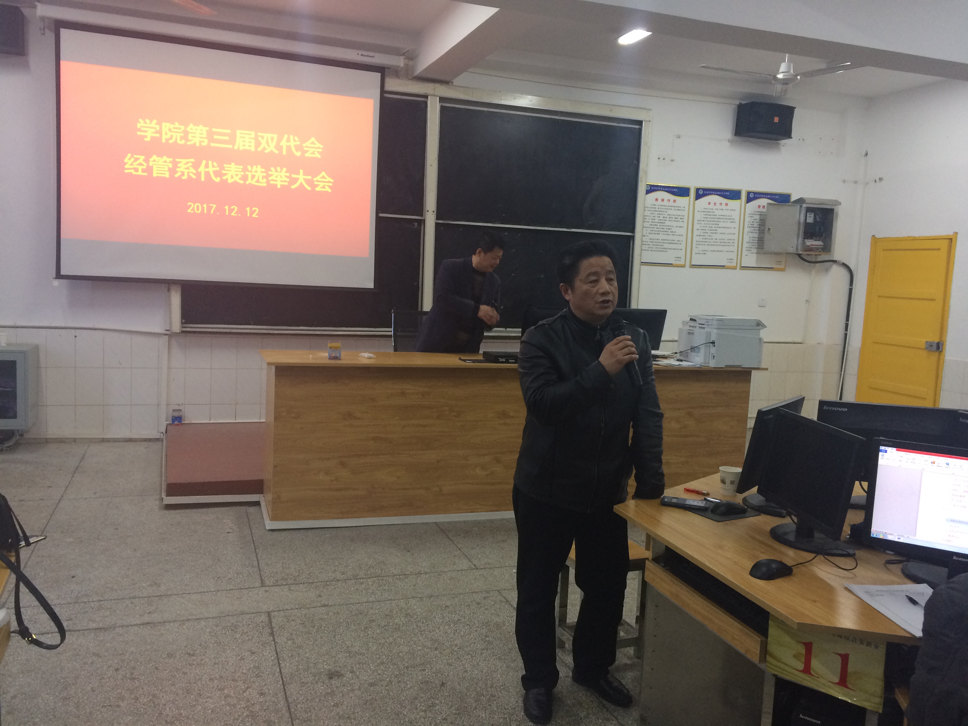 2017年12月12日下午2点,经管系在2教704教室召开了系部案例化教学比武选拔赛暨工会会员换届选举会议,会议由经管系主任吴自力主持,副院长杨建华出席了会议,全体专、兼职教师参会。