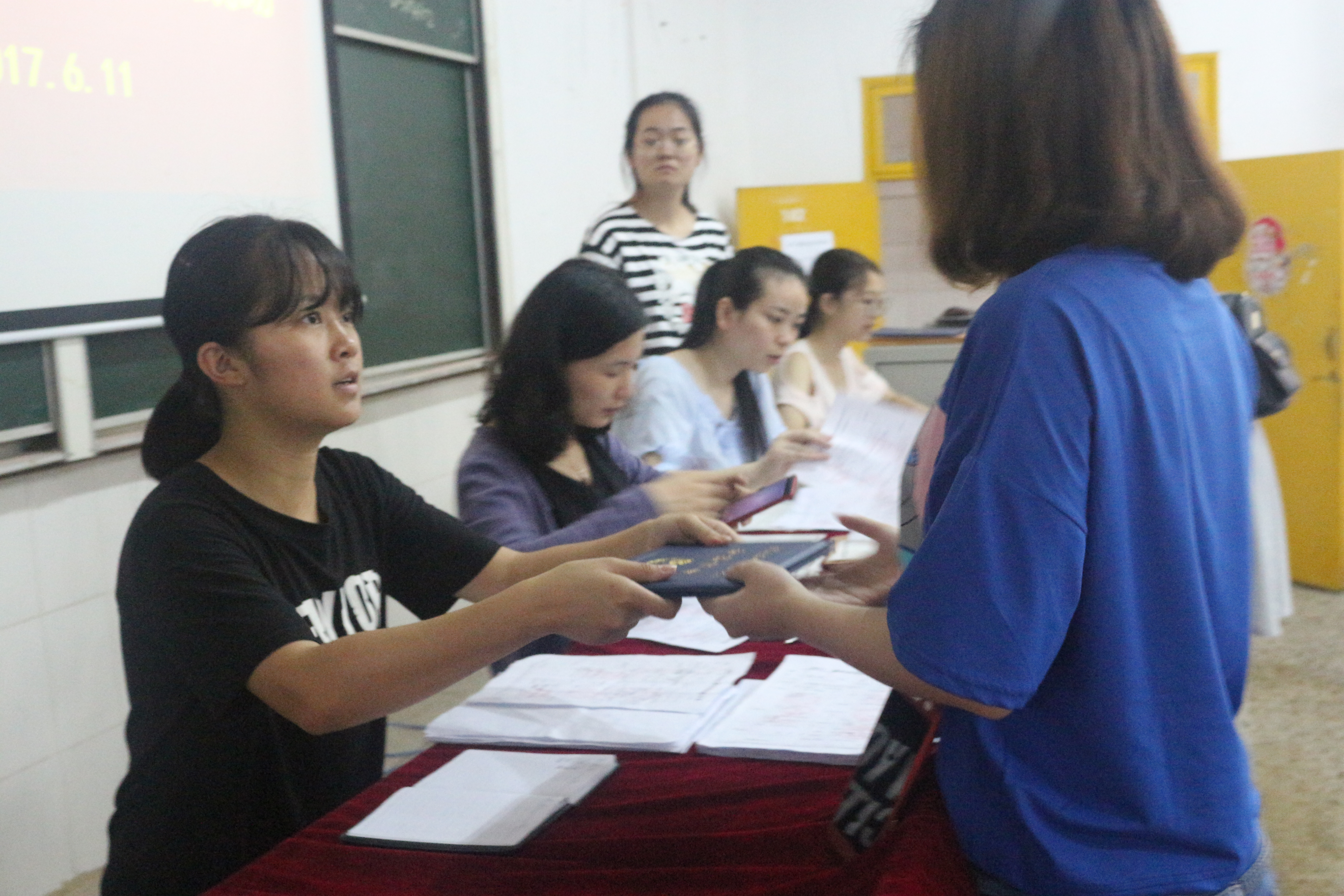2017年6月11日,经管系学工办主任刘慧予及应届毕业生辅导员廖蕾、匡栩葭等老师在二教102为2017届毕业生颁发毕业证书。