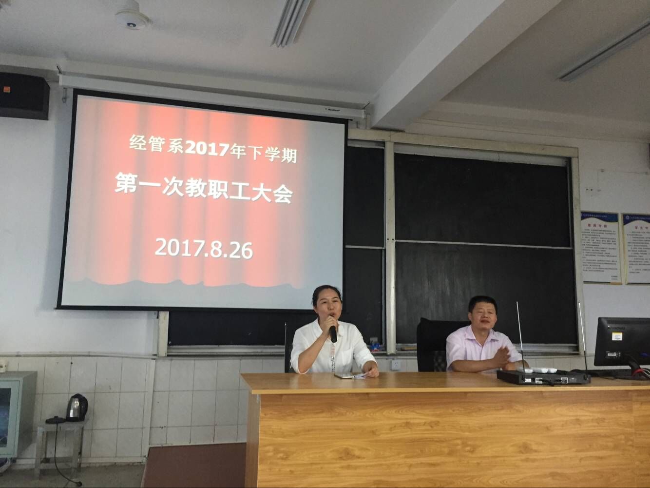 2017年8月26日下午2点,经管系在二教704召开了2017年下学期第一次教职工大会,会议由系主任吴自力主持,系党总支书记唐超文出席会议,经管系全体教职工参会。