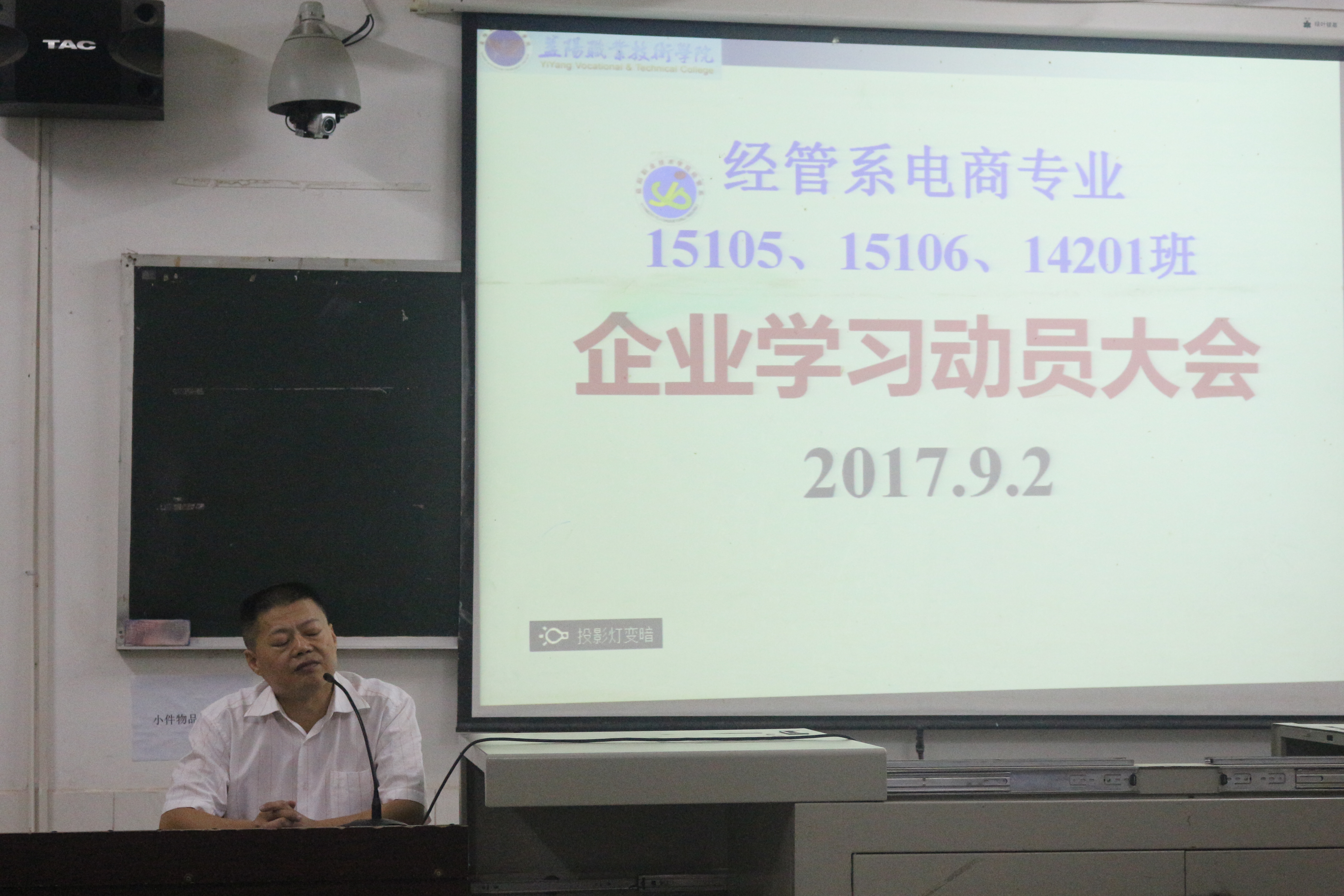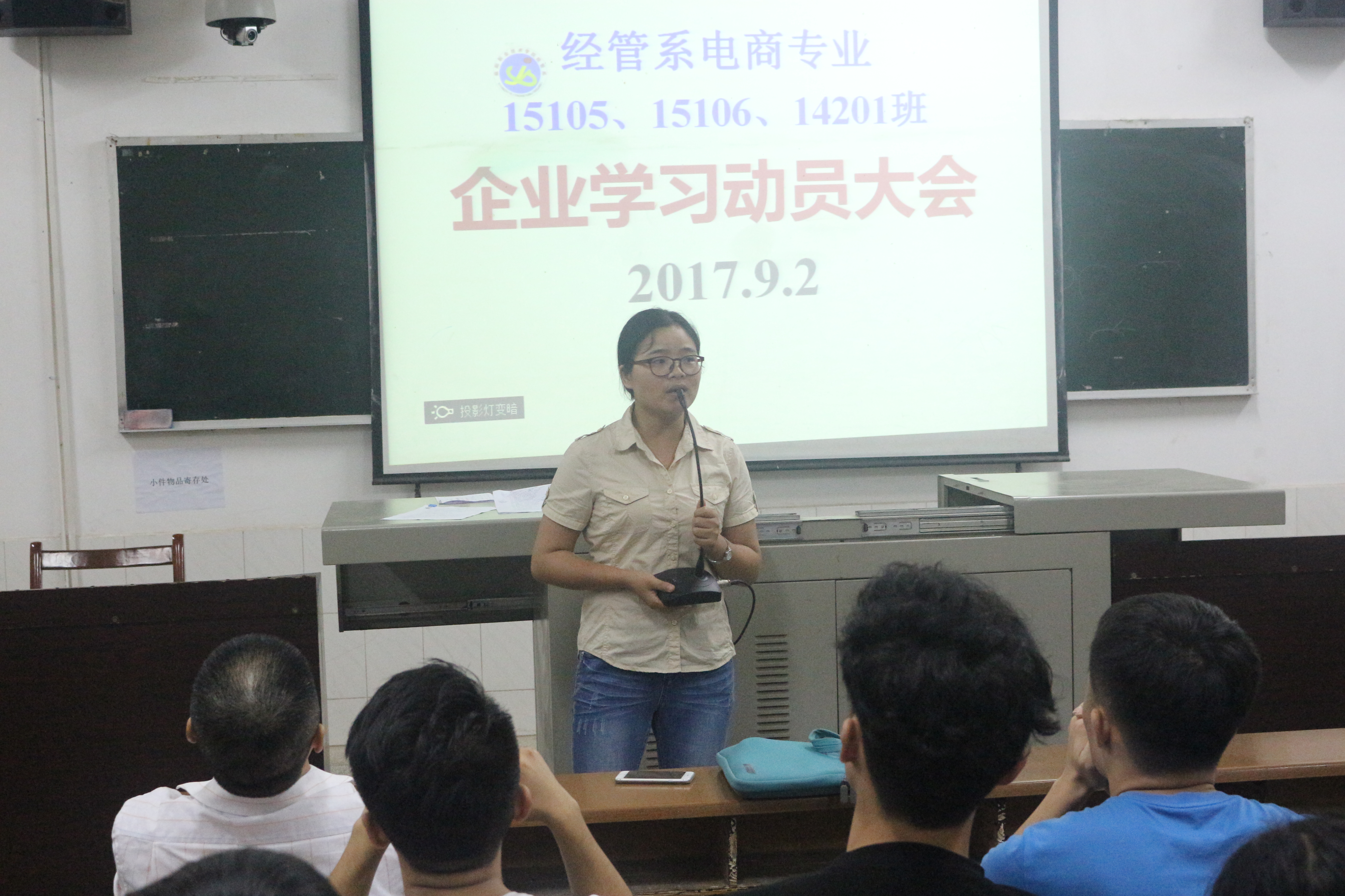 2017年9月2日,经管系电商专业企业学习动员大会在二教206顺利举行。参加本次大会的有:经管系系主任吴自力、电商教研主任王静萍、辅导员黄锦珊老师、蔡文馨老师及电商专业15105、15106、14201班全体同学。