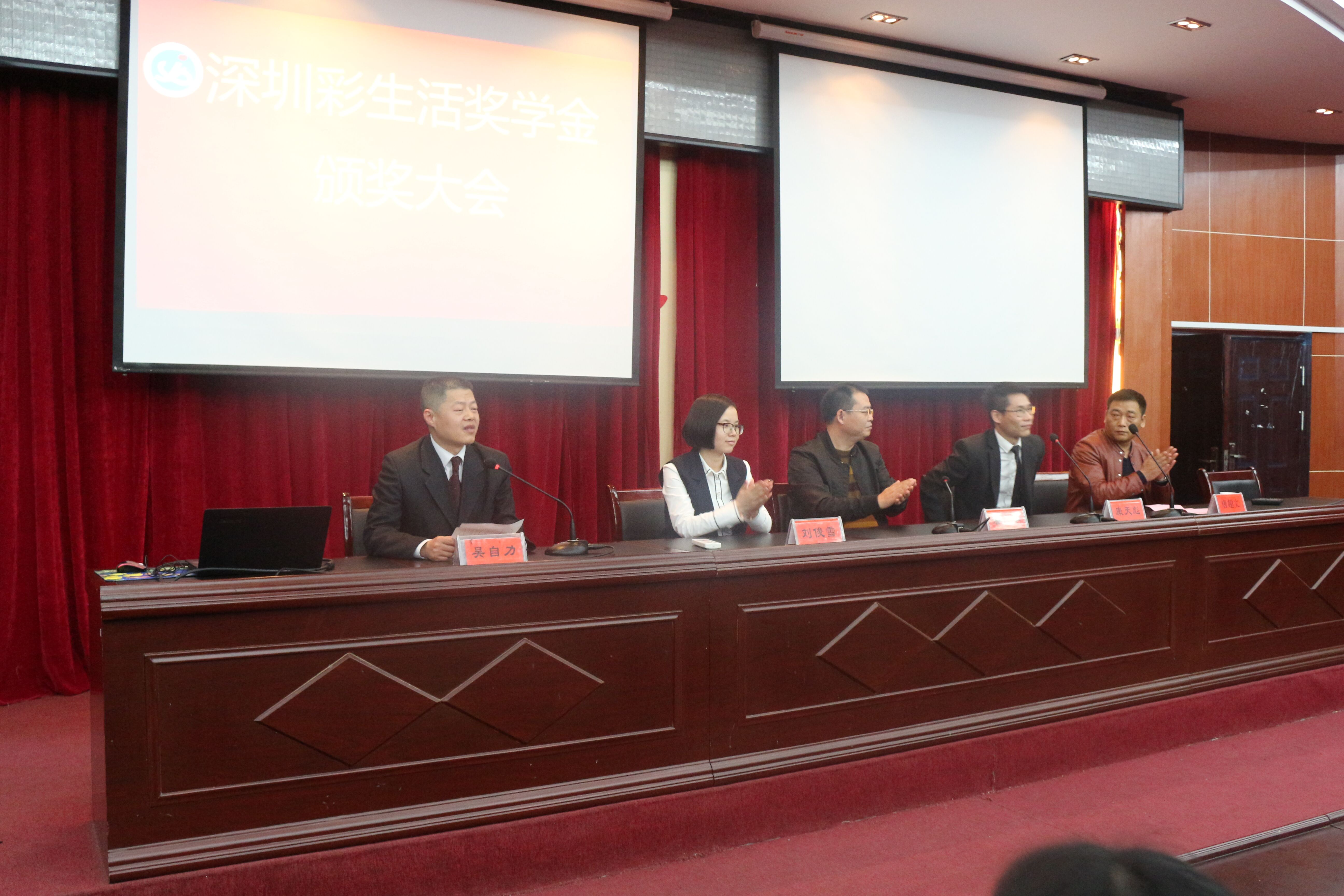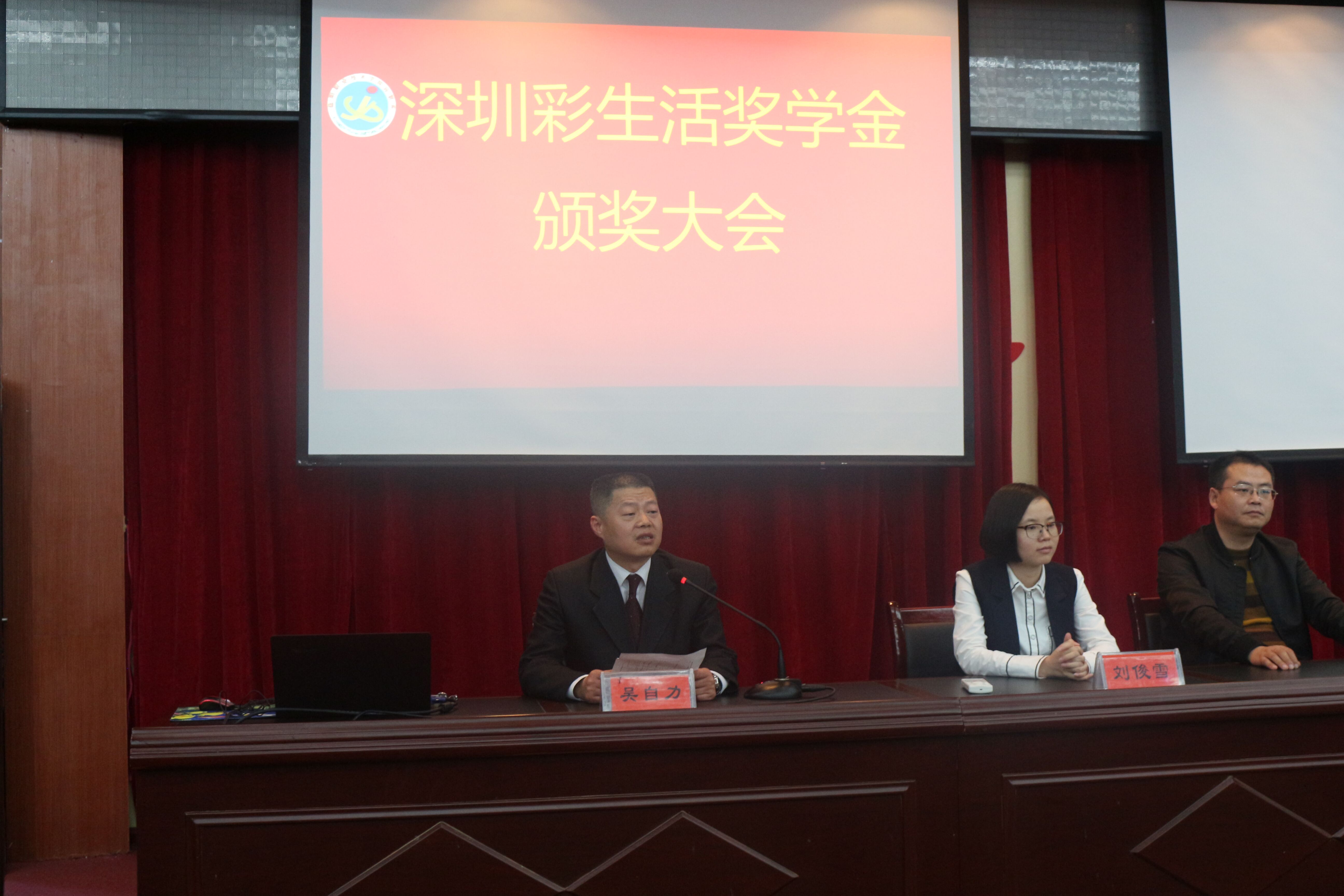 2017年4月6日下午4:20,深圳彩生活奖学金颁奖大会在益阳职业技术学院六教三楼隆重举行。本次到会的有:深圳彩生活人力资源中心薪酬绩效总监康天彪及公司代表刘俊雪,副院长潘访华,经管系系书记吴自力,经管系党总支书记唐超文,经管系教务办主任刘建连,经管系学工办主任刘慧予、赵昭仪老师、李佳美老师,经信16101辅导员廖蕾老师及全班同学,经管系团学会全体干部和经管系各班班长、团支书。本次大会由经管系系主任吴自力主持。