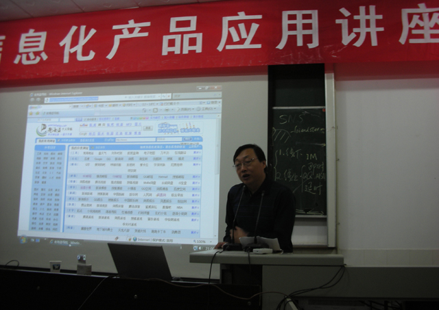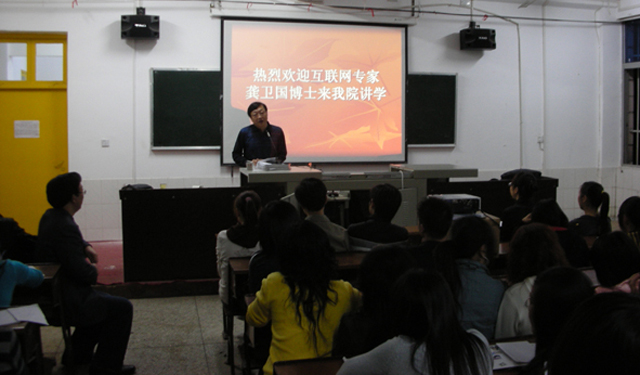 2008年10月22日,互联网专家龚卫国博士来我院经贸系讲学,与经贸系系主任、电子商务教学负责人洽谈校企合作事宜。黄科军老师、王静萍老师、夏焘老师、蒋斌老师参加此次讲座。