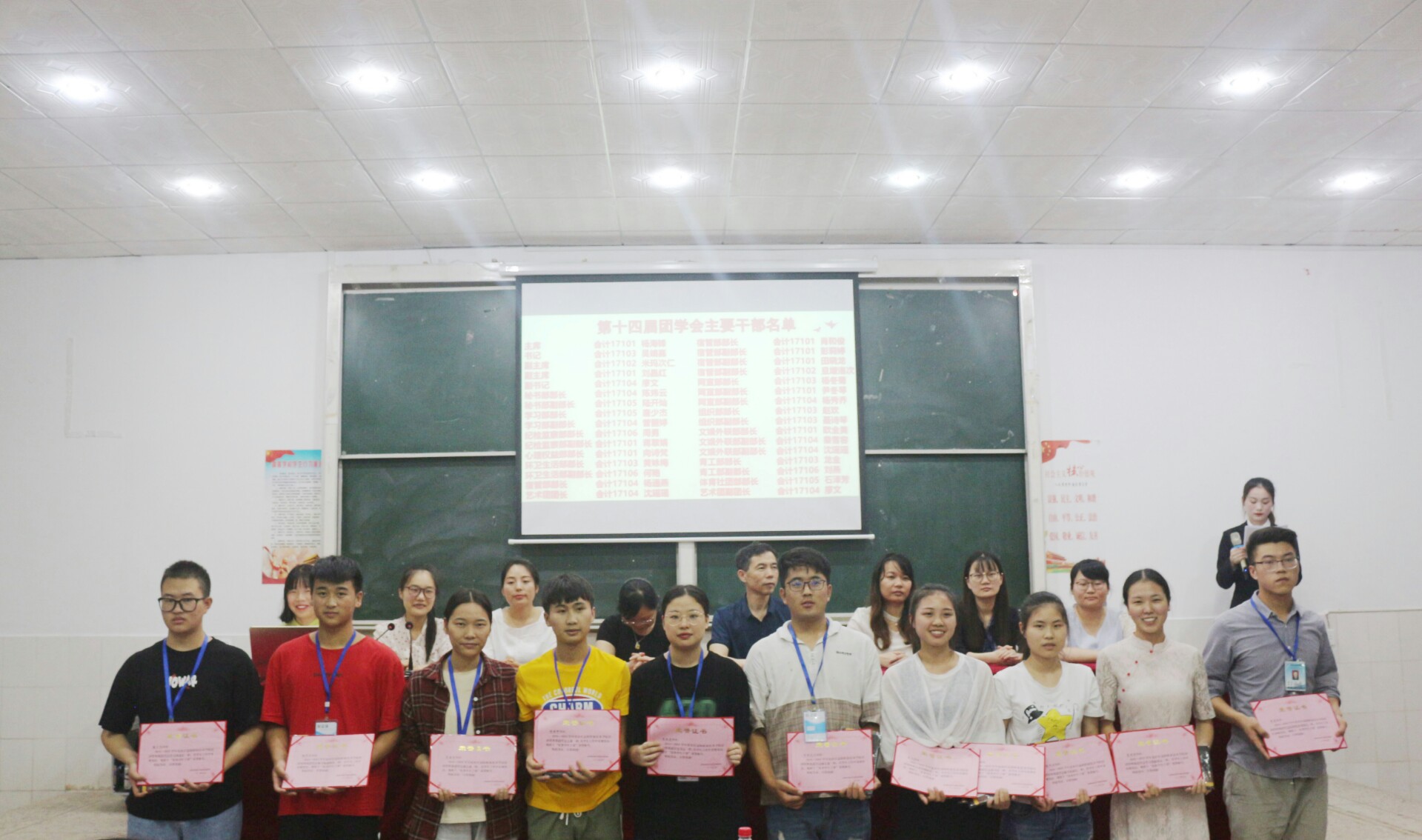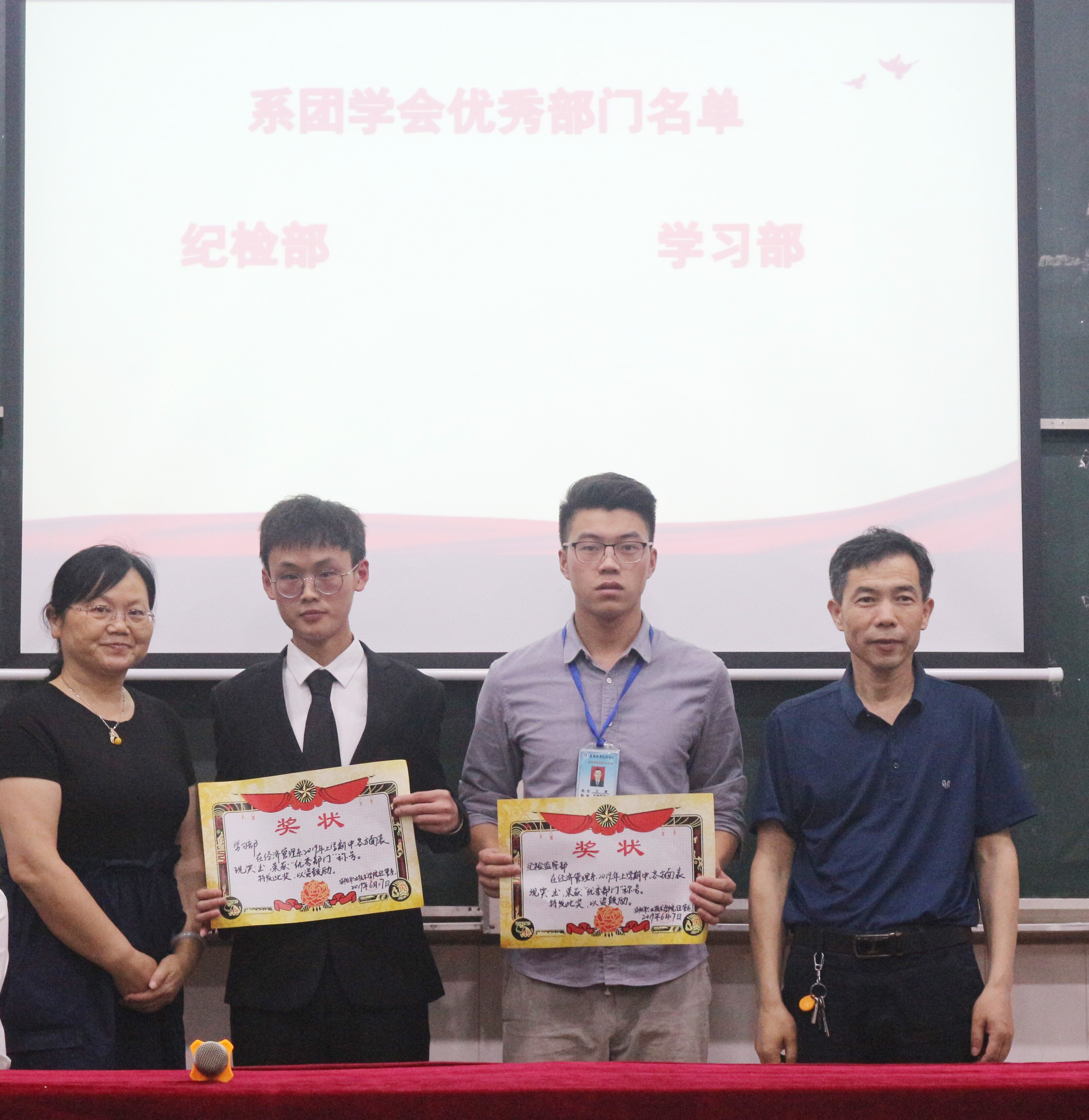 敦品励学,涵养优良学风;明辨笃行,领航青春梦想。6月18日下午两点,我系在二教102会议室举办了期末学生工作总结暨表彰大会。参加此次会议的有:系主任姚子凤老师、主管党建、学生工作的肖建明书记、学工办主任杨芳老师、学生干事黄锦珊老师、各班辅导员老师及全体团学会干部和各班学生代表。本次会议由罗黎同学主持。